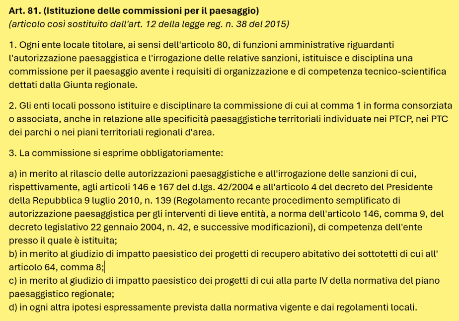 In Lombardia la Legge Regionale n°12/2005 dell’11 marzo “Legge per il governo del territorio“, ha istituito con l’articolo 81, le “Commissioni del Paesaggio”. Articolo che riporto quì di seguito.