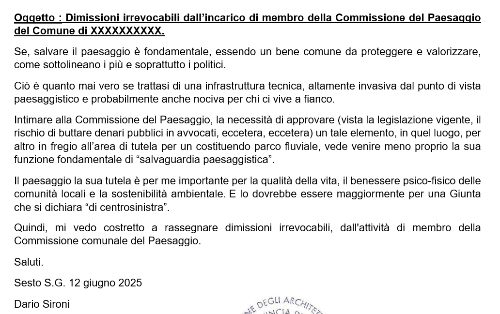 Ennesima lettera, e probabilmente ultima, di dimissioni da organi comunali farlocchi, la cui terminologia nasconde in realtà la volontà opposta DISTRUGGERE IL PAESAGGIO.
