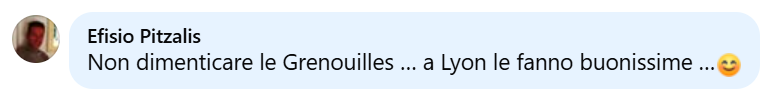 Il noto architetto e docente, con un suggerimento culinario colto, in fregio ad un mio post su FB, citando le “Grenouilles alla Lionese”, si riferisce a rane saltate in padella, tipicamente infarinate ad arte e servite con una salsa a base di burro, aglio e prezzemolo, spesso accompagnate da limone. È una preparazione classica della cucina francese, in particolare della regione di Lione.
