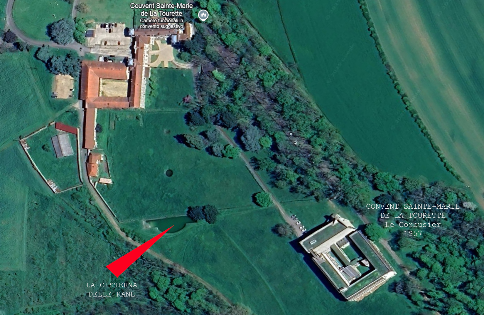 Proprio sotto il Convent de la Tourette, nel piccolo comune di Éveux situato nella zona di L’Arbresle nei pressi di Lione, insiste una grande cisterna per l’acqua, che nei mesi estivi si riempie di rane. Anzi potremmo tranquillamente affermare, che è “infestata” dalle rane. Rane di cui pare, il Reverendo Padre Marie-Alain Couturier, che commissionò a Le Corbusier la costruzione del nuovo Convento, andasse molto ghiotto.