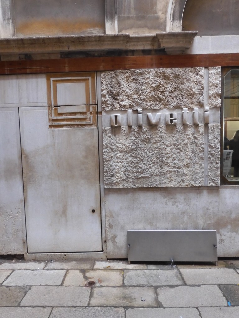 Nell’anno 1956 Carlo Scarpa è insignito del prestigioso premio Olivetti per l’Architettura. In quel periodo l’architetto veneziano era impegnato, oltre agli interventi a Ca’ Foscari, ad alcuni allestimenti espositivi. Carlo Scarpa aveva appena concluso la realizzazione di palazzo Abatellis a Palermo ed il padiglione del Venezuela ai Giardini della Biennale. Soprattutto era impegnato nella conclusione di quel capolavoro di luce che è la Gipsoteca canoviana a Possagno. Nel 1957 Carlo Scarpa viene incaricato, direttamente da Adriano Olivetti, della progettazione del nuovo negozio in piazza San Marco. Olivetti intende realizzare una vetrina per esibire il lavoro della impresa di famiglia in Italia.