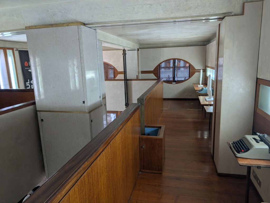 Al piano superiore trovano posto l’esposizione delle macchine da scrivere e di calcolo prodotte dalla Olivetti insieme ad alcuni ambienti d’ufficio, che mostrano la sapiente capacità dell’architetto veneto nell’orchestrare i volumi e gli spazi.