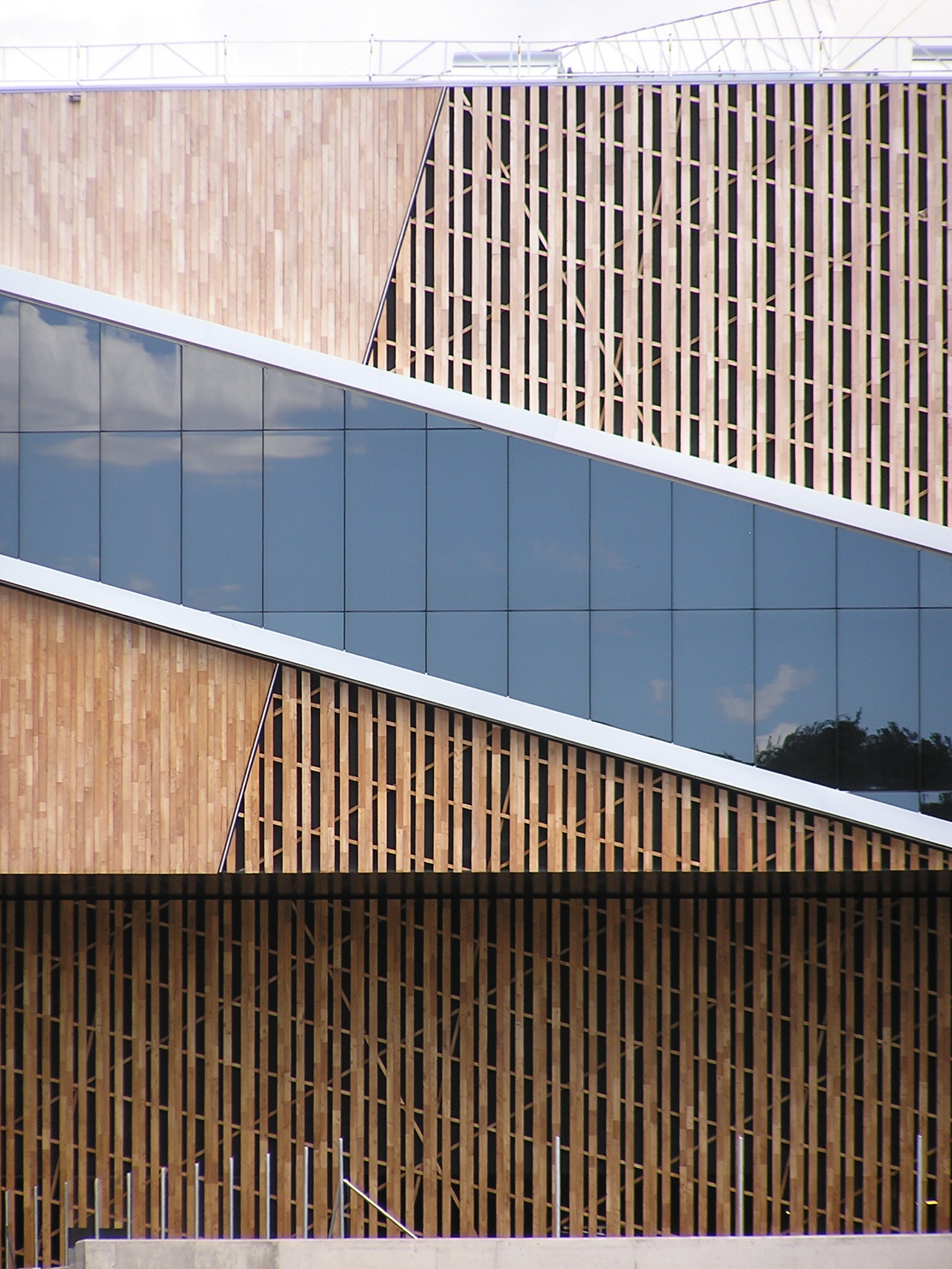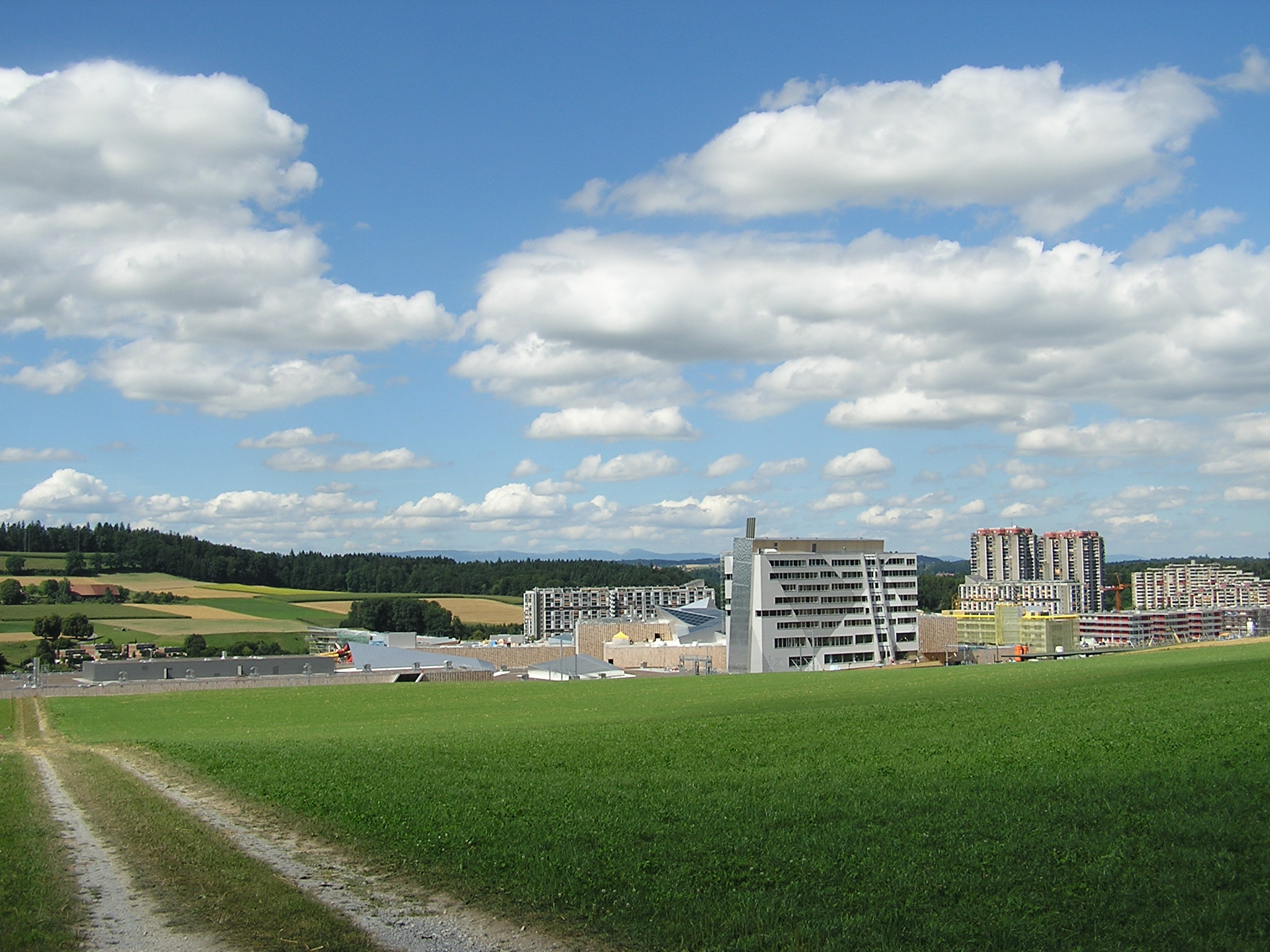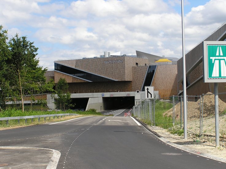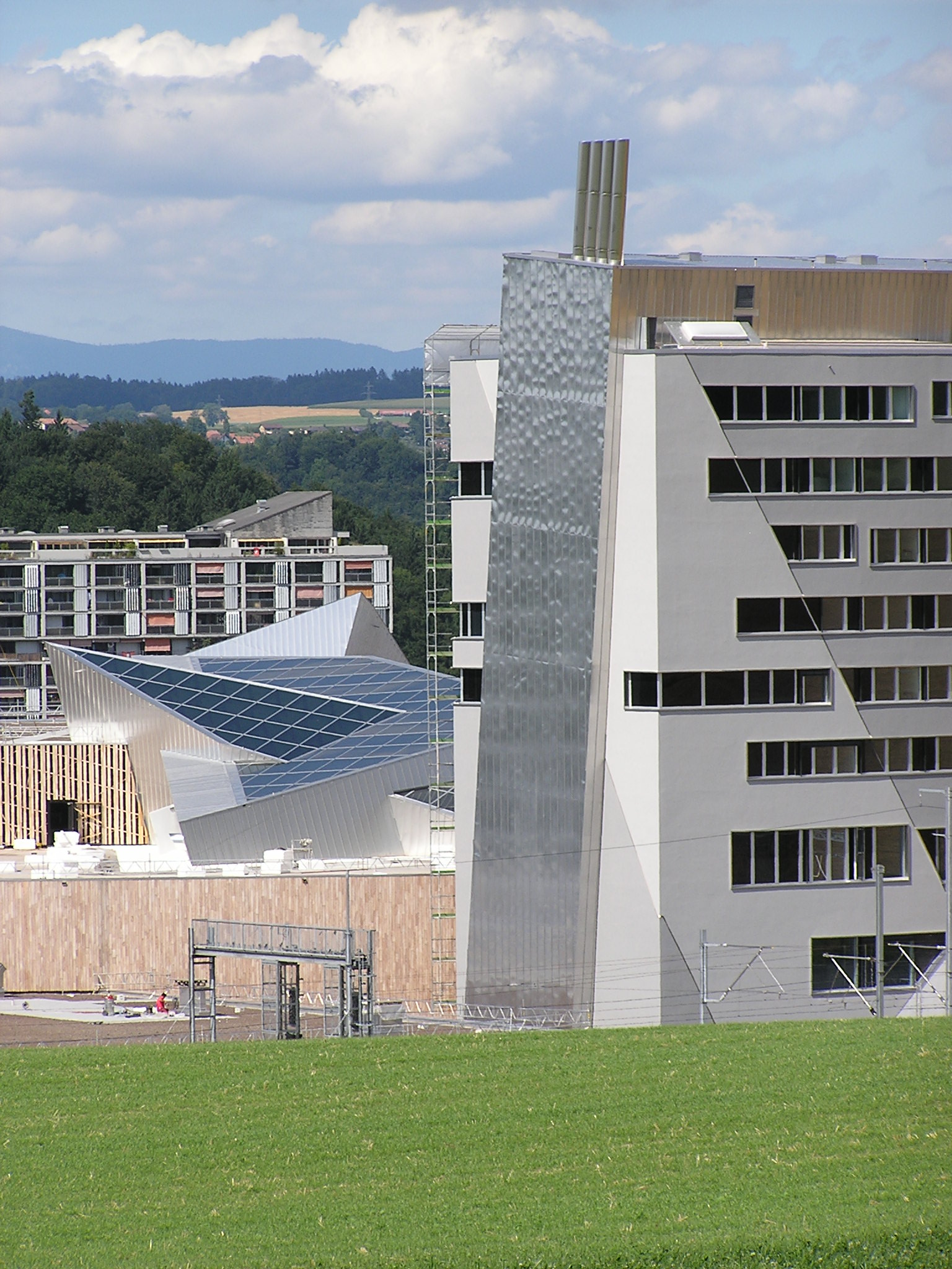 Tutto l’edificio è rivestito, in moltissime parti in legno, le vetrate sono numerose, all’ingresso carraio ad accogliere gli automobilisti, un grande scivolo della piscina interna. Un grande mercato urbano, con attorno punti di soggiorno e residenzialità, una maniera nuova ed innovativa di intendere il centro commerciale. Oggi che il centro “Westside” è stato raggiunto da una linea di tram che conduce direttamente nel centro di Berna, l’edificio, persi quelle tonalità tipiche del legno appena posato, si inserisce in maniera molto brillante nel contesto agricolo bernese.