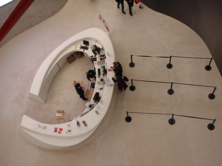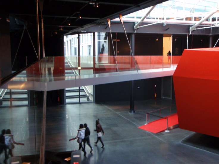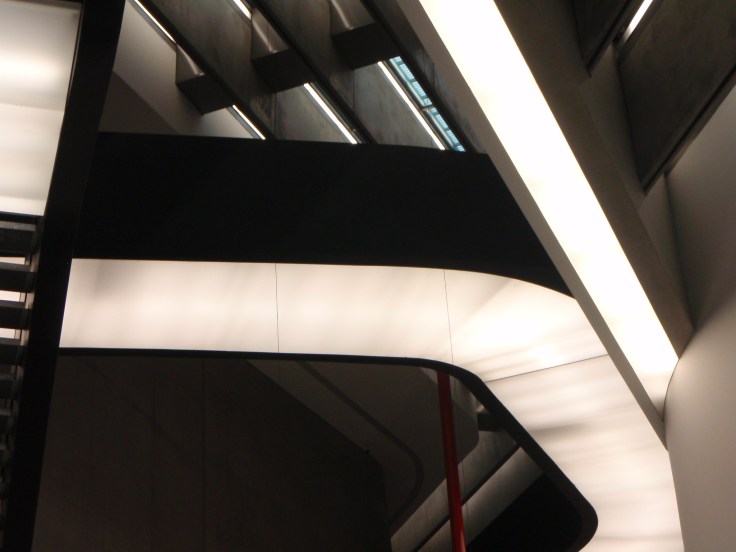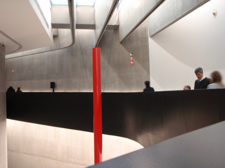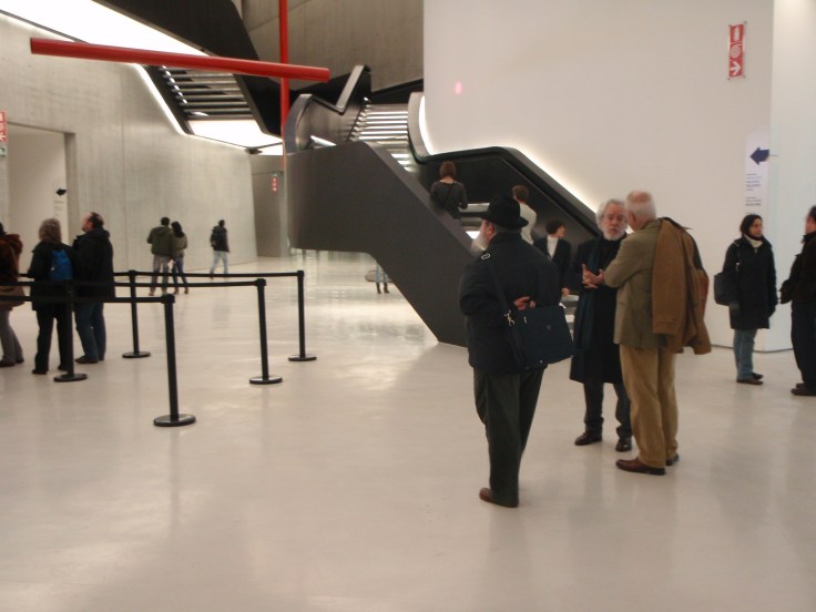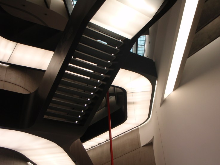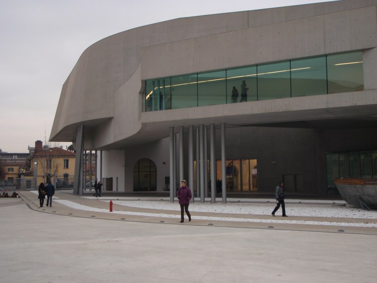 L’architettura del MAXXI, che sulla carta sembrava irrealizzabile, ai più, ora genera un effetto ardito e dirompente. La spazialità è fluida, si potrebbe affermare “liquida”, degna della società descritta da Baumann. Un’architettura da vivere sul posto, più che da raccontare: le categorie canoniche d’interpretazione dell’architettura sembrano termini appartenenti al passato. Sale, stanze espositive, auditorium, laboratori, depositi, ecc., dedicati all’arte contemporanea nel suo insieme : architettura, fotografia, scultura, pittura, videoart, ecc.. Vedute, visuali, scorci inusuali, aperture, connessioni, disequilibri, si alternano attraverso una sorprendente articolazione spaziale, dove non esiste più una cesura tra interno ed esterno. Un altri enorme, alto più di 20 metri, con pochissimi pilastri, banconi/reception in Corian, gettato in opera, scale ardite auto-portanti, tutto sembra orchestrato per stupire. I costi lievitati da 50 milioni di euro, ad oltre 132 milioni di euro. L’idea del Maxxi nasce nel 1998 con il trasferimento delle ex caserme Montello al Mibac. Nel 2000 lo studio Zaha Hadid si aggiudica il concorso per il progetto. Nel 2003 iniziano le demolizioni e la costruzione dell’opera ad opera dell’Ati Maxxi 2006 (Italiana costruzioni e Sac). L’opera è stata costruita su un lotto di 29mila metri. Gli spazi esterni sono di 19.640 metri (oggi oggetto di interventi di land-art ed istallazioni provvisorie d’arte. La superficie espositiva complessiva è di oltre 10mila metri quadrati.