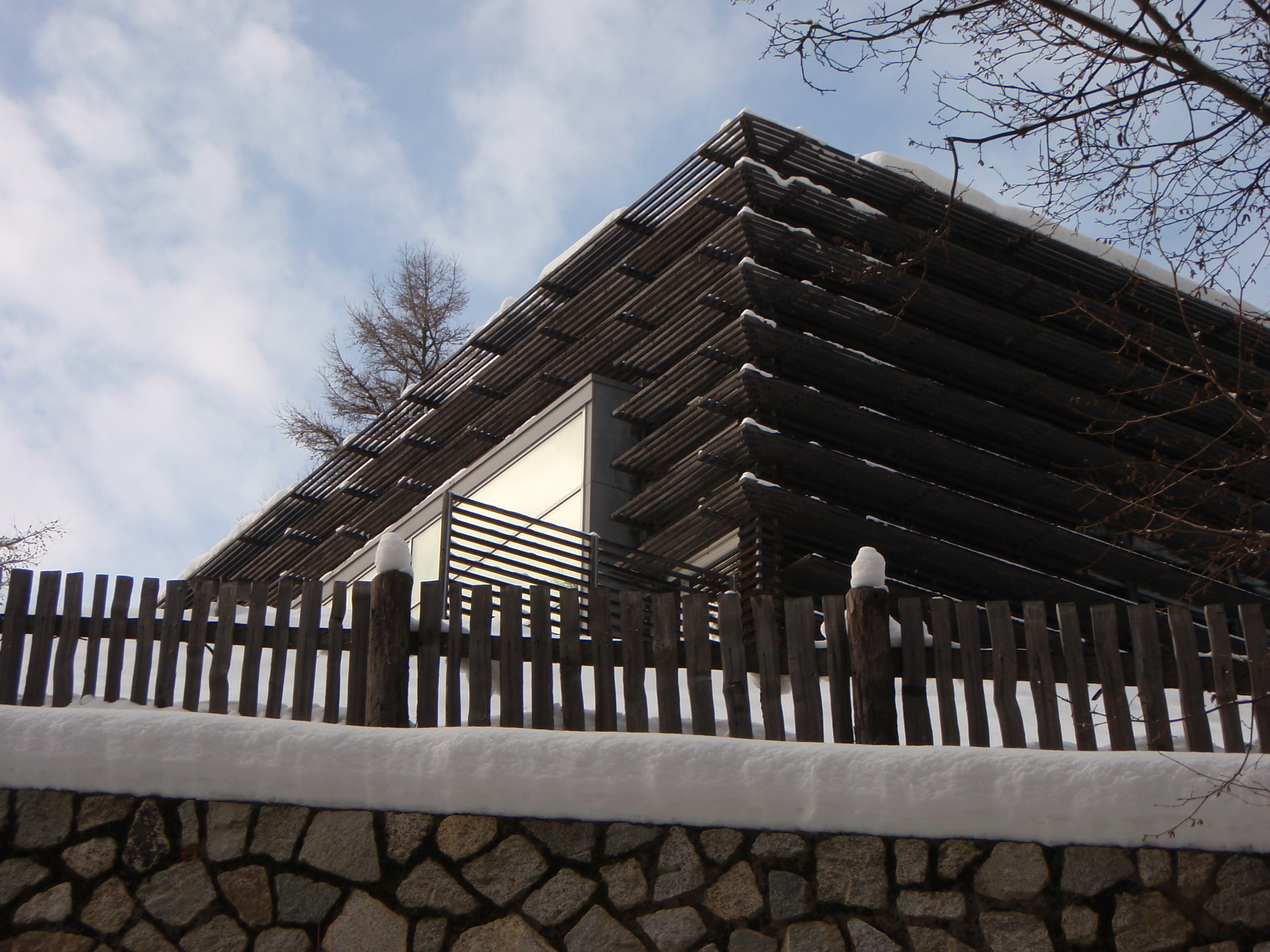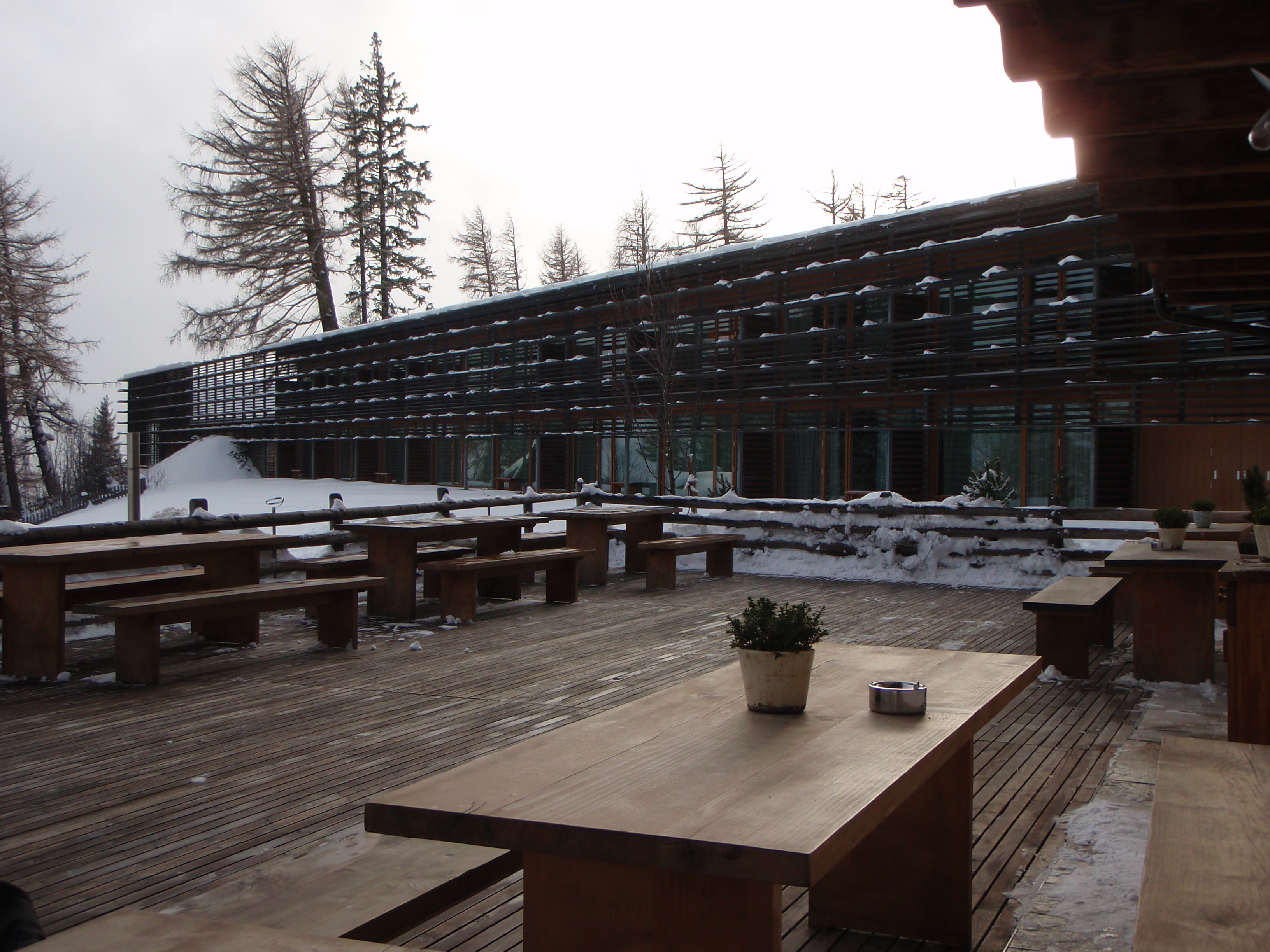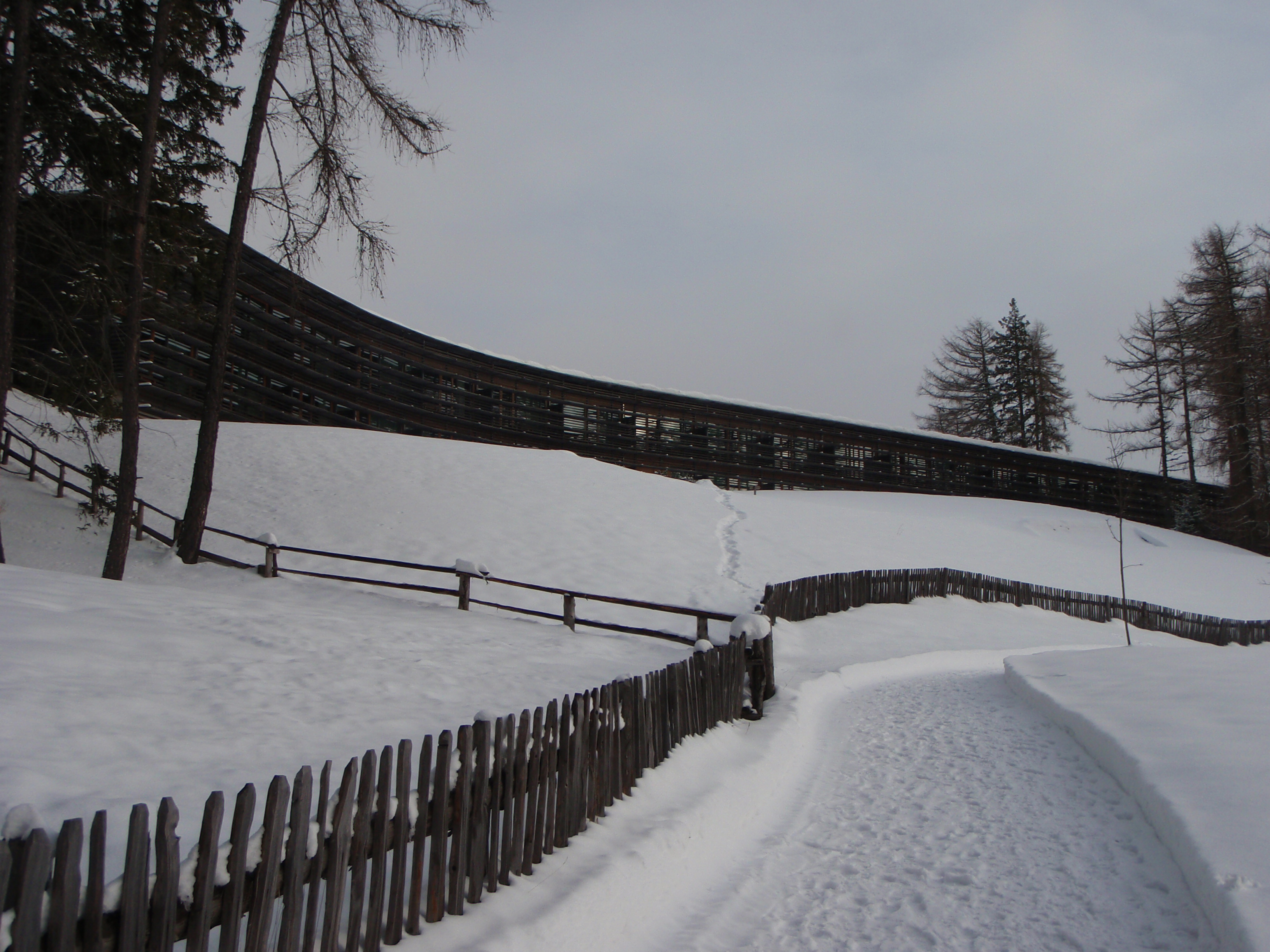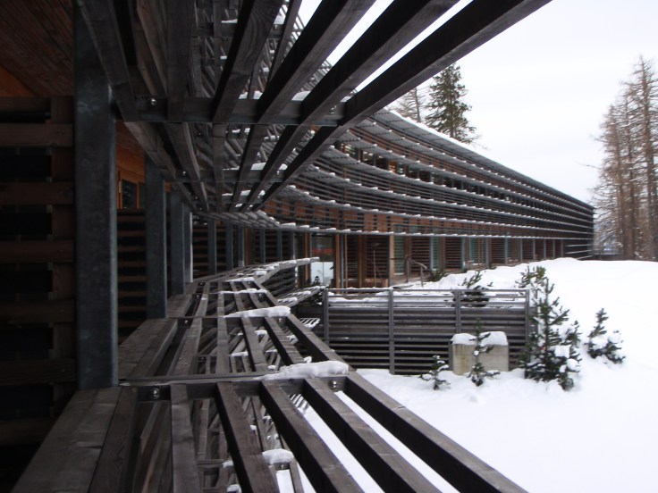Quì si trova un Hotel, un prestigioso Resort di montagna, realizzato nel 2003 con legno di larice, argilla naturale, vetro ad altissima prestazione, esso si adagia con la sua planimetria a forma di “Y” su un pendio orientato est-ovest. L’edificio, che ha solamente gli interrati in cemento armato, si “confonde”, si “incastra con antica sapienza” nel paesaggio boscoso, pur essendo una complessa e sofisticata “macchina per abitare” da 14000 mq (costo 20 milioni di euro); un oggetto di design moderno ed ardito, dove il lusso, entra in simbiosi intima con il paesaggio ameno dell’intorno. Un edificio ad altissima prestazione, certificato da Casaclima, rispettoso dell’intorno, dove edilizia, benessere e sostenibilità possono essere coniugate assieme.