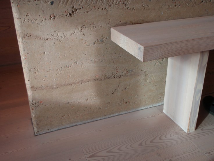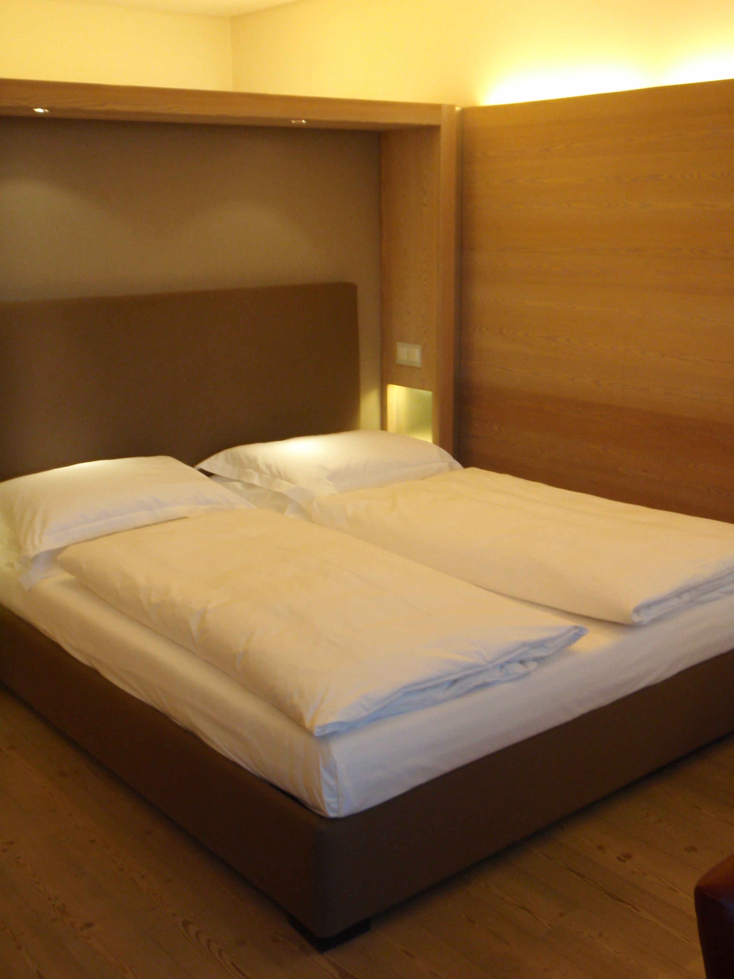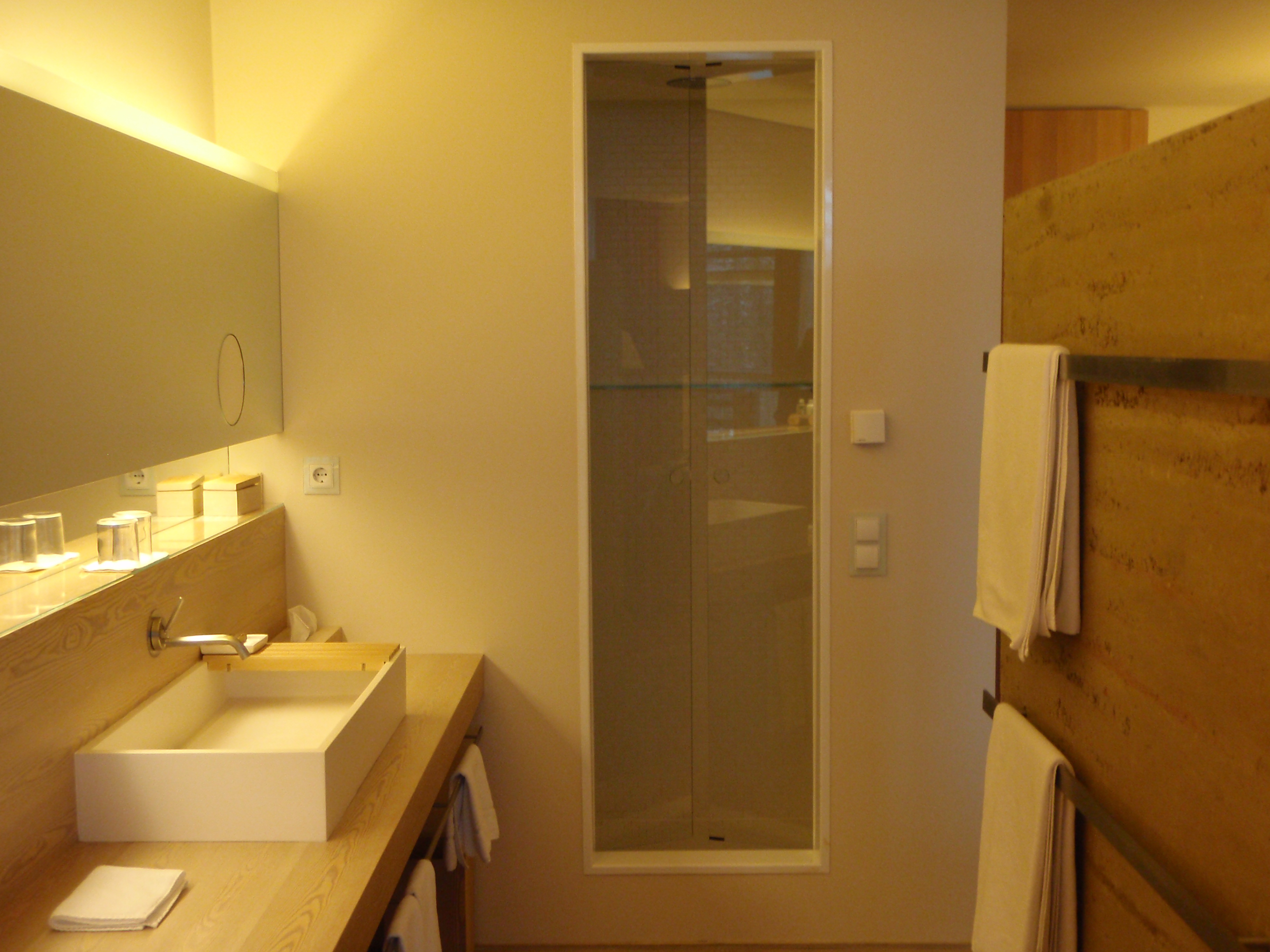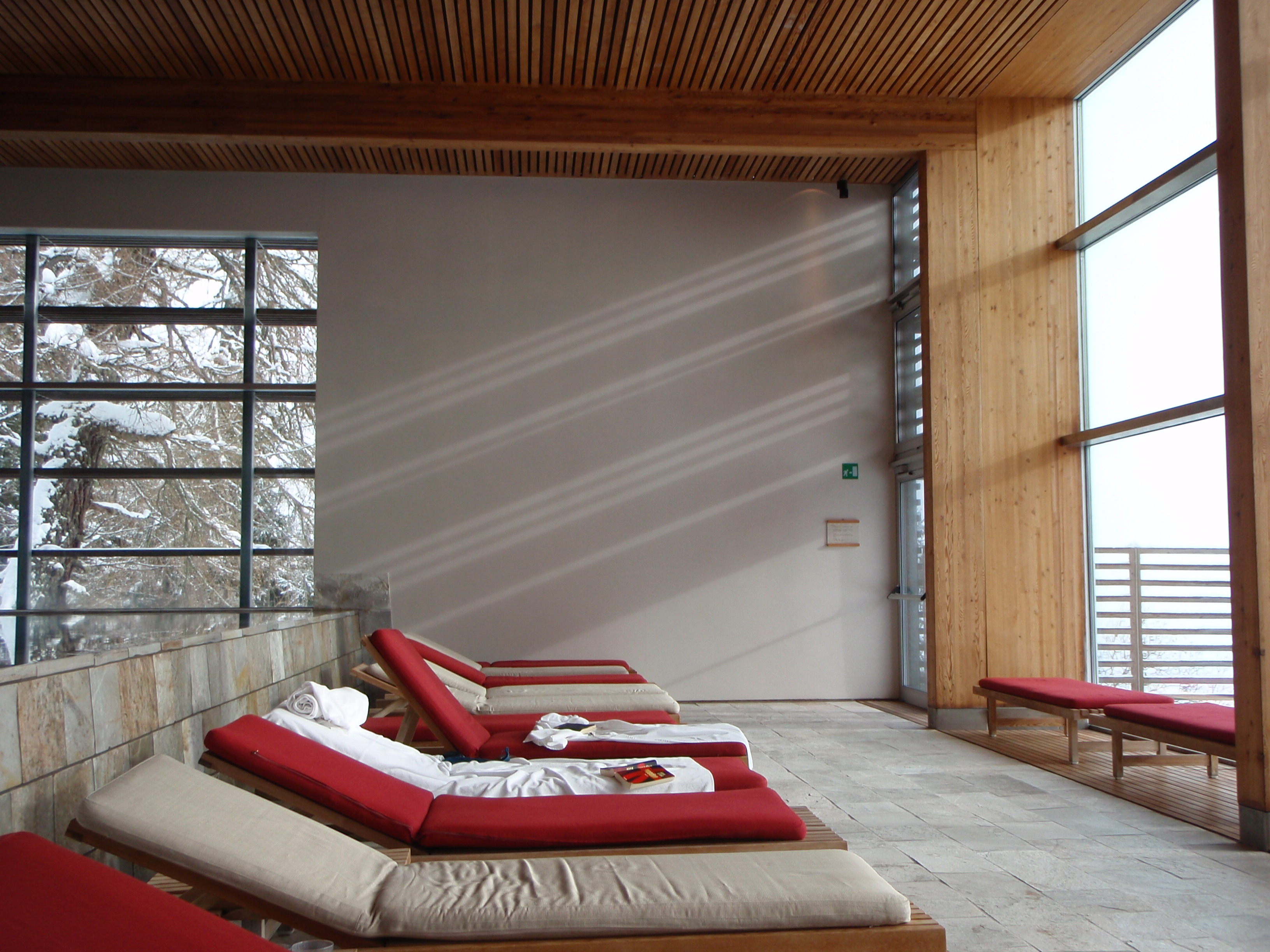 Le camere sono tutte orientate ad est o ad ovest. Le terme, che sfruttano le proprietà terapeutiche della sorgente del Monte San Vigilio, sono su due piani ed orientate a sud. Molti gli spazi collettivi : la biblioteca, il soggiorno (unico ambiente con la televisione, assente in ogni camera), la sala del caminetto. Nelle 40 camere (da 36 mq cadauna) e 6 suite, spesse pareti di argilla naturale “battuta” dividono la zona notte dal bagno e fungono da accumulatori che restituiscono calore in inverno e fresco d’estate. Il grande tetto piano “verde”, evita il surriscaldamento estivo e migliora la coibenza invernale, mentre imponenti vetrate sfruttano l’energia solare. Lamelle lignee (di larice) in facciata, modulano il rapporto tra luce ed ombra. Il tutto è dominato da un’esecuzione “minimalista” dei dettagli, mentre la ventilazione è controllata da un sofisticato impianto elettronico che consente il recupero del calore, coadiuvato dall’uso di pannelli radianti. Il riscaldamento è a biomassa con scambiatore geotermico, viene così garantito un beneficio per tutta l’economia boschiva del Monte, che produce oltre al legname tradizionale, dei legni di bassa qualità da utilizzarsi quali fonti energetiche in forma di “cippato”.