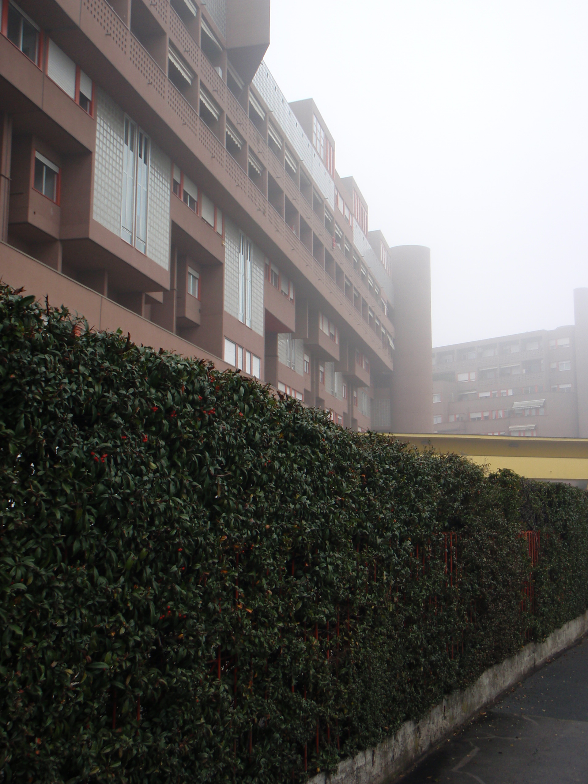 La prima volta che andai al complesso Monte Amiata al quartiere Gallaratese di Milano, la nebbia fitta, sanava così l’isolamento ed il degrado in cui questo edificio insisteva. L’atmosfera era quella tipica dei racconti di Sir Arthur Conan Doyle, e chi si aggirava allora per il “Galla” rischiava anche la vita. Spesso i residenti venivano aspettati al ritorno dal lavoro “a Milano”, alla stazione di Lampugnano della Metropolitana (che galleggiava nel nulla) e quì, nella fitta nebbia serale, accompagnati da malintenzionati, sotto la minaccia di pistole, sino alla loro abitazione, che una volta aperta veniva accuratamente svaligiata. Ti andava bene se portavi a casa la vita. Era l’inizio degli anni ottanta, ed io giovane studente di architettura ero “stato mandato” a studiare, in loco, questo enorme complesso, da alcuni docenti del Politecnico di Milano (di cui non farò i nomi). Il complesso era allora incensato, come un esempio dell’architettura residenziale di scuola italiana. La cosa che di più mi colpì, e che ancora oggi ricordo, è stata la violenza con cui i residenti accolsero la mia visita. Tutti coloro che incontrai, evidenziarono, portandomici, l’assurdità di alcuni spazi interni e degli spazi esterni, la pochezza di soluzioni tecniche che palesavano già allora, a soli 10 anni dal termine dei lavori : infiltrazioni, perdite, crepe, ecc.. Non vi sto a raccontare gli insulti a carico dei progettisti e degli architetti in genere, che raccolsi allora. I residenti soprattutto non capivano l’assurdità dell’esperimento sociale imposto da un’architettura dai lunghissimi ballatoi, che rendevano “introvabile” qualunque appartamento. Eppure ancora oggi la nebbia diventa parte integrante ed indispensabile di questo complesso, ormai elemento integrante del quartiere Gallaratese (totalmente completato); quasi essa fosse un “elemento” architettonico indispensabile, che addolcisce i contorni e le volumetrie assurde, nonchè le tragiche e metafisiche ripetitività, che poco hanno a che fare con la vita degli esseri umani. Dobbiamo ad interventi come questo del Gallaratese, la definitiva sconfitta dell’architettura moderna in Italia, che non è mai diventata un’opzione veramente praticabile, lasciando così il passo ad una visione dell’architettura e del paesaggio italiano, assolutamente idealizzata e falsa, incapace di proporsi quale elemento “reale” di continuità tra la “memoria del passato” ed il futuro. Infatti anche le architetture contemporanee del Gallaratese, come ad esempio il social housing del gruppo MAB Arquitectura, palesano, pur in una spazialità volumetrica diversa ed accattivante, soprattutto negli spazi esterni, la necessità di un confronto con la “nebbia architettonica” che pervade il nostro paese e soprattutto Milano. L’Olanda è ancora moooooooooooooooolo lontana e forse ormai irragiungibile.