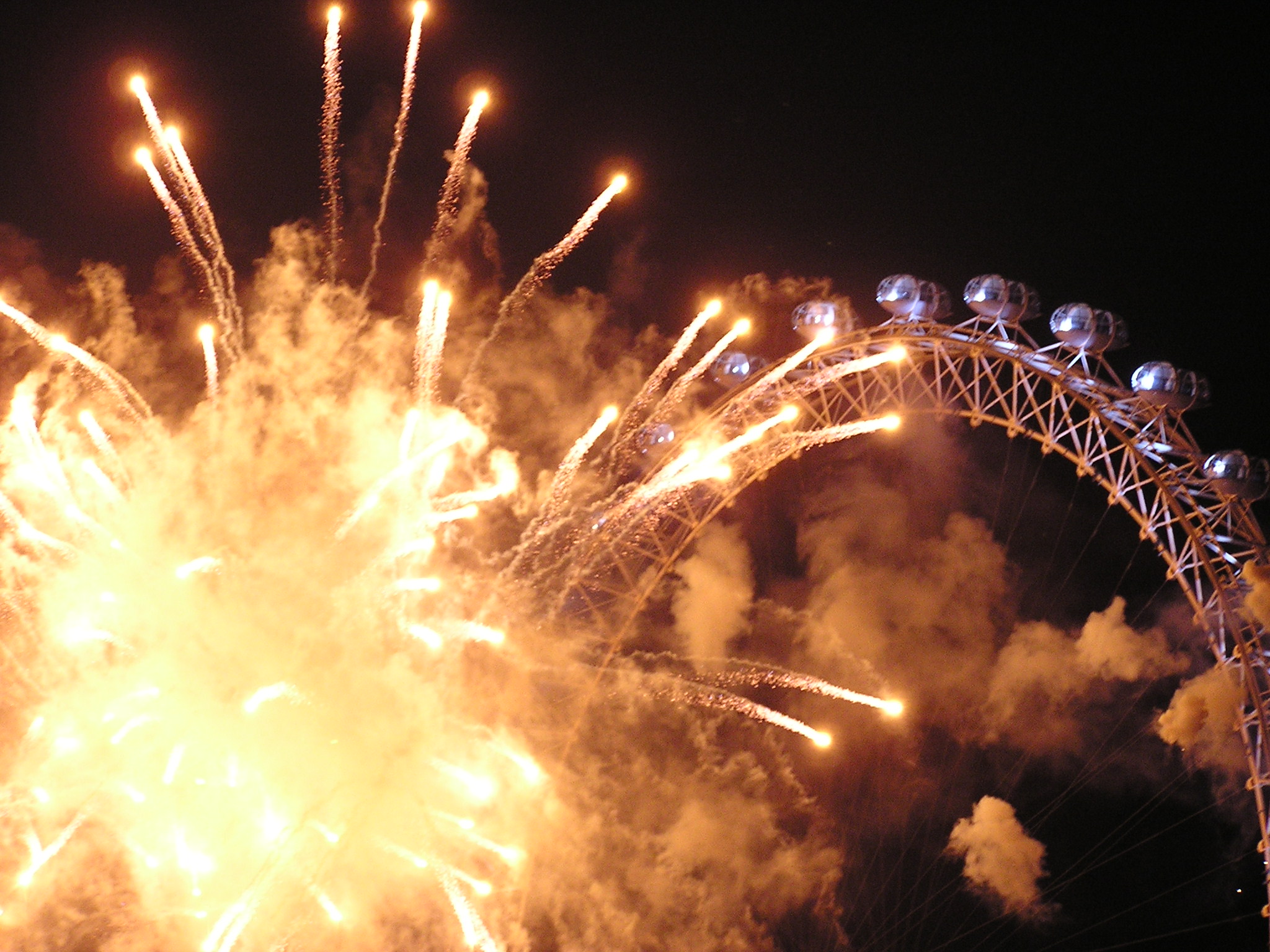Molti sostengono che quelli di Londra siano i fuochi d’artificio più belli d’Europa. Lo spettacolo pirotecnico dei fuochi d’artificio della notte di Capodanno a Londra si svolge lungo il Tamigi, all’incirca tra Westminster e il Tower Bridge, l’epicentro però è la grande ruota per osservare il paesaggio urbano “The London Eye” da cui vengono anche sparati migliaia di fuochi artificiali coloratissimi. La London Eye è il risultato dell’idea progettuale del team di architetti David Marks e Julia Barfield, marito e moglie, due paesaggisti. Il design della ruota fu proposto come metafora per simboleggiare il passaggio del secolo; doveva essere provvisoria, ma visto il successo è diventata una struttura permanente. La London Eye si trova sulla riva sud del Tamigi alla fine di Westminister Bridge e s’innalza per 135 metri, ci sono “appese” 32 navicelle che possono contenere fino a 25 persone ciascuna. Visitano la London Eye 3 milioni e mezzo di persone l’anno. Per osservare i fuochi artificiali e “l’incendio della grande ruota”, eventi tipici del “fine anno” londinese, il South Bank è il luogo ideale, ed è sicuramente uno dei luoghi, più spettacolari ed affollati del Mondo. La gente inizia a congestionare le strade dell’intorno sin dalle 15,00 per garantirsi un buon punto di vista, ed ovviamente inizia a bere. Lo spettacolo della Southbank illuminata dai lapilli colorati dietro al Big Ben, valgono l’immane fatica e l’attesa della mezzanotte al freddo londinese, che “ti entra nelle ossa”. Comunque musica e divertimento non vengono fatti mancare a nessuno, come l’immancabile countdown di mezzanotte. Prendere un posto sulla Southbank non è assolutamente facile, deve essere conquistato. Una valida alternativa per godersi lo spettacolo pirotecnico potrebbe essere quella di posizionarsi all’Hampstead Heath, con vista panoramica di tutta la città. Quindi, non ascoltate il richiamo “popolare” del Southbanks ed invece dirigetevi verso nord, verso Hampstead Heath, lì si avrà una meravigliosa, e completamente gratuita, vista panoramica su tutta la città ed i suoi meravigliosi fuochi d’artificio. Pochissimi, a Londra, sparano fuochi artificiali o botti individualmente, a casa loro, ormai solamente i cinesi, i fuochi artificiali in Inghilterra, sono un grande rito collettivo. Ci sarà probabilmente un perchè, in merito a questo rito notturno dello sparo dei fuochi artificiali, che tanto affascina la specie umana, tanto da non farseli mancare ad ogni occasione importante. Forse è un esorcismo del tempo che passa, della notte, del buio. Certamente ormai da alcuni anni, anche l’architettura è diventata parte di questo rito collettivo, infatti sempre più spesso, le location per “sparare” i fuochi artificiali, sono delle architetture.
