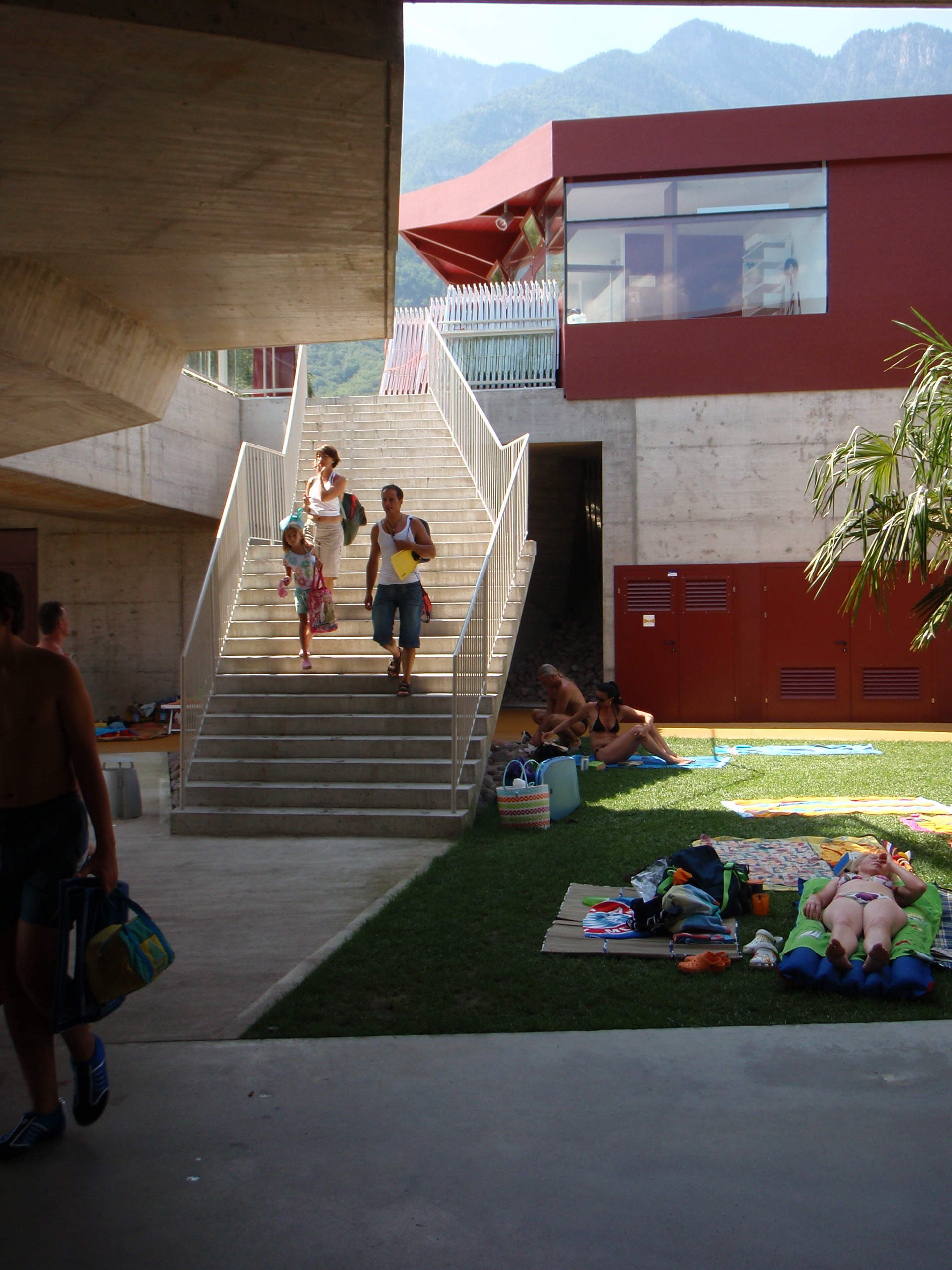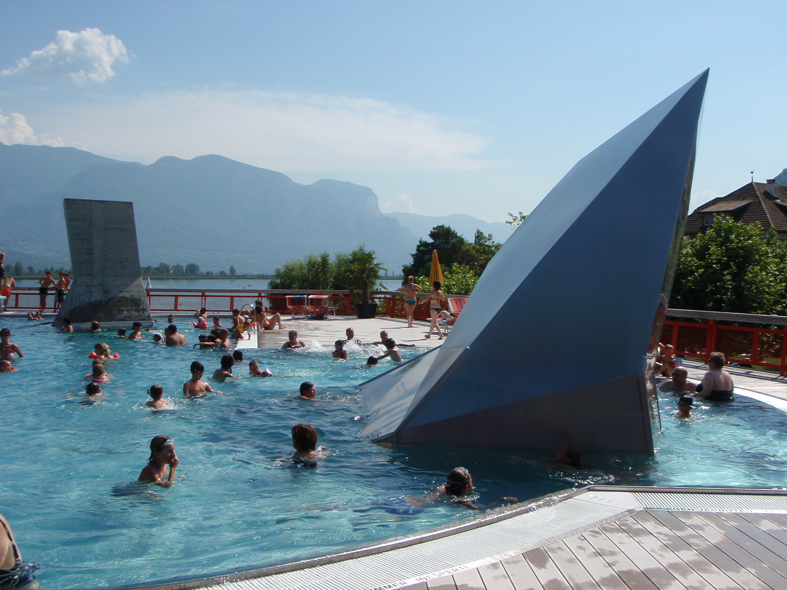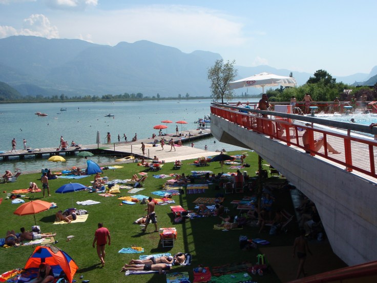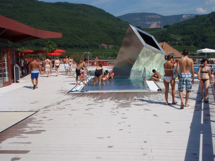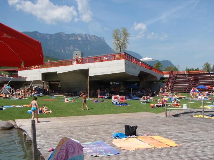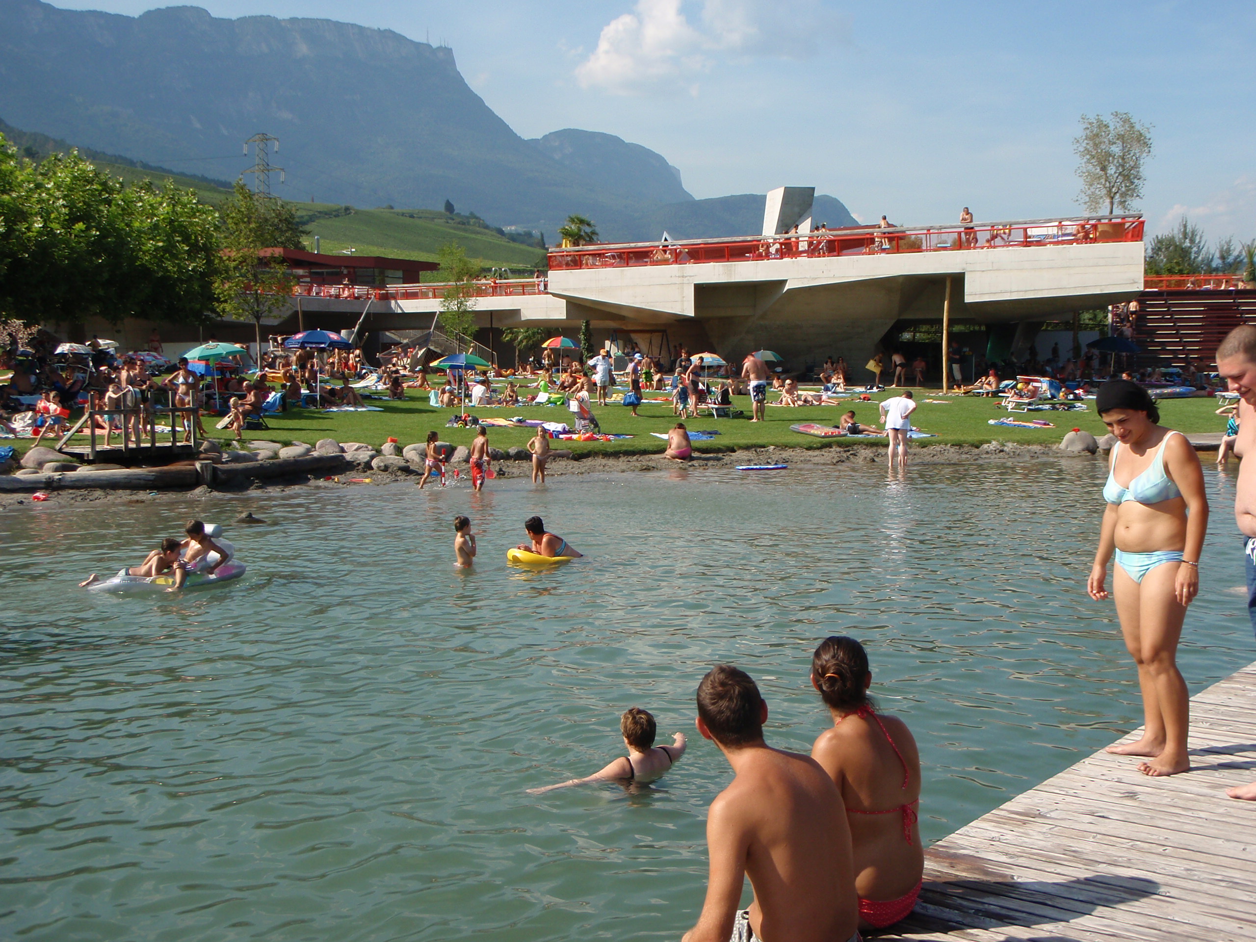 Lo studio viennese the next ENTERprise architects (http://www.austria-architects.com/de/thenextenterprise), ha creato nel 2006 a Caldaro (Bz), una piscina pubblica con una struttura dalla linea sublime, molto raffinata e “filante”. La eccezionalitá della struttura é che si trova in posizione rialzata rispetto al lago di Caldaro, per cui chi nuota nella piscina, o prende il sole, ha una vista magnifica sul paesaggio circostante. E’ di fatto un apparato per la cura elioterapica, nuotare e contemplare il paesaggio. Alla piscina con solarium (ed anche un piccolo ma fornitissimo bar/enoteca), posta al piano primo, si antepone, sotto, la zona relax e spogliatoi, più in penombra, dominata da “stanze” con getti d’acqua e grandi lucernari che captano la luce attraverso l’acqua della piscina soprastante. Infine c’è il grande parterre verde, che fa da “antefatto” alle acque del lago. Attorno vigne e meleti.