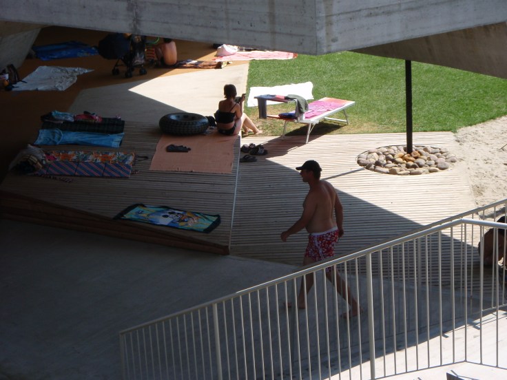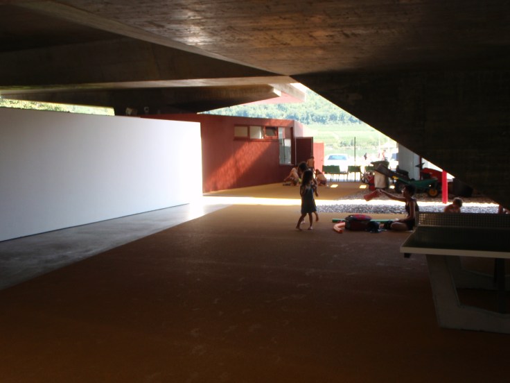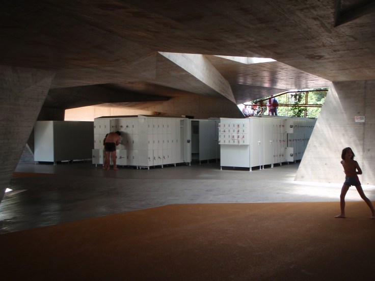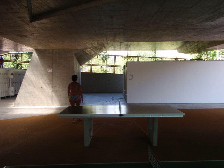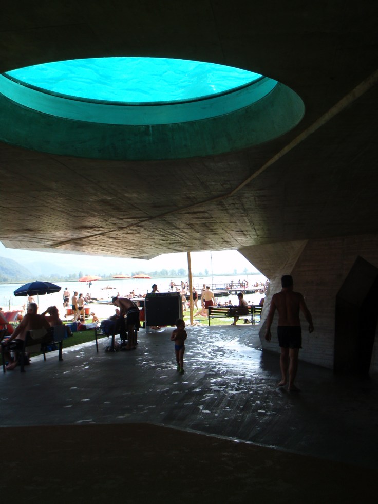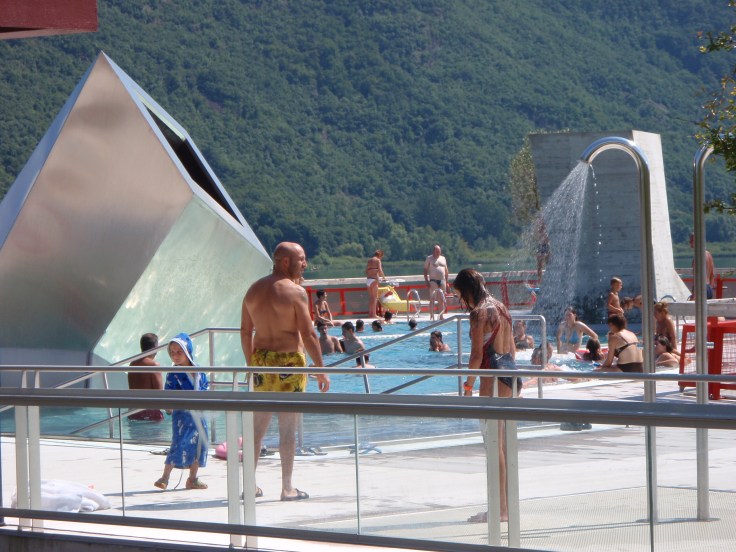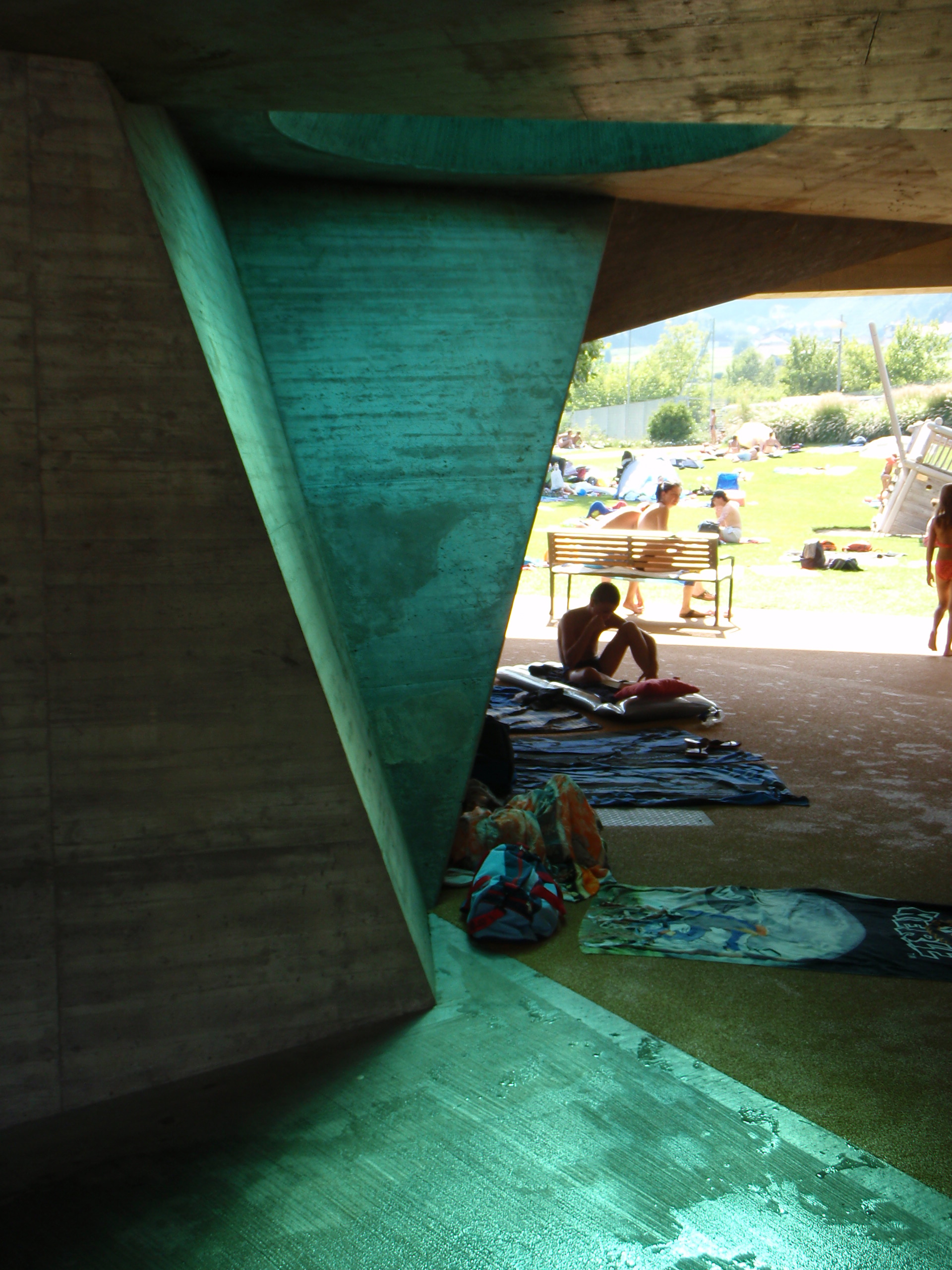 Lo studio viennese the next ENTERprise architects (http://www.austria-architects.com/de/thenextenterprise), ha creato nel 2006 a Caldaro (Bz), una piscina pubblica con una struttura dalla linea sublime, molto raffinata e “filante”. La eccezionalitá della struttura é che si trova in posizione rialzata rispetto al lago di Caldaro, per cui chi nuota nella piscina, o prende il sole, ha una vista magnifica sul paesaggio circostante. E’ di fatto un apparato per la cura elioterapica, nuotare e contemplare il paesaggio. Alla piscina con solarium (ed anche un piccolo ma fornitissimo bar/enoteca), posta al piano primo, si antepone, sotto, la zona relax e spogliatoi, più in penombra, dominata da “stanze” con getti d’acqua e grandi lucernari che captano la luce attraverso l’acqua della piscina soprastante. Infine c’è il grande parterre verde, che fa da “antefatto” alle acque del lago. Attorno vigne e meleti.