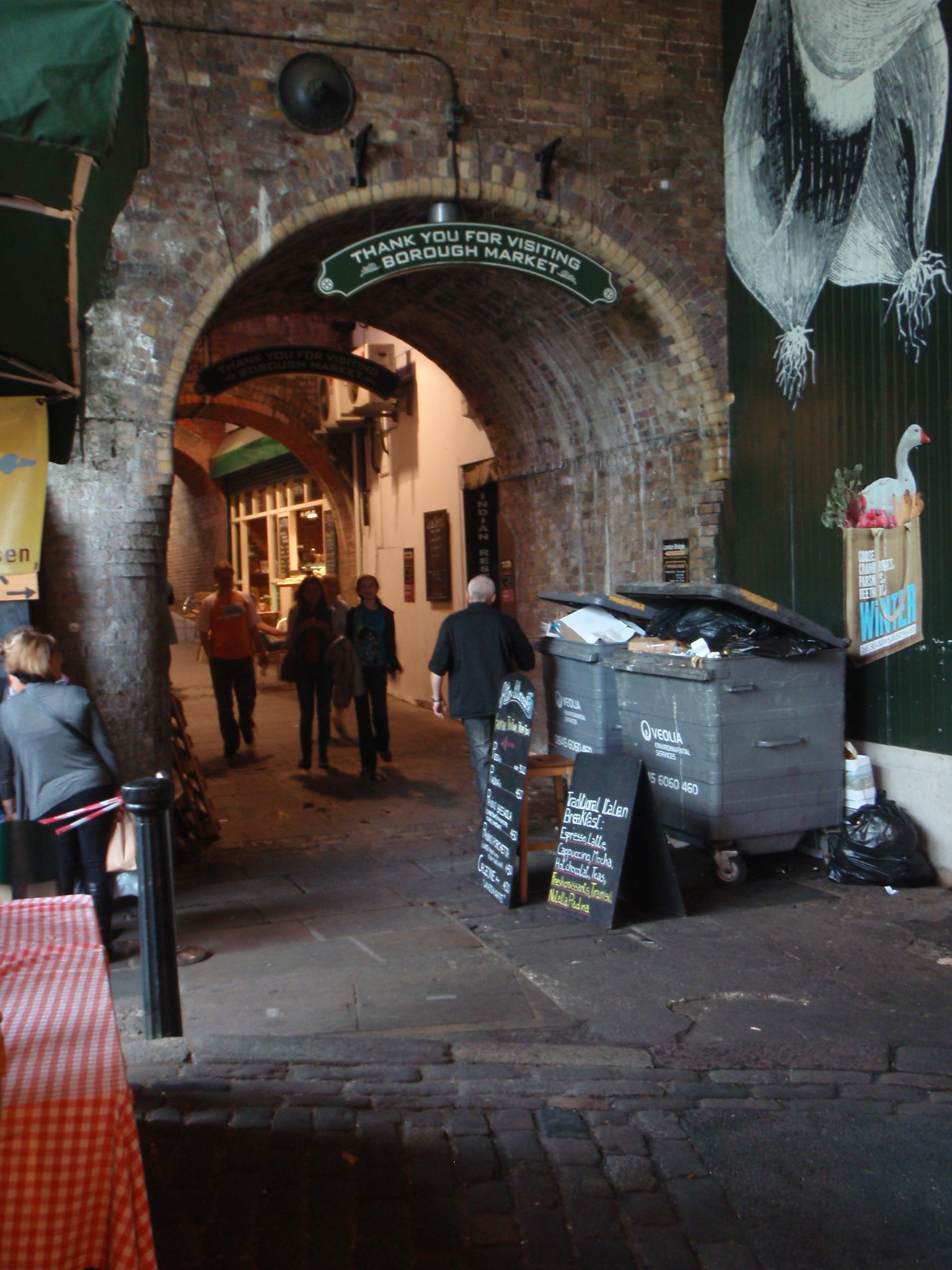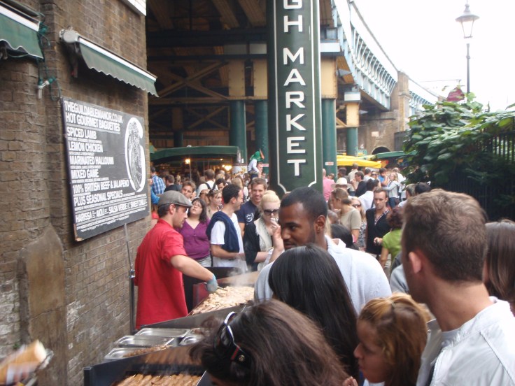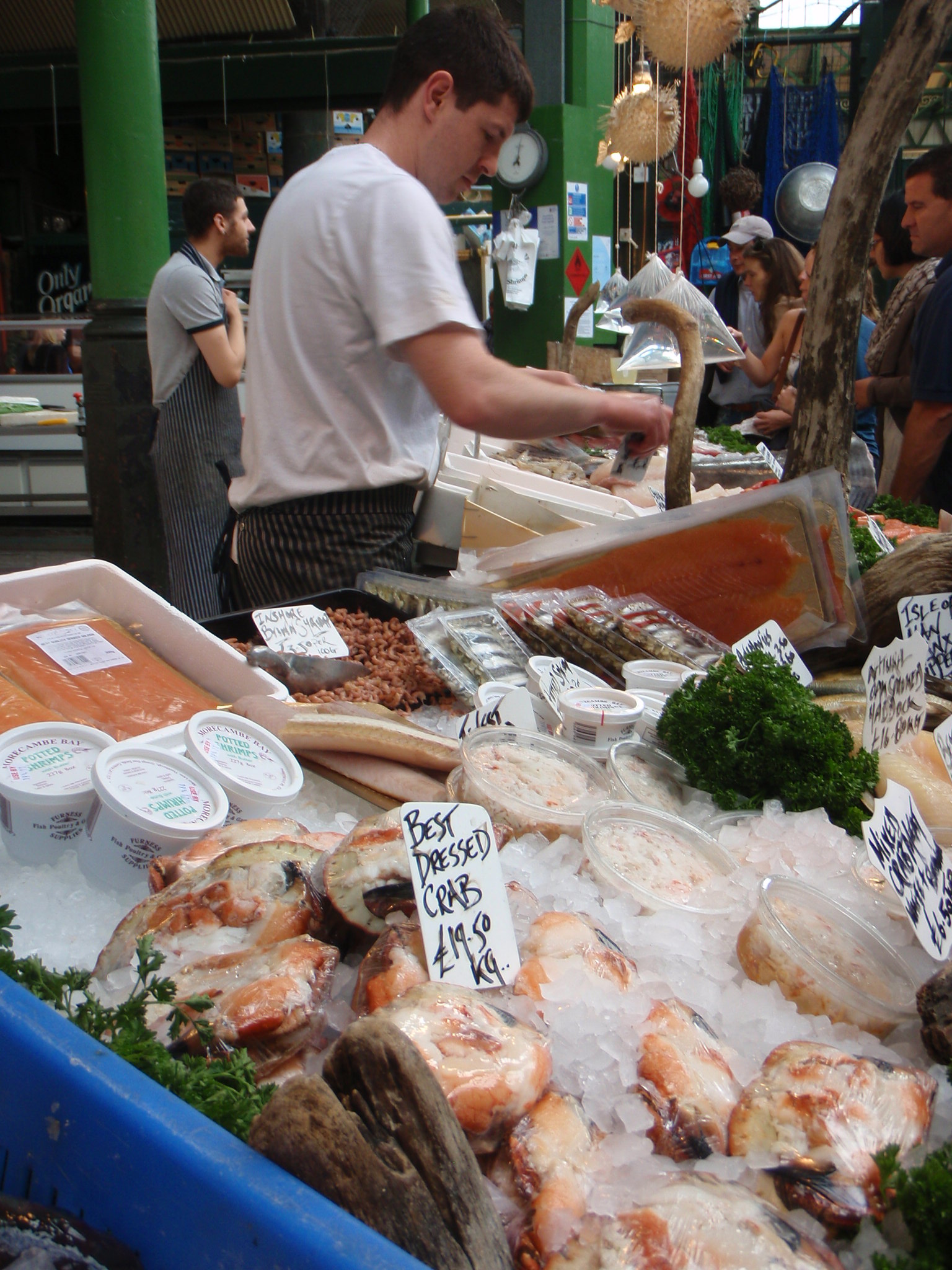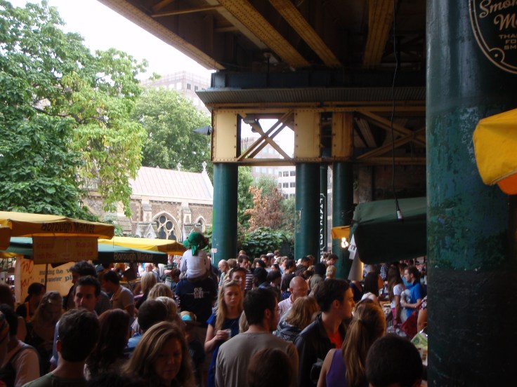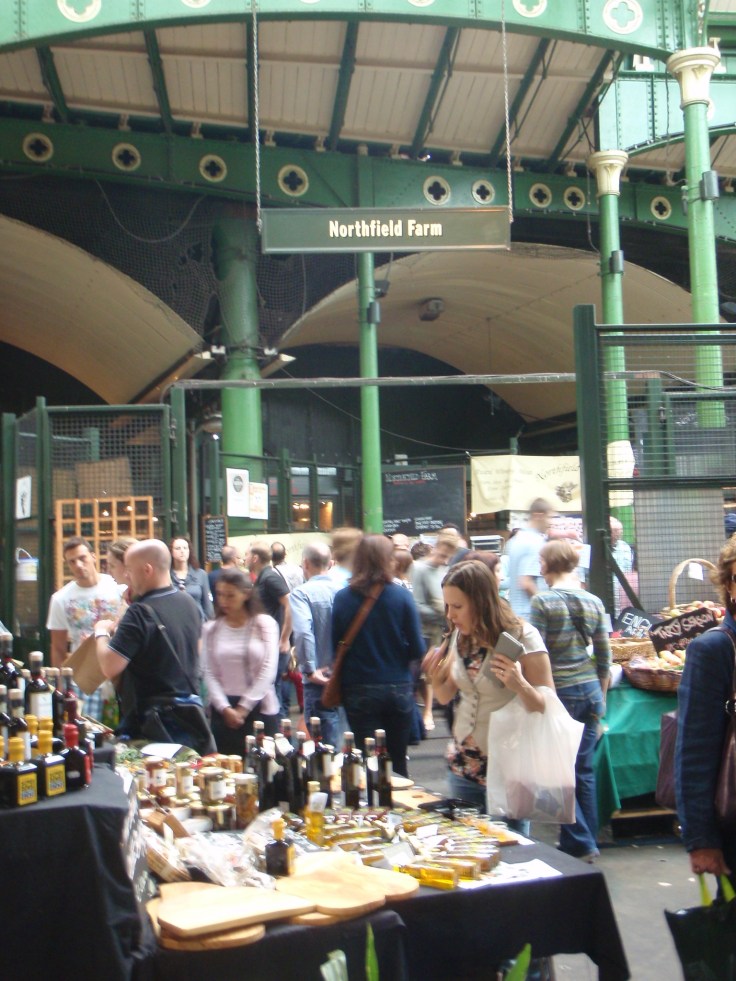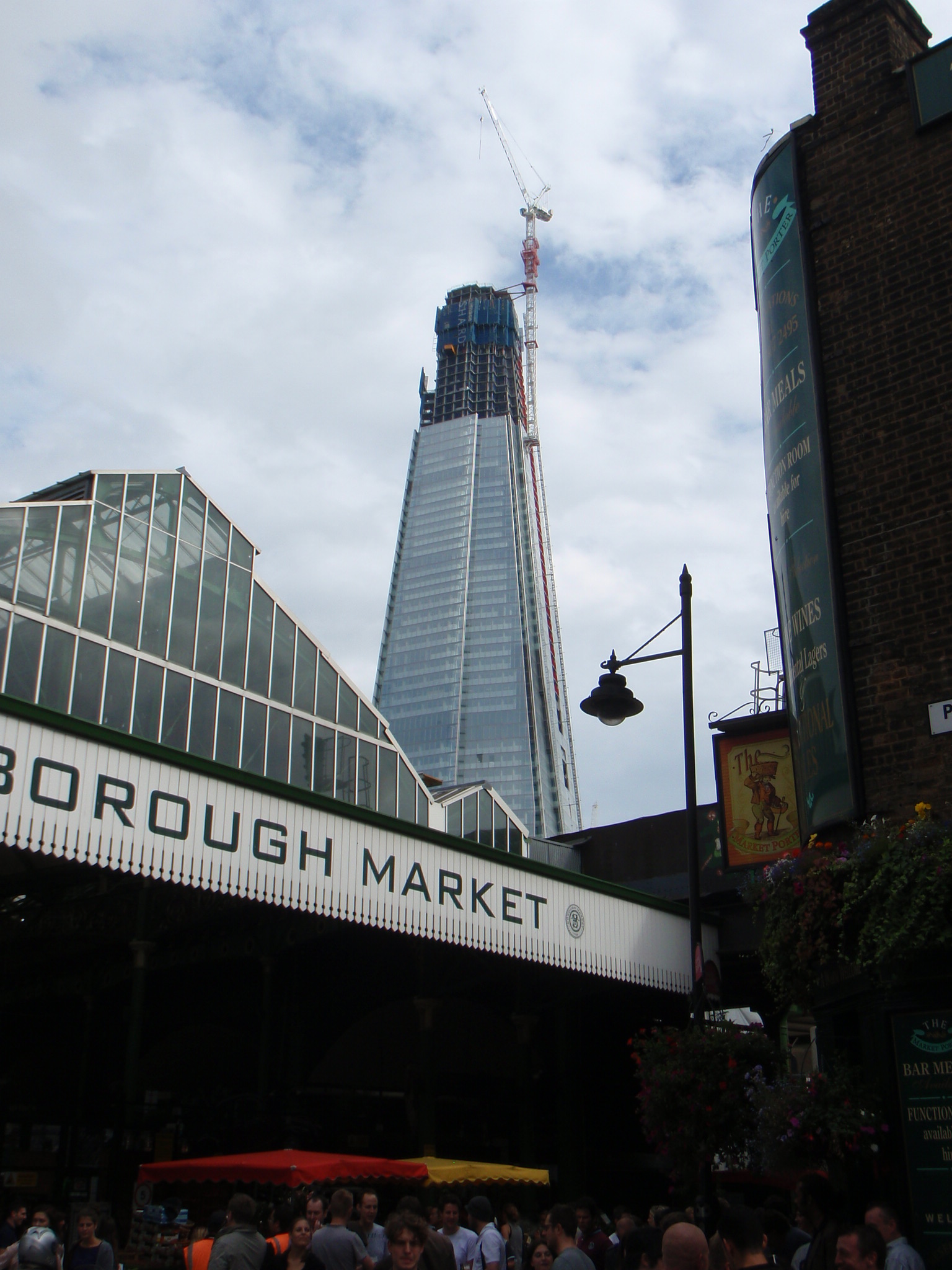 Borough Market (solo il giovedì, il venerdì ed il sabato), vicino a London Bridge, è il mercato alimentare “a chilometri zero” più famoso di Londra, un luogo ad alta concentrazione di produzione britannica ed internazionale. In questo mercato non ci sono rivenditori, ma solamente produttori, che direttamente vendono quello che producono. E’ un luogo magico, un “suk” dove si trova di tutto, dove si gusta di tutto. La storia rivela che del Borough Market, si rintracciano scritti risalenti al 1276, ma già nel 43 a.C. l’area del Southwark Fair Market ospitava contrattazioni di prodotti locali. Oggi oltre 70 banchi, offrono prodotti tipici britannici di altissima qualità. Una vera e propria libidine. E poi c’è la gente, i turisti, una bolgia umana, che inghiotte qualunque cosa, sdraiandosi ovunque. Una città provvisoria, che rinasce ogni settimana sotto le coperture vitree sostenute da pilastri in ghisa in stile vittoriano. Una architettura delle superfetazioni, che si dipana anche sotto ai fasci sopraelevati dei binari della metropolitana, non molto distante dall’erigendo grattacielo “The Shard” a firma di Renzo Piano.