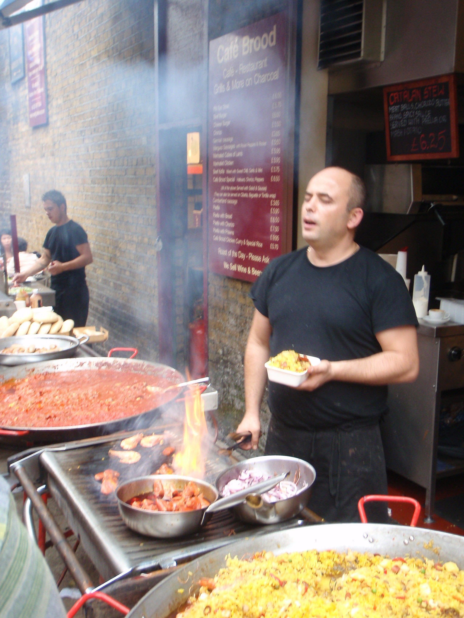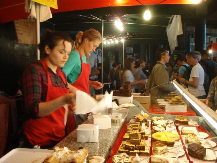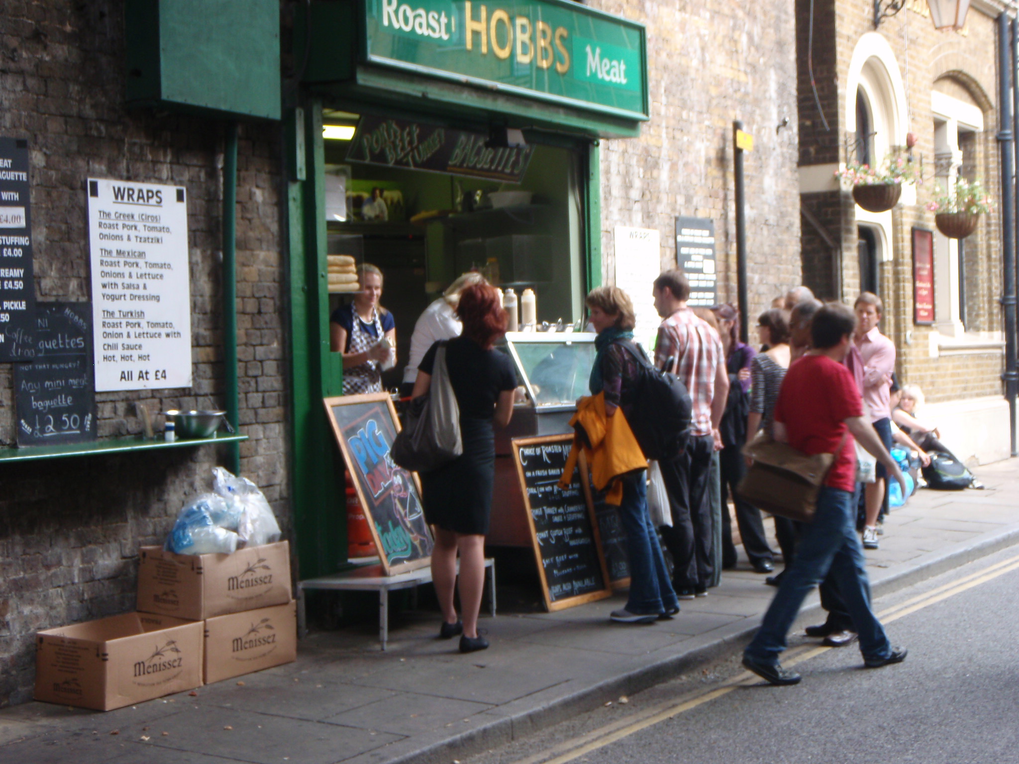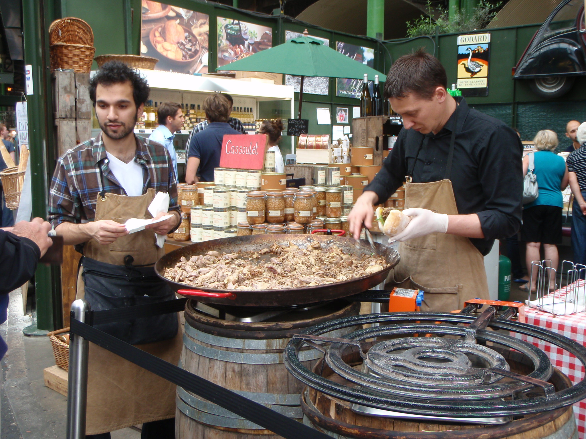 Borough Market (solo il giovedì, il venerdì ed il sabato), vicino a London Bridge, è il mercato alimentare “a chilometri zero” più famoso di Londra, un luogo ad alta concentrazione di produzione britannica ed internazionale. In questo mercato non ci sono rivenditori, ma solamente produttori, che direttamente vendono quello che producono. E’ un luogo magico, un “suk” dove si trova di tutto, dove si gusta di tutto. La storia rivela che del Borough Market, si rintracciano scritti risalenti al 1276, ma già nel 43 a.C. l’area del Southwark Fair Market ospitava contrattazioni di prodotti locali. Oggi oltre 70 banchi, offrono prodotti tipici britannici di altissima qualità. Una vera e propria libidine. E poi c’è la gente, i turisti, una bolgia umana, che inghiotte qualunque cosa, sdraiandosi ovunque. Una città provvisoria, che rinasce ogni settimana sotto le coperture vitree sostenute da pilastri in ghisa in stile vittoriano. Una architettura delle superfetazioni, che si dipana anche sotto ai fasci sopraelevati dei binari della metropolitana, non molto distante dall’erigendo grattacielo “The Shard” a firma di Renzo Piano.
