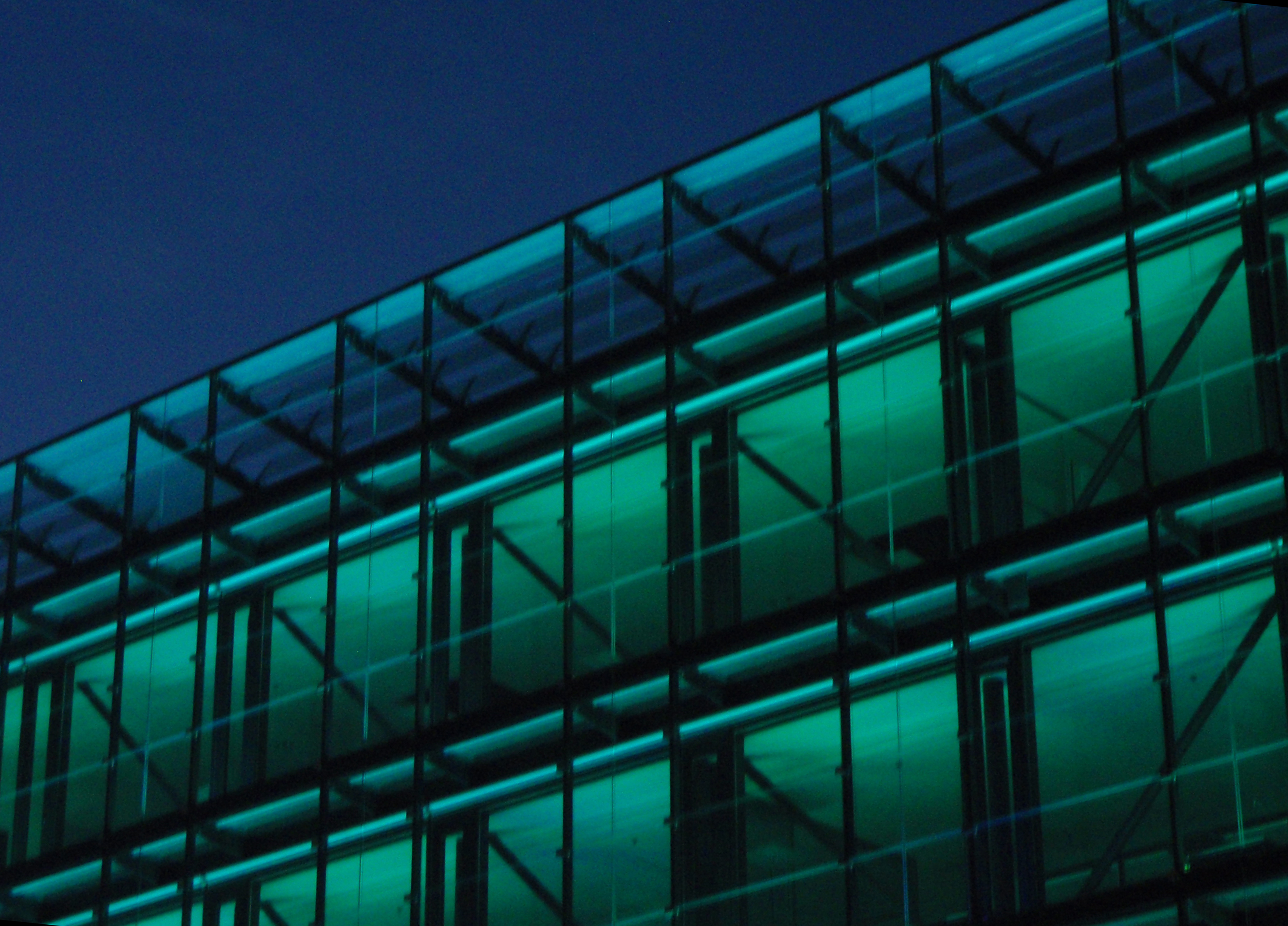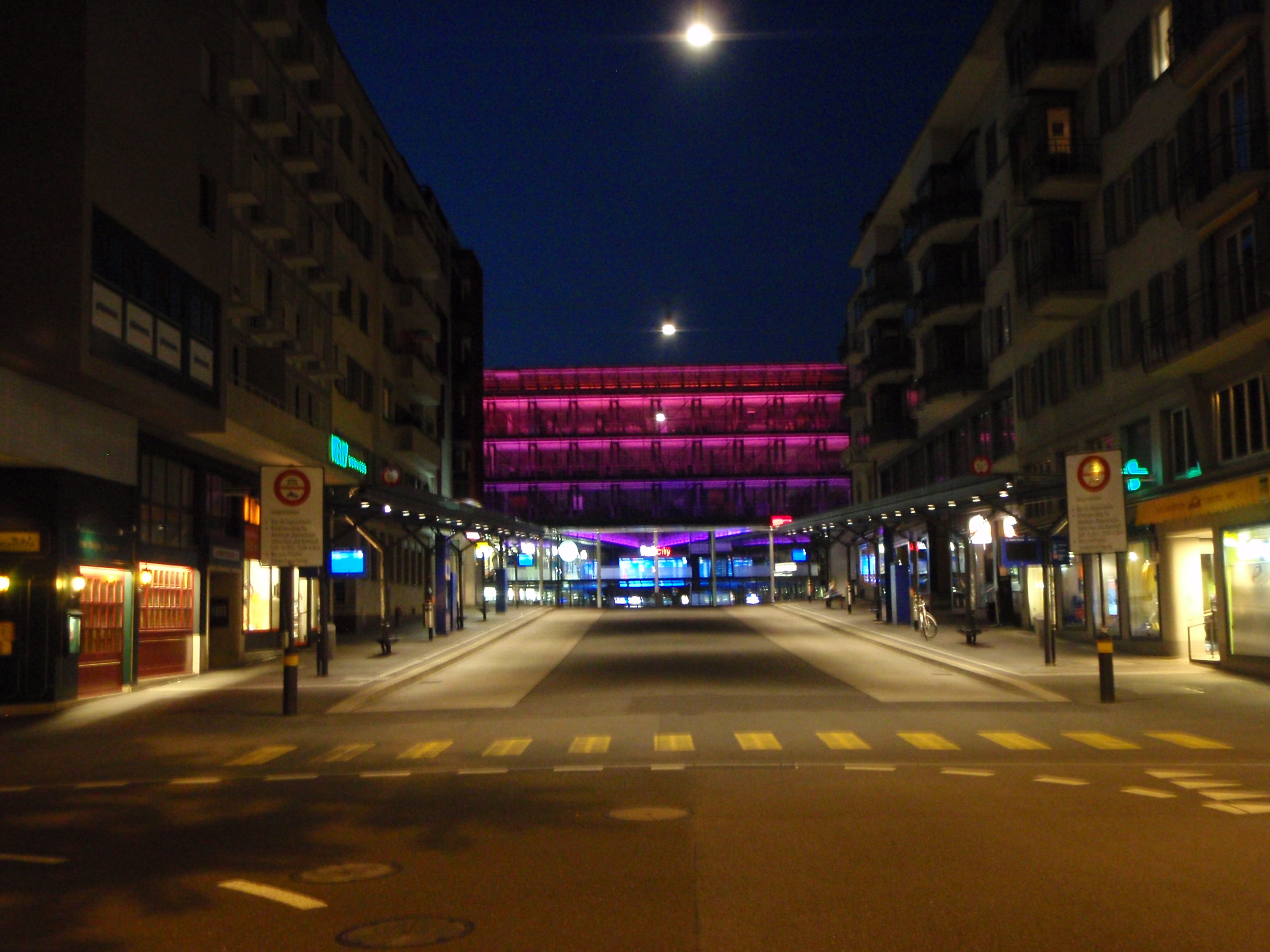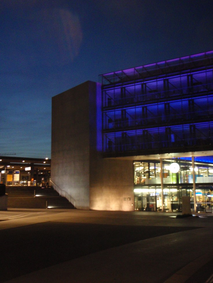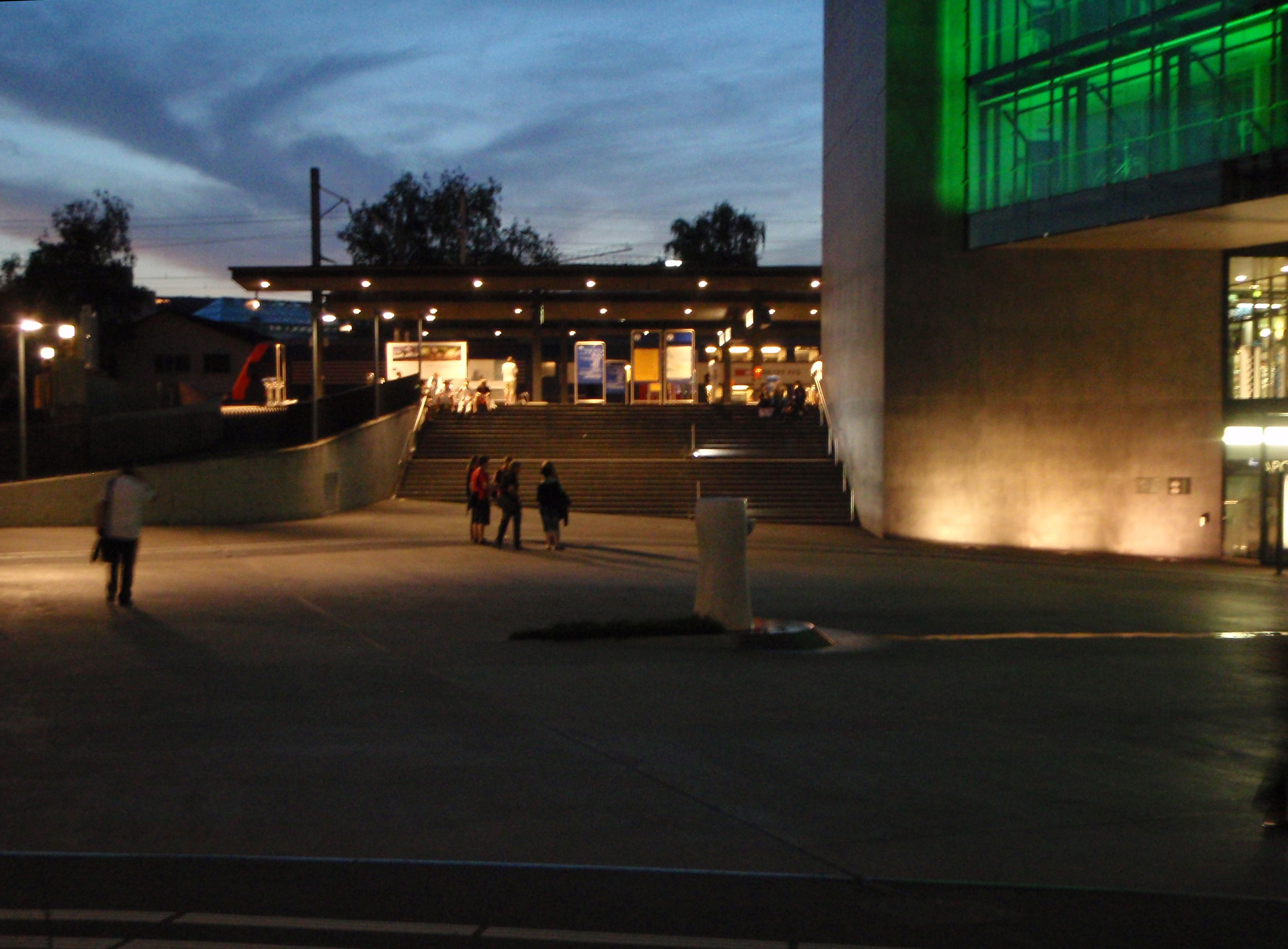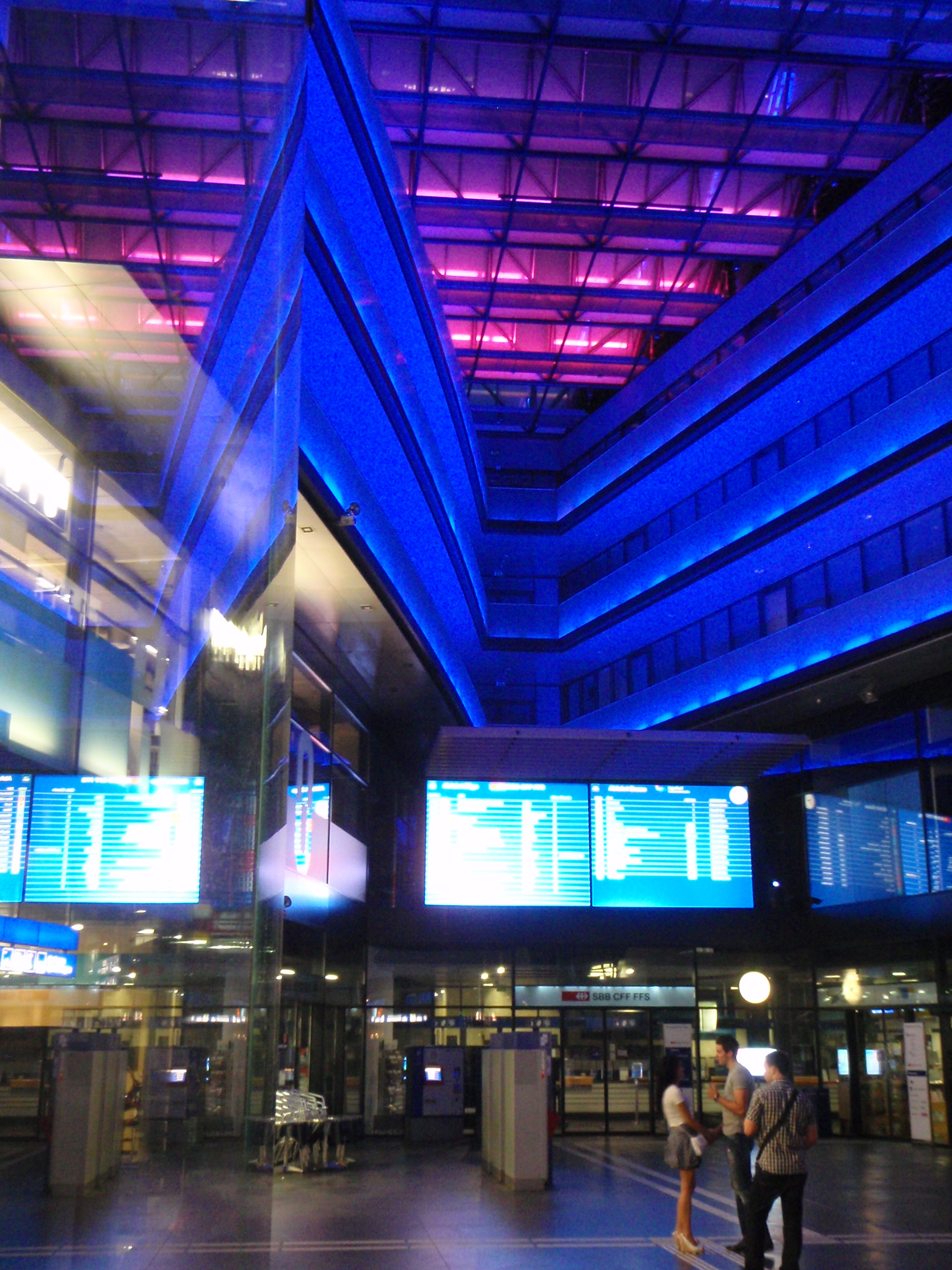 ZUGO TRE – La pittoresca cittadina di Zugo, situata nella svizzera centrale, ha una stazione ferroviaria frequentata giornalmente da almeno 30.000 passeggeri, posta all’intersezione di due linee ferroviarie molto importanti. Da qualche anno, questo luogo, ha cambiato volto e si è trasformata in un modernissimo edificio multifunzionale di vetro ed acciaio. Grazie all’intervento dell’artista californiano James Turrell, l’edificio, che di giorno è un’insospettabile palazzo trasparente e inondato di luce naturale, si trasforma nelle ore notturne in un’opera d’arte. Integrati nella struttura dell’edificio numerosi apparecchi RGB (a LED) creano giochi cromatici “graduali” ed estremamente suggestivi. Rosso, verde, blu, bianco e giallo si avvicendano nella hall illuminando la facciata di toni in contrasto con quelli dell’atrio. Il ritmo dei questi cambi di luce e la modulazione dei colori sono stati decisi da Turrell: si alternano intervalli brevi e lunghi, il salone appare ora luccicante, ora mistico, ora misterioso. Come in una sinfonia di luci !