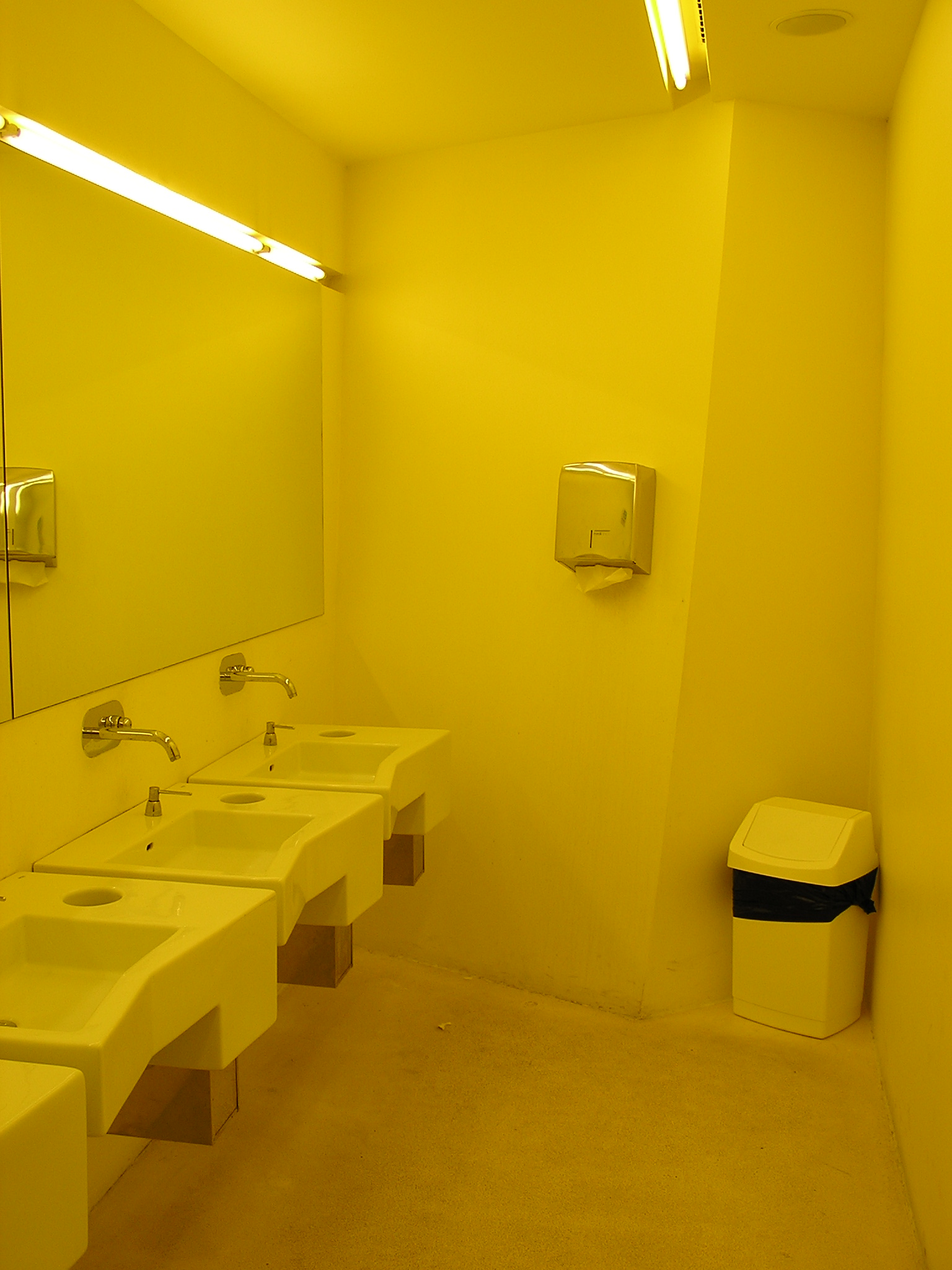 L’aspetto dei servizi igienici, soprattutto nelle strutture pubbliche : musei, scuole, ospedali, ecc. è spesso, qui in Italia, sottovalutato. Invece, questi impianti, spesso costituiscono la “cifra di accoglienza”, con cui gli utenti classificano e valutano la loro esperienza con l’edificio che frequentano. Avendo girato un po’ per l’Europa, mi sono reso conto che, non è la qualità dei materiali a fare la differenza, ma soprattutto la loro funzionalità, la loro igienicità ed il fatto che tra l’interno (dei servizi igienici) e l’esterno esista una netta differenza. Come a separare un luogo pubblico da un luogo più raccolto, ben insonorizzato. In tal senso mi sembra emblematico lo standard raggiunto dal duo Herzog & De Meuron, i servizi igienici sono sempre realizzati in cartongesso, i rivestimenti sono in resina, con colori spesso cangianti. La resina dà subito all’utente l’impressione di estrema igienicità e lavabilità, se utilizzata con colori chiari. Gli elementi (wc, lavabo, ecc.) invece sono quasi banali, semplici, così come i corpi illuminanti. Per non dire degli specchi che sono sempre applicati in “luce”. A fare “ambiente” è l’andamento dei muri e la luce, che si carica del colore predominante, facendo sì che tutto sia impregnato di colore. In questo senso sono emblematici il Rehab a Basilea e il Forum di Barcellona. Ma anche il recentissimo Museo delle Culture di Basilea, a parte leggere varianti, soggiace a questa regola.