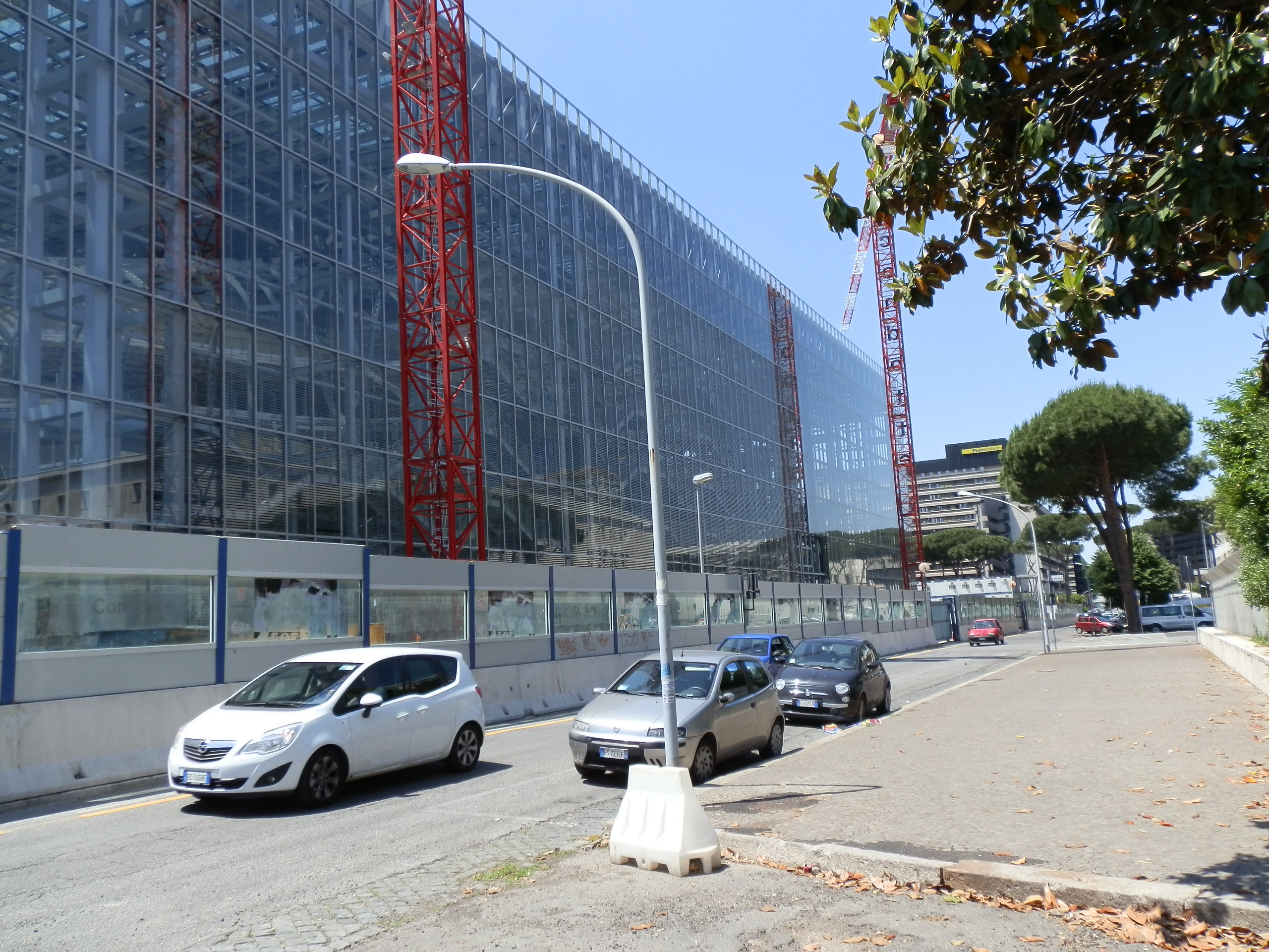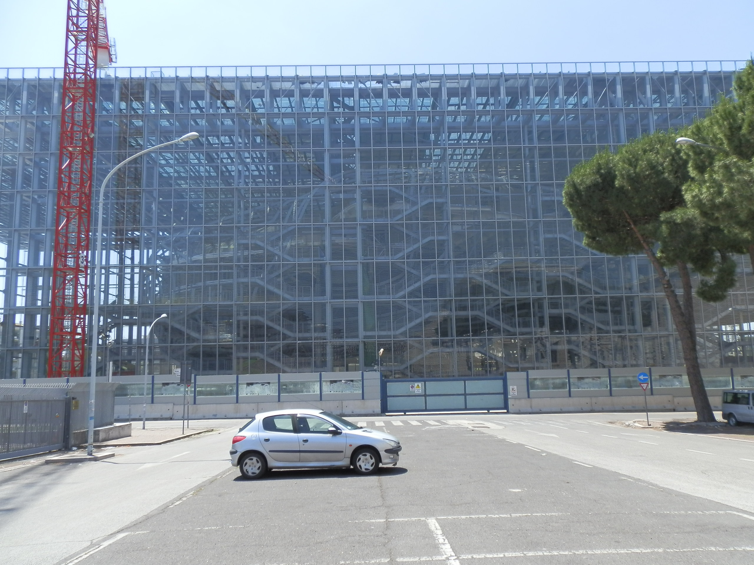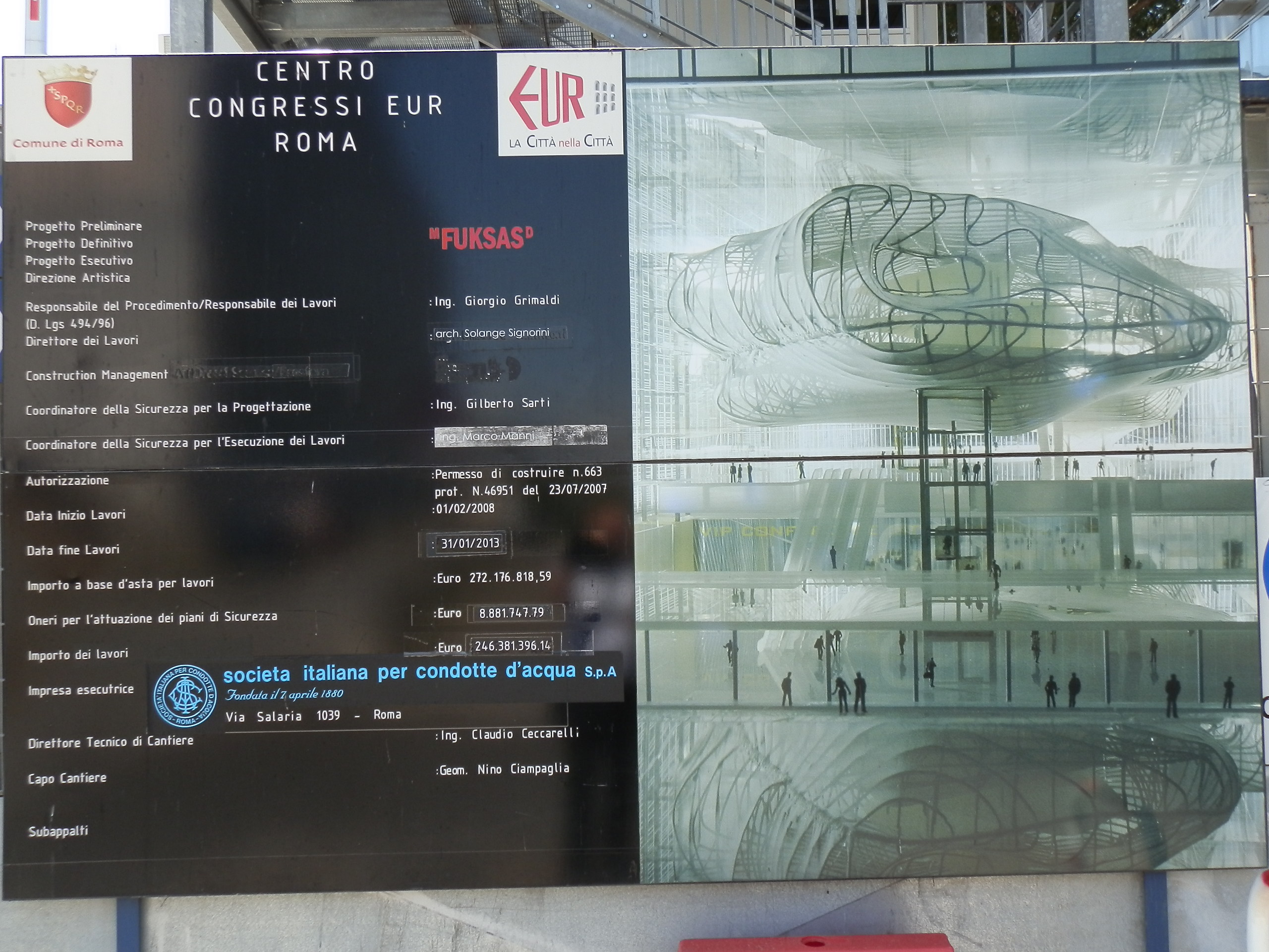 Si stanno completando, lentamente, molto lentamente, i lavori per il nuovo centro congressi dell’Eur a Roma ideato da Massimiliano Fuksas e signora . All’inizio dell’anno prossimo (31 gennaio 2013) forse l’inaugurazione. Il concorso internazionale fu aggiudicato nel 2000, il bando era del 1998. Nel 2003 un consorzio di Bari, si aggiudica il Project Financing (partnership tra pubblico e privato). Il consorzio però non si decide ad avviare i lavori. I costi intanto lievitano e si passa dai 130 milioni previsti nel concorso, ai 225 stimati nel 2006, momento in cui, al consorzio di imprese di Bari, viene interrotto il contratto. L’anno dopo la società Condotte Spa si aggiudica la nuova gara. Il progetto, in corso di ultimazione, consiste in una suggestiva “nuvola’”di fibra di vetro e silicone (auditorium da 1.850 posti), collocata sospesa, all’interno di una teca di acciaio e vetro, trasparente, larga 75 metri ed alta 39 metri . Più in basso, la sala congressi vera e propria in grado di ospitare oltre 8.000 posti a sedere. A completamento del complesso, spazi per la ristorazione, un hotel (440 camere) e parcheggi sotterranei ed esterni. I costi complessivi stimati ad oggi sono di 277 milioni di euro (arredi compresi). Un vero “pozzo senza fondo”, oltre alla consegna dell’opera quindici anni dopo il lancio del bando di concorso! Inoltre a fianco le torri abitative, progetto di Renzo Piano, con già il permesso di costruire in tasca, rimangono ancora un’eventualità, vista la crisi del settore. Viene ovvio chiedersi, se un “oggetto” così costoso, anche nei costi di gestione, come è il progetto del nuovo Centro Congressi dell’Eur, abbia oggi ancora senso.