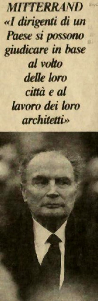 Per François Mitterrand, la prima arte era l’architettura, infatti la sua storia ufficiale, ci racconta dell’interesse personale di “Monsieur le Président”, su questo argomento, perseguito quasi con accanimento. La Cité des Sciences de La Villette di Bernard Tschumi inaugurata nel 1986, l’Opera-Bastille progettata dall’ architetto canadese-uruguaiano Carlos Ott inaugurata per le celebrazioni del bicentenario nel 1989, il Grand Louvre con la Piramide dell’architetto cino-americano Ieoh Ming Pei del 1989, il Grande Arco alla Defence di Otto Von Sprekelsen del 1989, la Bibliothèque Nationale de France che è stata ufficialmente inaugurata da Mitterrand nel 1994 (ma aperta solo nel 1996), il progetto per la Città della Musica progettato dall’architetto francese Christian de Portzamparc del 1995, sono solo alcuni degli edifici pubblici (e soprattutto quasi esclusivamente a vocazone culturale) voluti a Parigi, ed a volte, seguiti direttamente, quasi con ossessione, da Mitterand nella loro evoluzione e realizzazione. Questo accanimento, si rivoltò contro Mitterand, che in vita fu considerato dall’opinione pubblica, un Re-Faraone, per la quantità di grandi opere architettoniche realizzate nella capitale francese. Non a caso, poco prima di morire (a causa di un male incurabile) Mitterand intraprese un faticoso viaggio in Egitto. Se però è vero l’assioma, che i dirigenti di un Paese si possono valutare in base al volto delle loro città, ed in funzione del lavoro dei propri architetti, possiamo tranquillamente asserire che il paesaggio italiano, in merito, riserva anche quì degli aspetti inquietanti.