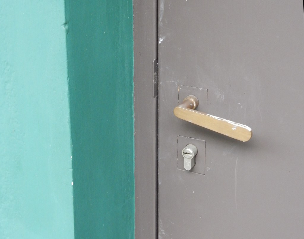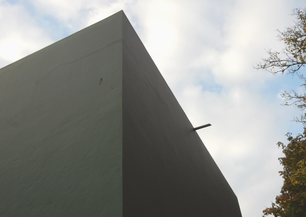 In cima alla scala esterna, al piano primo (ed unico), si trova l’ingresso della casa “Existenzminimum”, che ha una porticina d’ingresso lignea, verniciata di grigio, con maniglia di ottone, e soprastante piccola pensilina in beton.