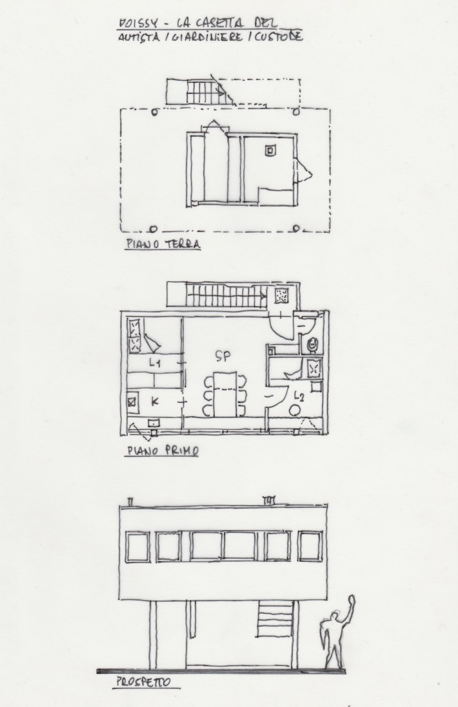 L’antefatto della Villa, proprio accanto all’ingresso carraio e pedonale, è l’abitazione del custode/autista/giardiniere. Un piccolo edificio, che già esprime però, con austere dimensioni e materiali, i “cinque punti dell’Architettura Moderna (https://bit.ly/41JFC9H).
