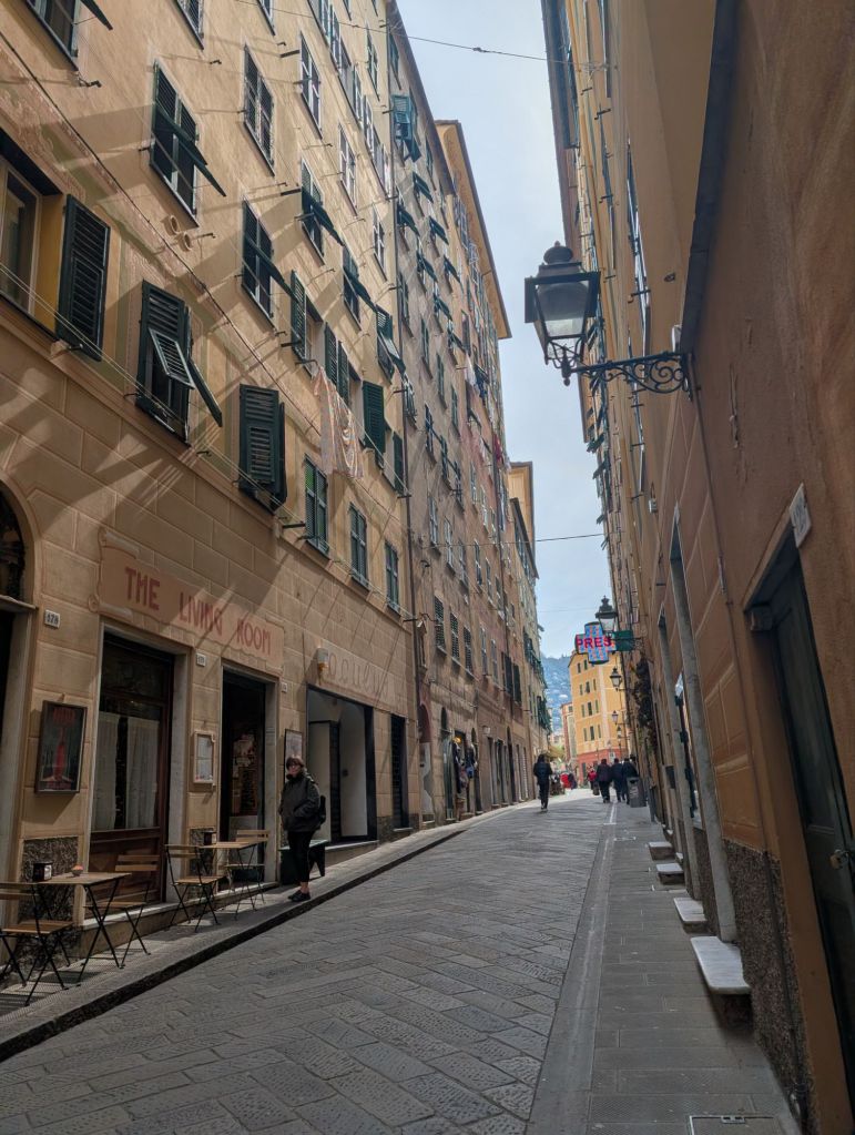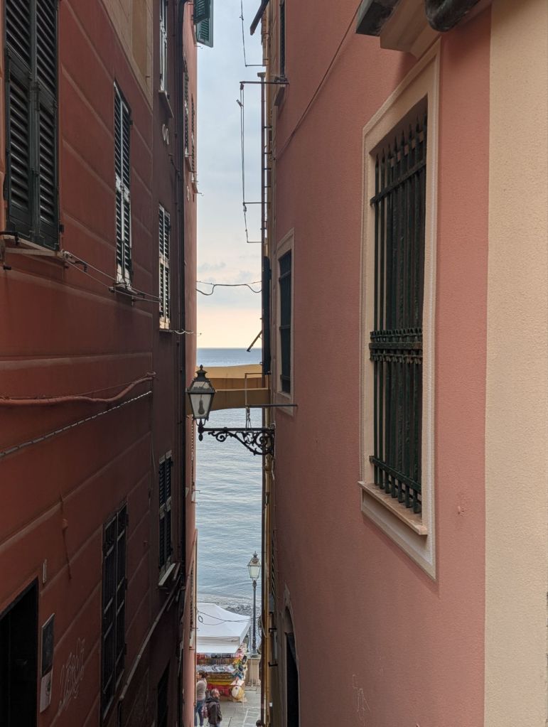 A Camogli, questo processo è immediato. Il borgo si dispone come una quinta teatrale lungo il mare: le case alte, strette, dipinte in tonalità calde, non sono soltanto una soluzione urbanistica alla scarsità di spazio, ma diventano un dispositivo visivo. Esse guidano l’occhio lungo una linea verticale che contrasta e insieme dialoga con l’orizzonte marino. Il risultato è un equilibrio dinamico tra stabilità e apertura, tra radicamento e fuga.