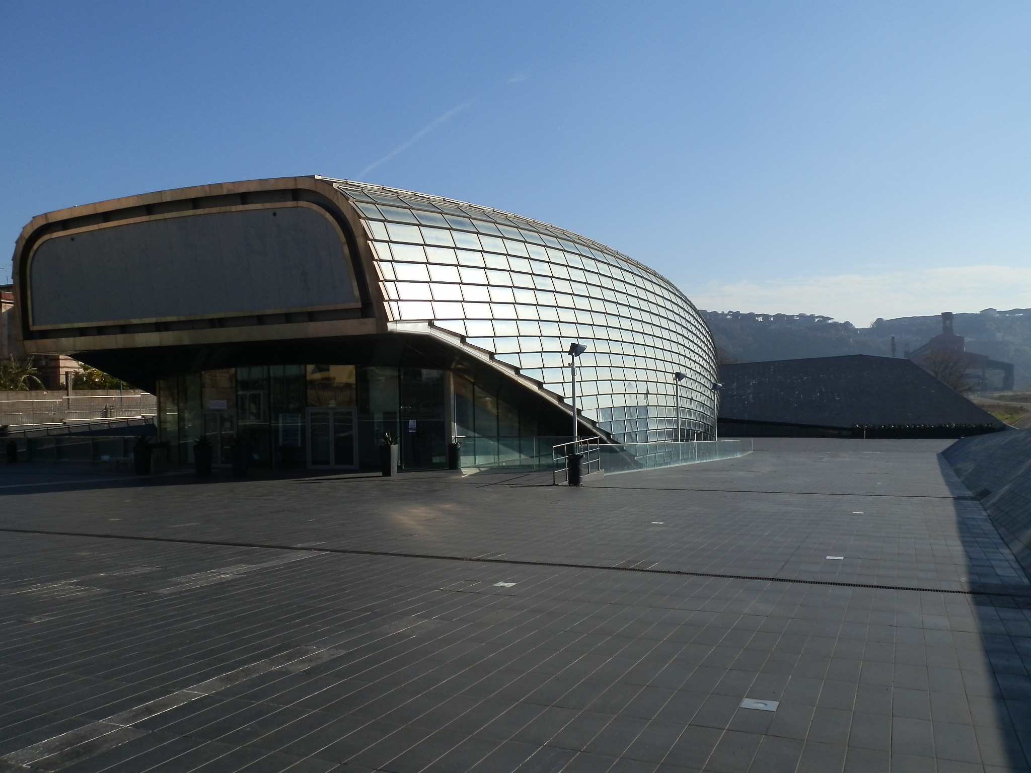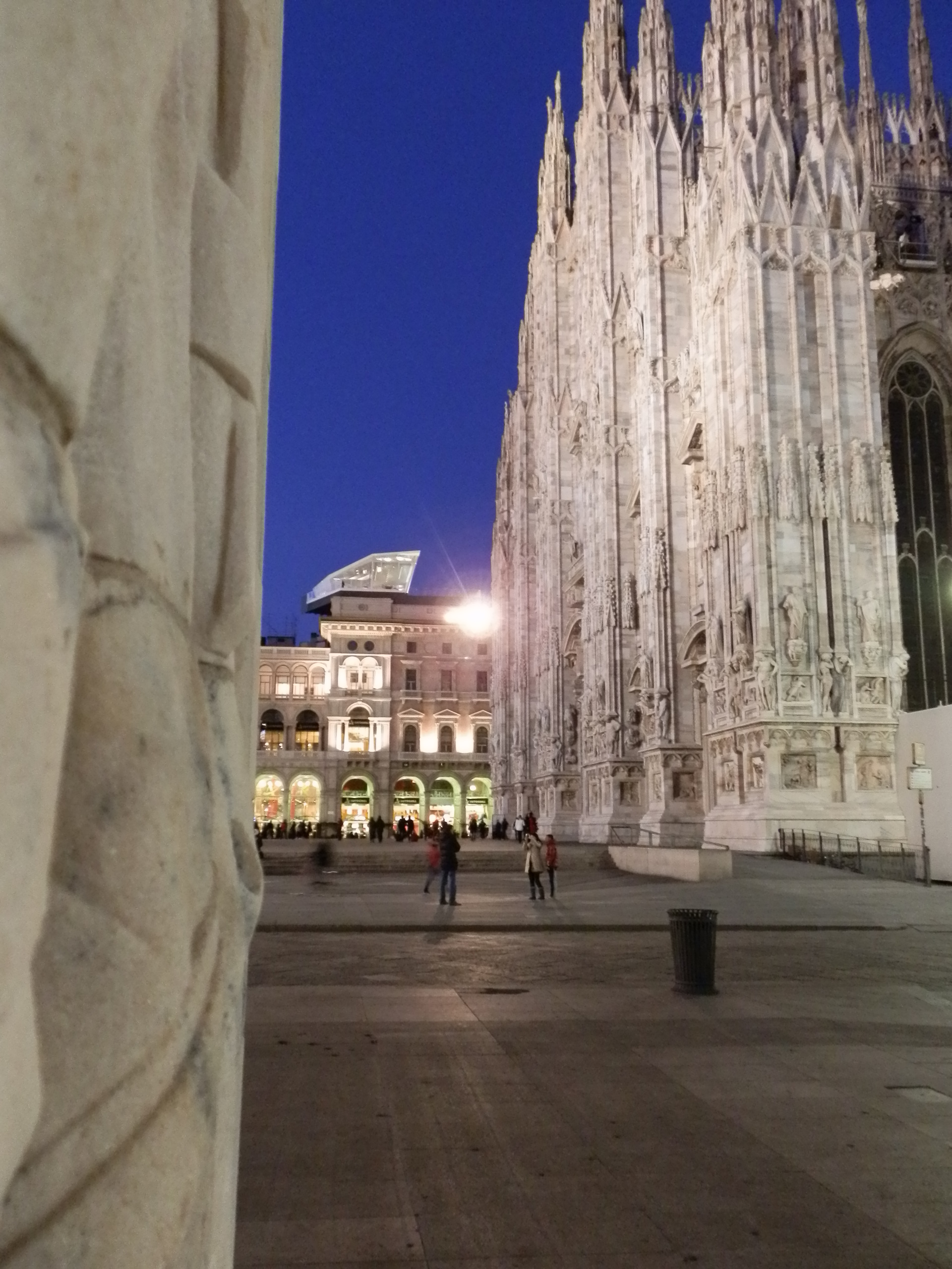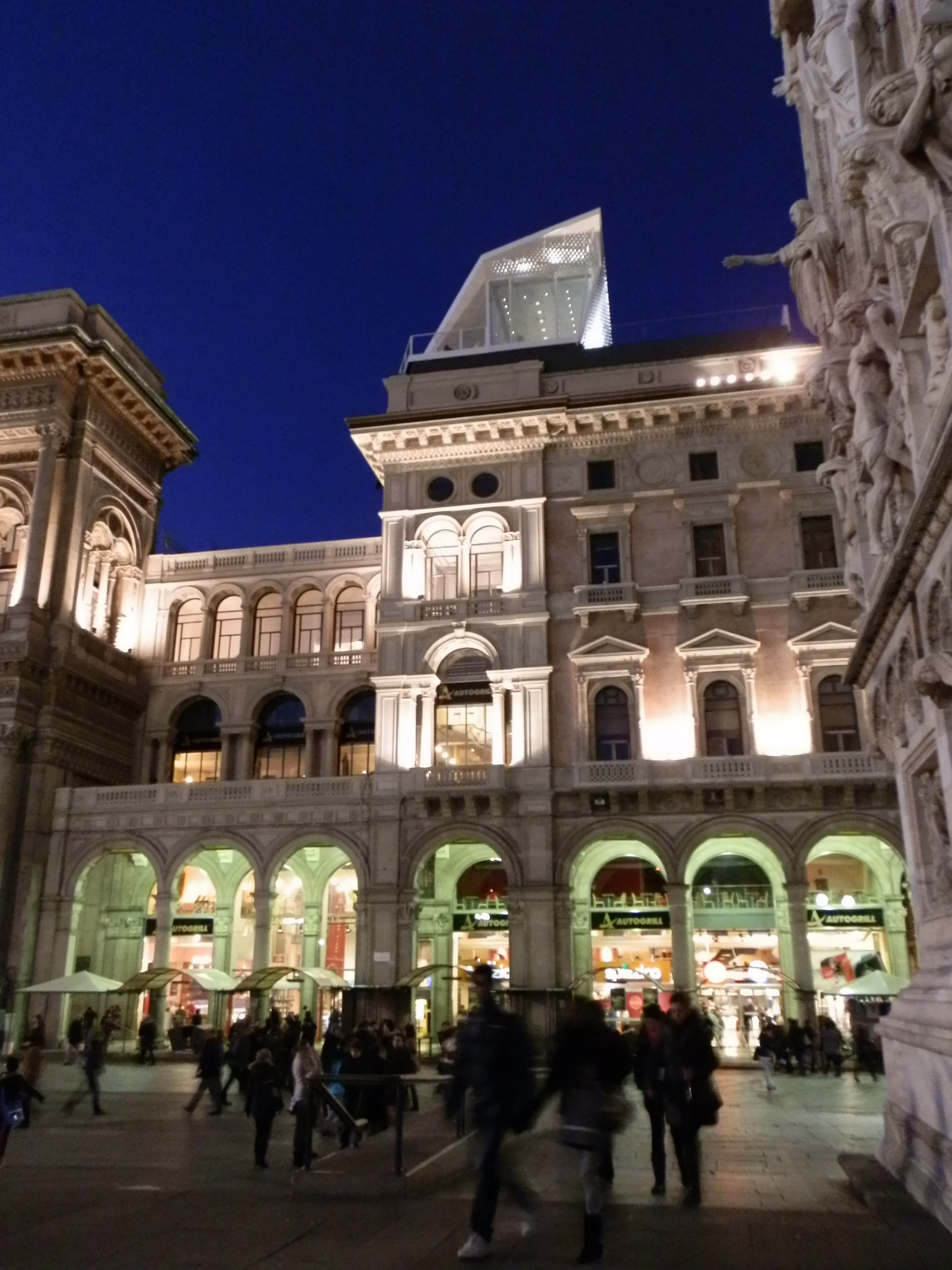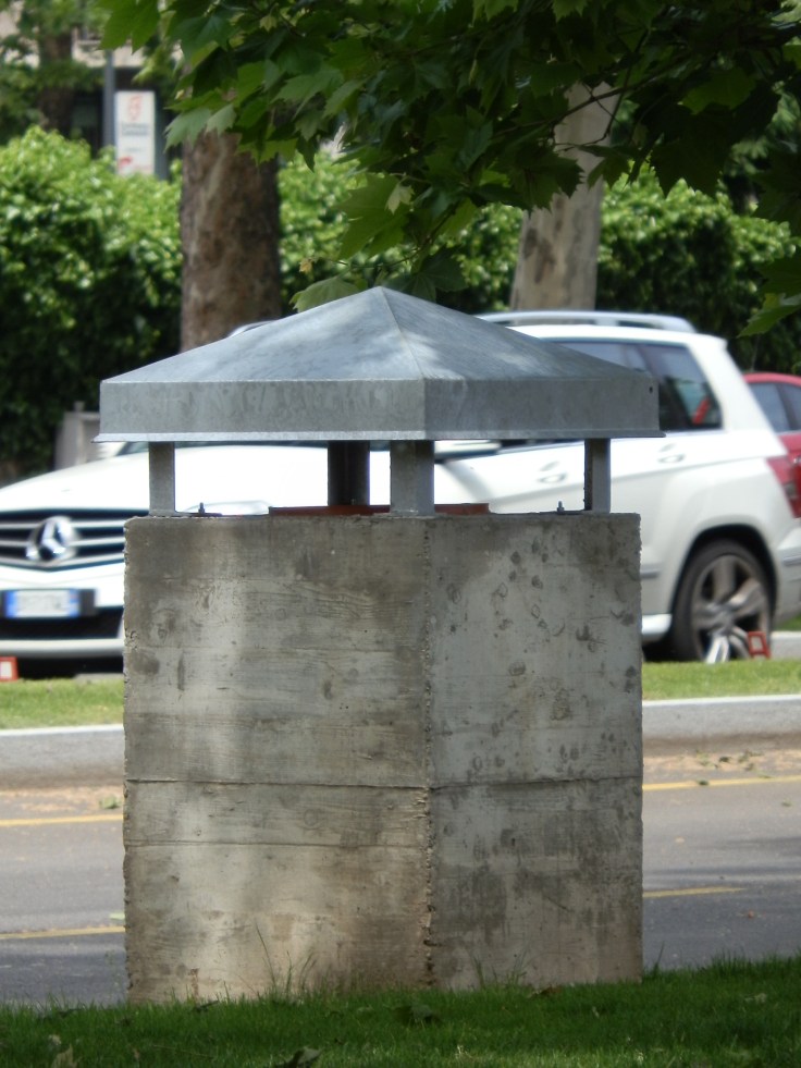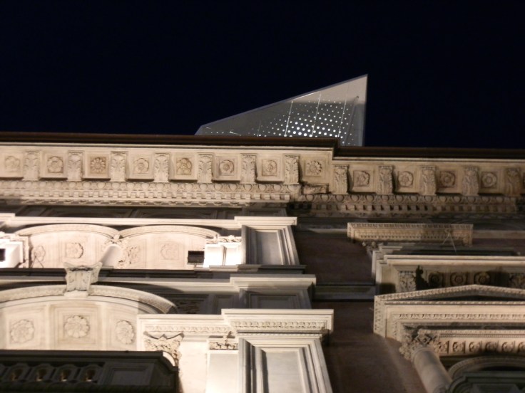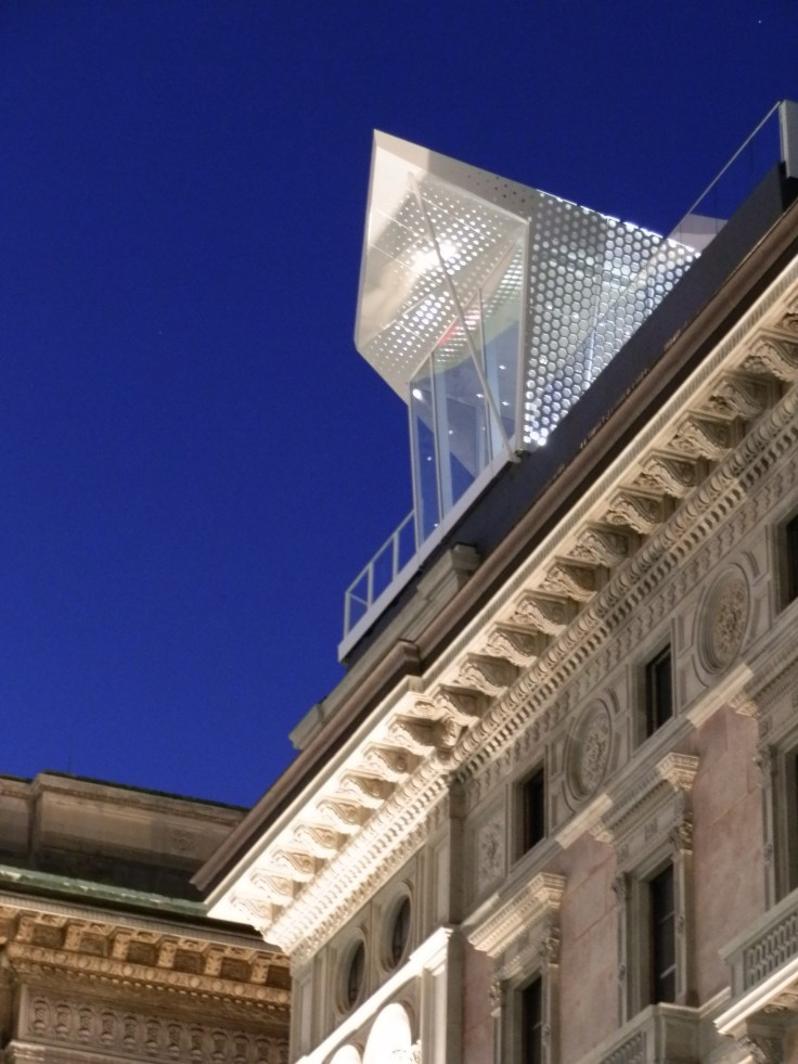 Insomma, sembra una ciliegina posata in bilico sulla torta, non fa danno, ma certamente attira lo sguardo, devia dalla torta. Quì la torta (o meglio il panettone, visto che tra poco è San Biagio) è il sistema prospettico che conduce tutti gli sguardi sul Duomo. Infatti, soprattutto di sera, molti turisti si ritrovano con il nasino all’insù, ad osservare questa insolita “astronave”. Probabilmente è solamente questo l’effetto che si vuole determinare, con la collocazione inusitata, posta in bilico sui tetti. Non è quindi una architettura, come tutti i soprammobili è innanzitutto una scultura, una scultura abitata, un qualcosa che può piacere o non piacere, ma non sconvolge più di tanto, visto che già si sa che prima o poi verrà rimosso per sempre. In questo caso sarà traslocato, il soprammobile, in un’altra situazione urbana, sempre in bilico, a sottrarre al paesaggio attenzioni, ed a fare deviare lo sguardo.