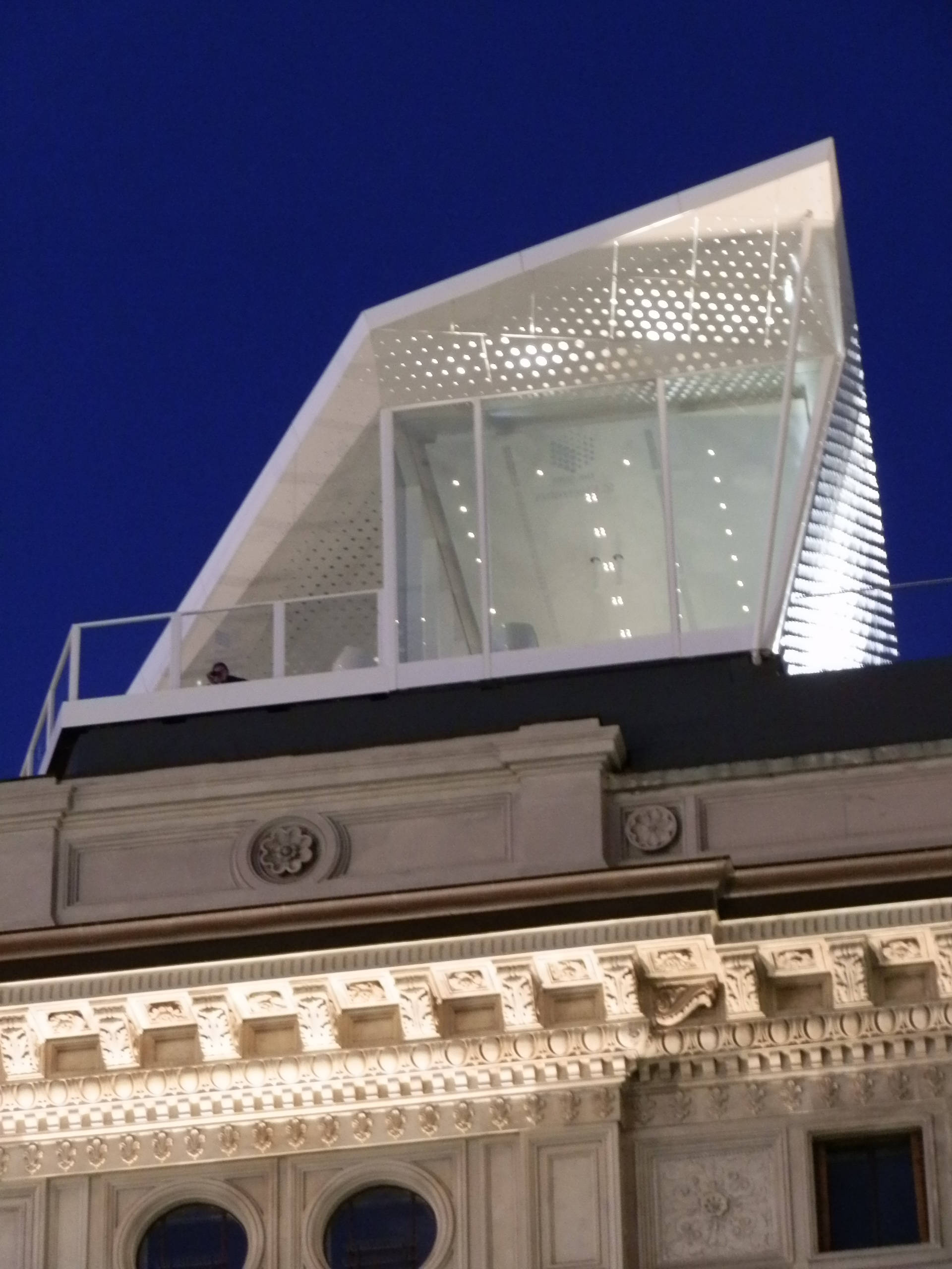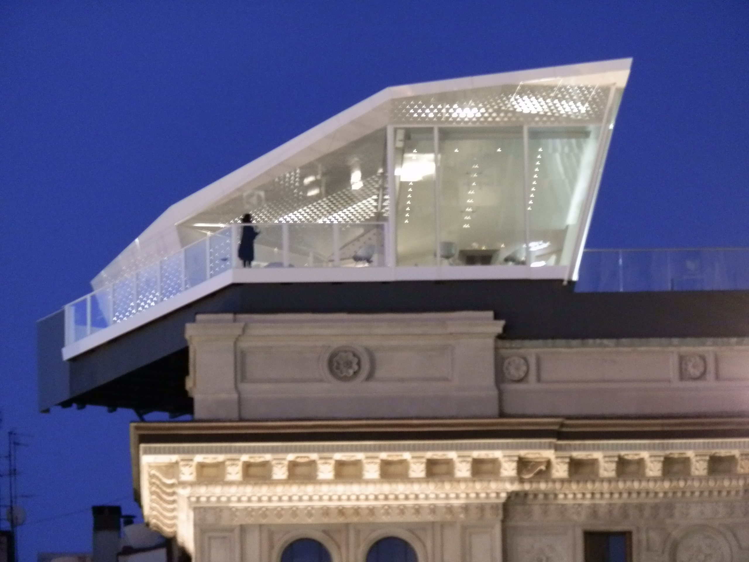 Può un soprammobile cambiare le sorti di un’architettura, di un paesaggio. Può un elemento mobile e quindi rimovibile, “costruire” un intorno. E’ una domanda difficile a cui rispondere, soprattutto quando il soprammobile è alto 5 metri ed ha una superficie di 140 metri quadrati. Infatti lo spazio Electrolux, progettato dallo studio Park Associati e “depositato” sui tetti della Galleria Vittorio Emanuele in Piazza del Duomo a Milano, sembra quello che è un soprammobile. La sua funzione è quella di un ristorante provvisorio, esclusivo, con 18 posti a sedere tutti con vista, dove a pranzo si pagano 200 euro, alla sera, a cena (per godersi la Milano illuminata) 275 euro.