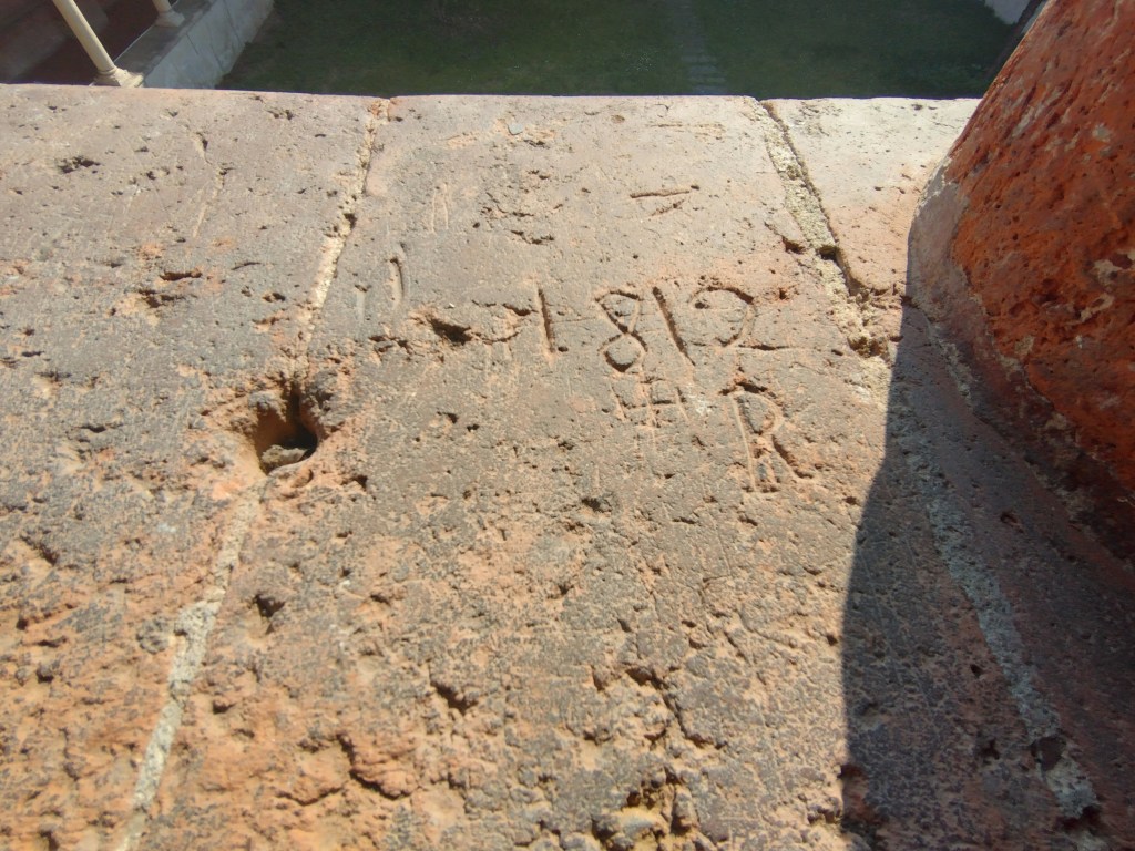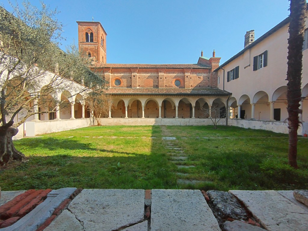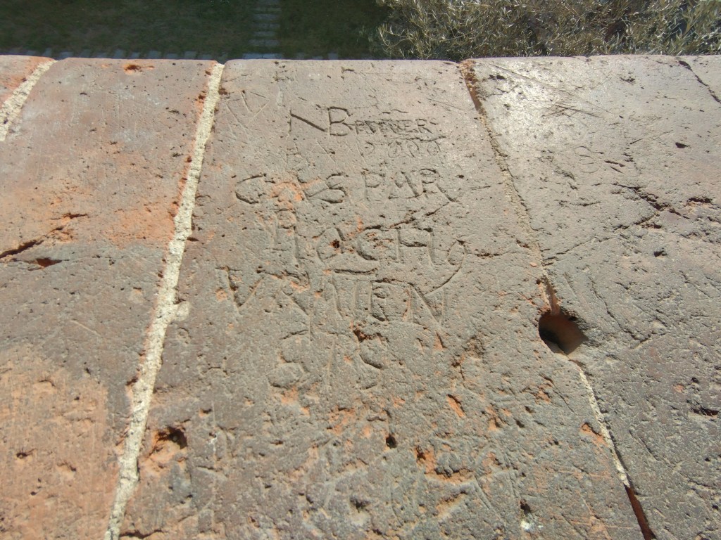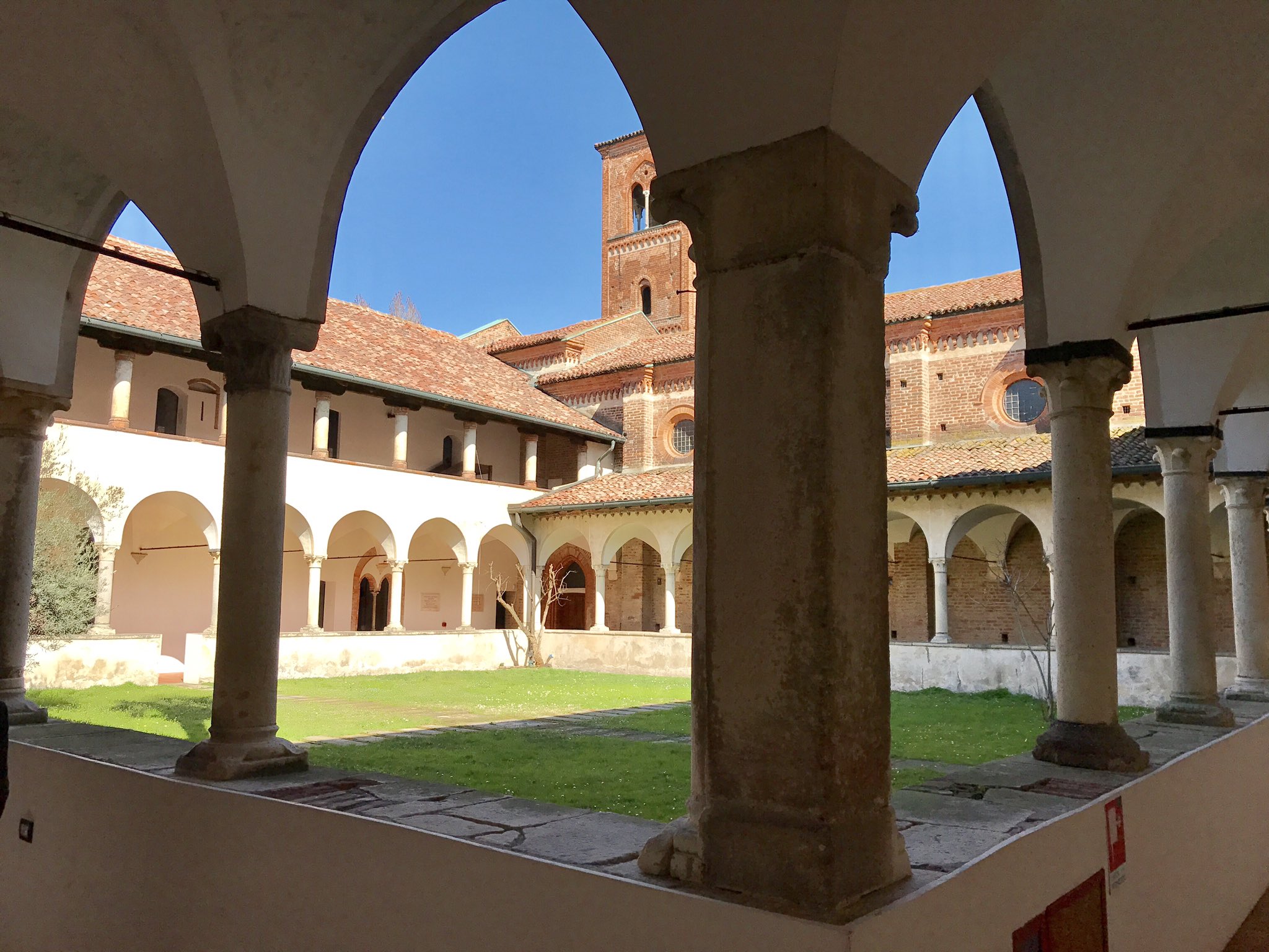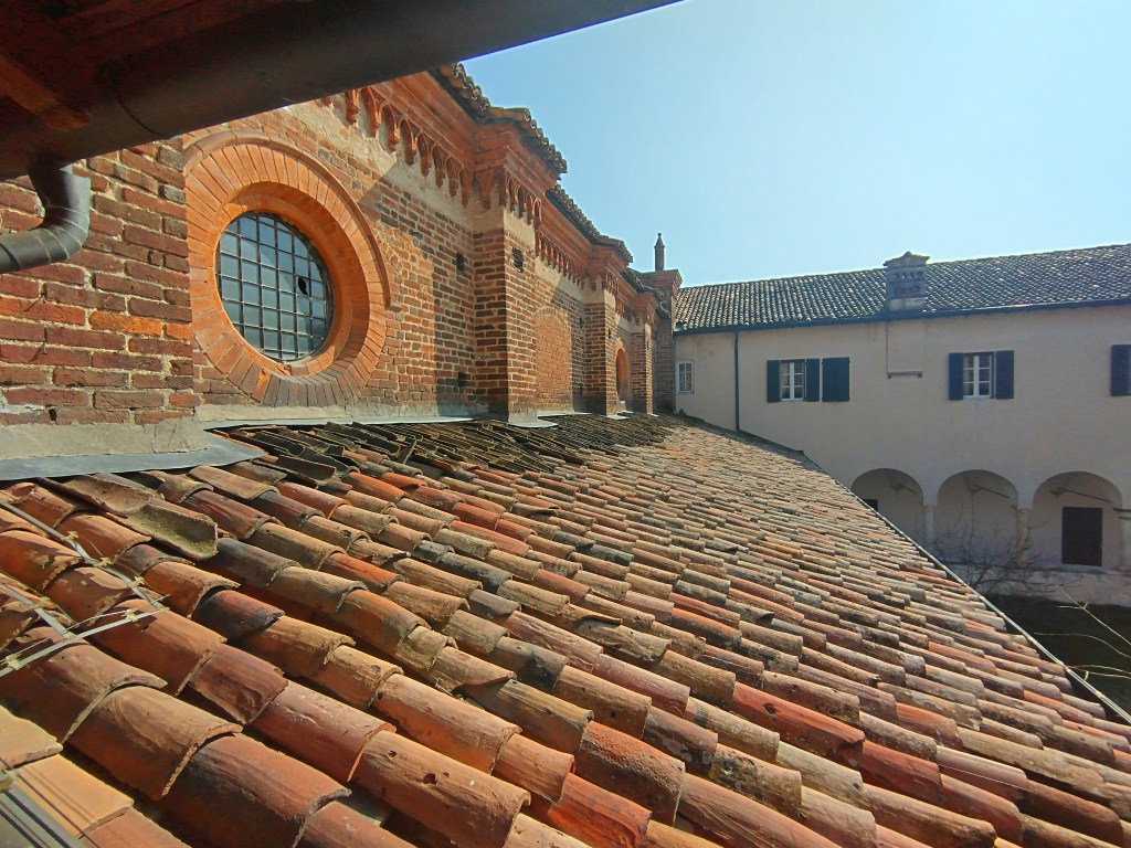 I pellegrini, accolti nella struttura abbaziale, incidevano, nel corso del tempo, le copertine in cotto del chiostro al piano primo, per lasciare tracce del loro passaggio attraverso il Cammino dei Monaci ( https://bit.ly/3JjGjQv ), che è un cammino a tappe di 67 km che va da Milano alla via Francigena passando per il Po.
