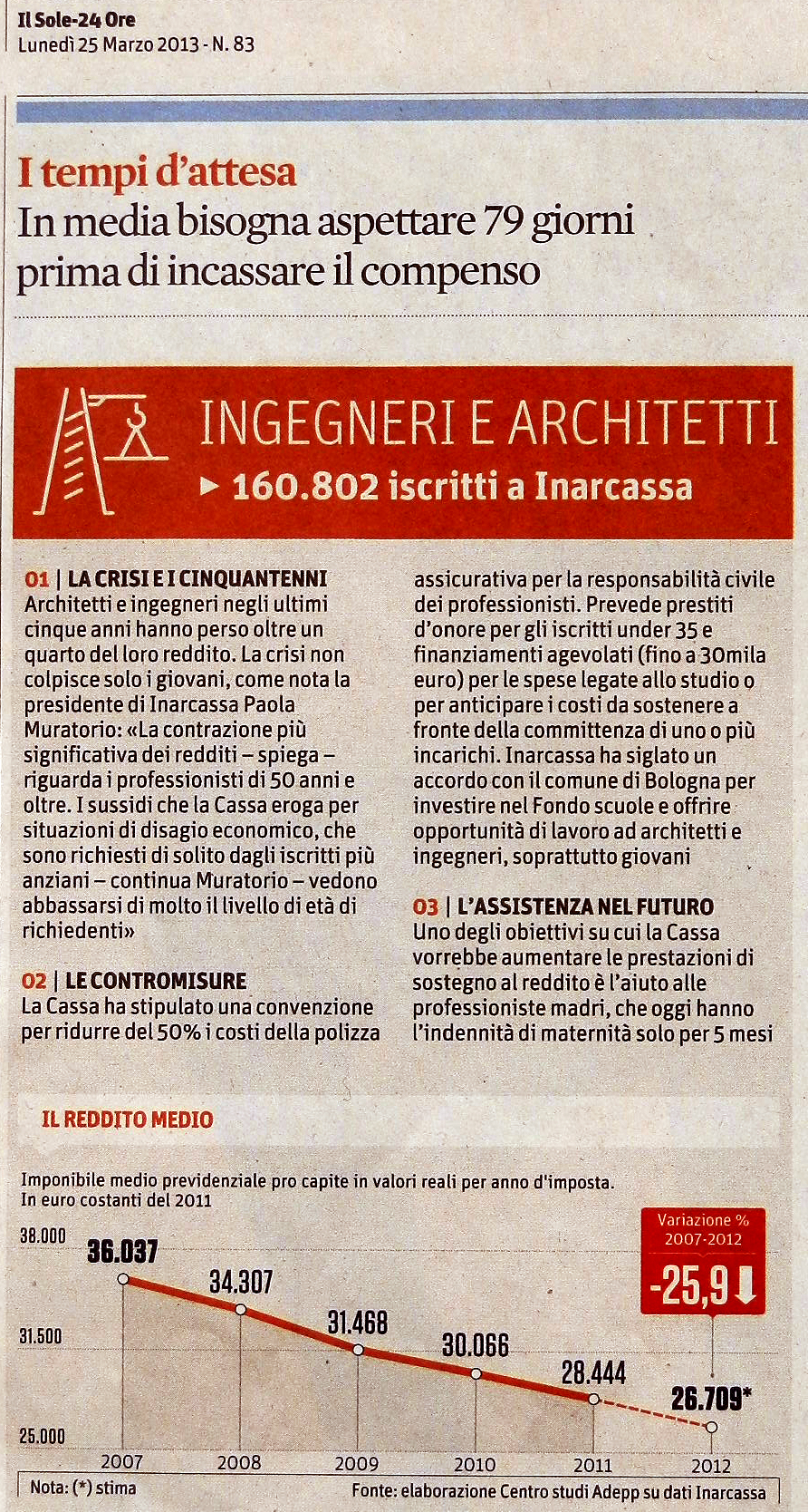 Che il “creativo” sia un mestiere per benestanti, se non proprio per ricchi, appare ormai evidente: se si trova il lavoro, ormai rarissimo, si va a bottega da noti professionisti e/o società d’ingegneria, ma difficilmente ci si emancipa da una situazione sottopagata, o addirittura non pagata. Situazione che può durare anni e con la nuova legislazione (per lavorare) impone l’obbligo di partita iva ed iscrizione all’ordine professionale. È considerevolmente cresciuta l’offerta di professionisti, e quindi, per effetto della concorrenza, si sono abbassati i compensi, che ormai hanno raggiunto il limite della mera sussistenza.