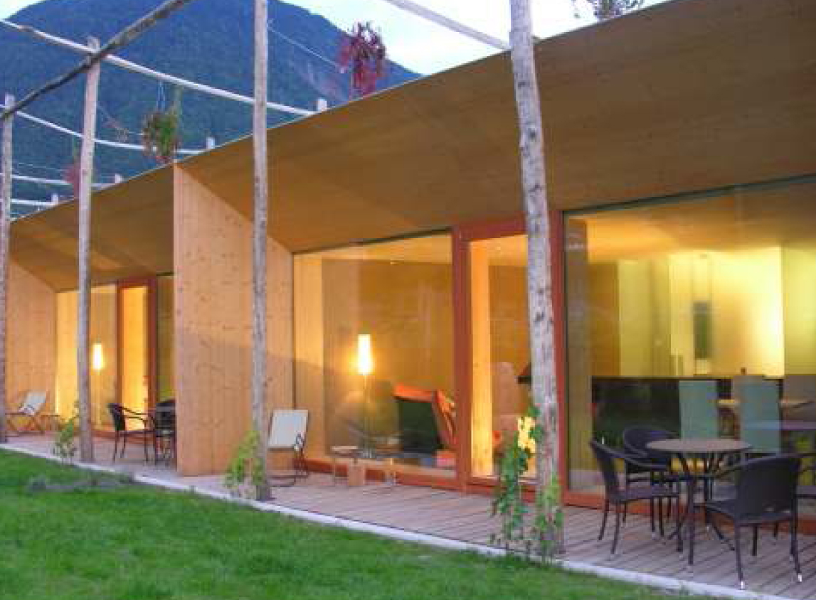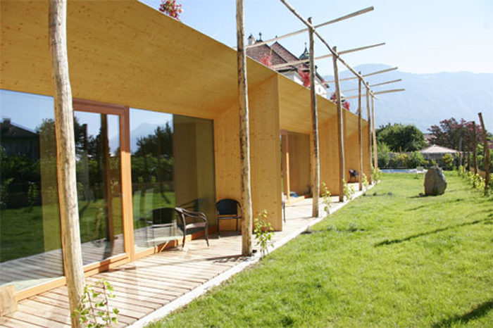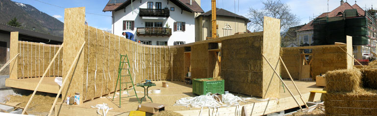 Si tratta di un progetto realizzato nel 2006, a Lana (Bolzano), per tre unità abitative dell’agriturismo Esserhof. Edificato in soli 5 mesi, tra la primavera e l’estate. Un edificio molto interessante, sia per gli aspetti tecnologici, sia per gli aspetti compositivi e di inserimento nel paesaggio agricolo ameno della periferia di Lana. Il progetto è frutto di una intensa collaborazione tra due architetti svizzeri, Werner Schmidt e Margareta Schwarz, esperti di costruzioni in paglia, in connubio con i proprietari. Si tratta di un progetto in cui i materiali naturali, bioecologici, vengono spinti al massimo, sia all’esterno, che all’interno, per ricreare nelle forme e negli ambienti una sensazione di accoglienza, che disvela la natura di alta sostenibilità di tutto l’edificio. Gli alloggi dell’agriturismo (di circa 39 mq cadauno) hanno un assetto planimetrico rivolto verso sud, con ampie vetrate schermate da pergole, mentre a nord risultano quasi completamente chiusi dalle murature in paglia e legno. Le murature sono spesse 90 cm, realizzate con balle di paglia da circa 90 – 120 cm sovrapposte, sono tenute insieme da nastri tesi di polietilene, poi intonacate di calce ed argilla. Questa massa, ha una capacità termica molto efficiente (coefficiente di trasmissione termica U=0,06W/mqK), tanto che non è necessario nessun tipo di riscaldamento. Anche il solaio ed il tetto, di circa 60 cm è completamente coibentato in paglia. Il vespaio areato è l’unica opera realizzata in cemento armato.