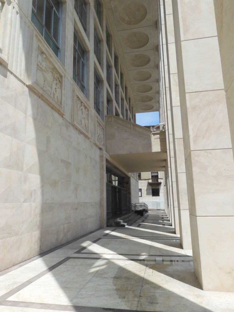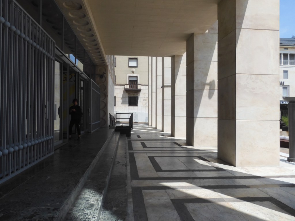 Il cemento armato, appoggiato sui reperti archeologici del basamento del Teatro romano, banalmente rivestito in mattonidi laterizio. Una operazione banale di nascondimentoscenografico,probabilmente concordata con i detentori del vincolo sui reperti.
