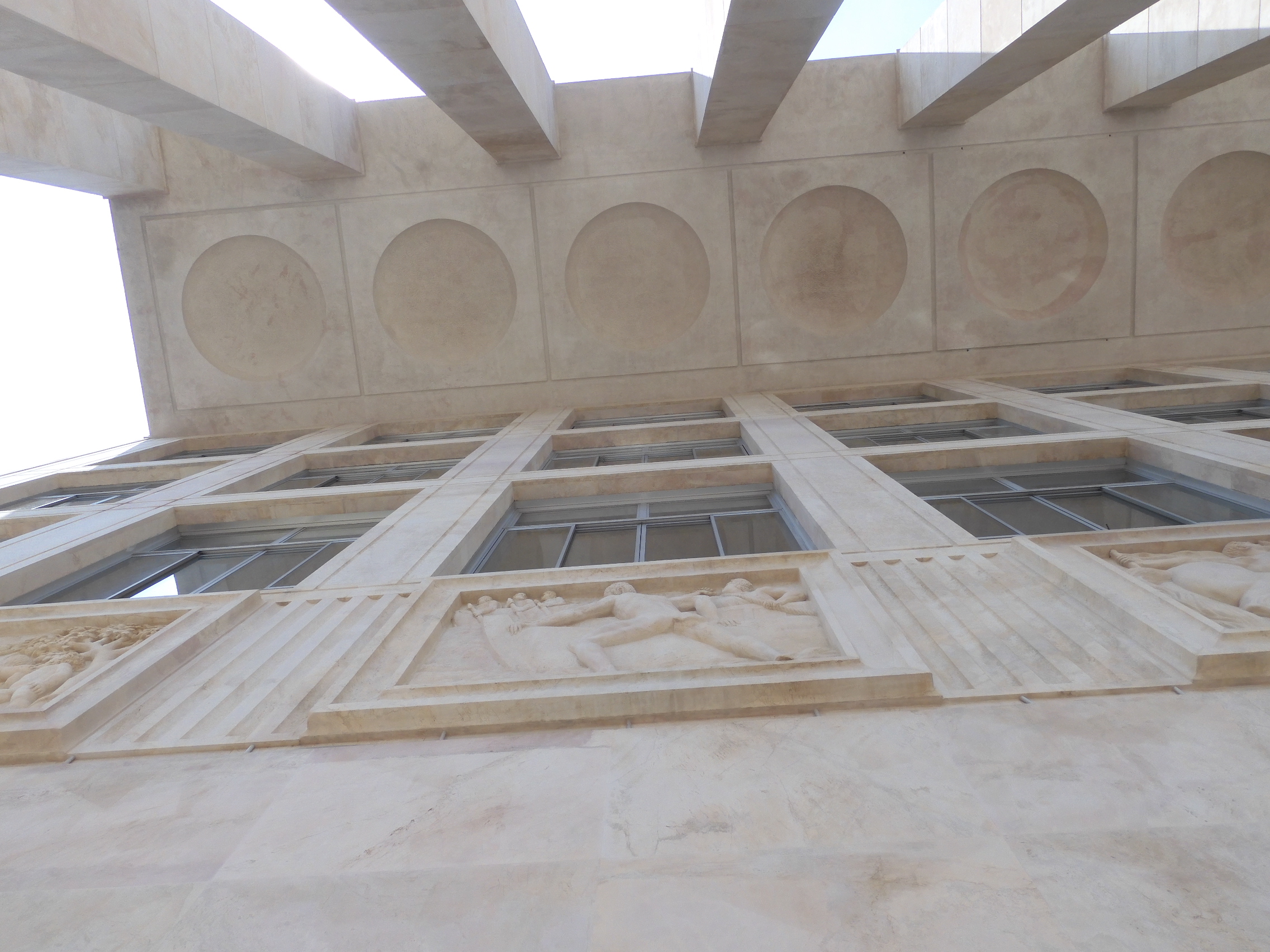 La parete di fondo del portico ha una fascia basamentale rivestita di pietre con taglio a punta di diamante, coronata da un fregio con otto formelle a bassorilievo dello scultore Leone Lodi con soggetti tra cui “Il lavoro della terra”, “L’unione coniugale”, “I mestieri” e la “Navigazione”. – https://it.wikipedia.org/wiki/Leone_Lodi