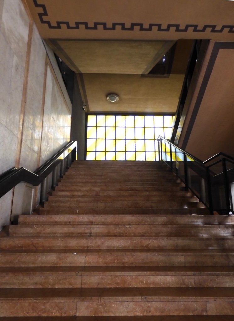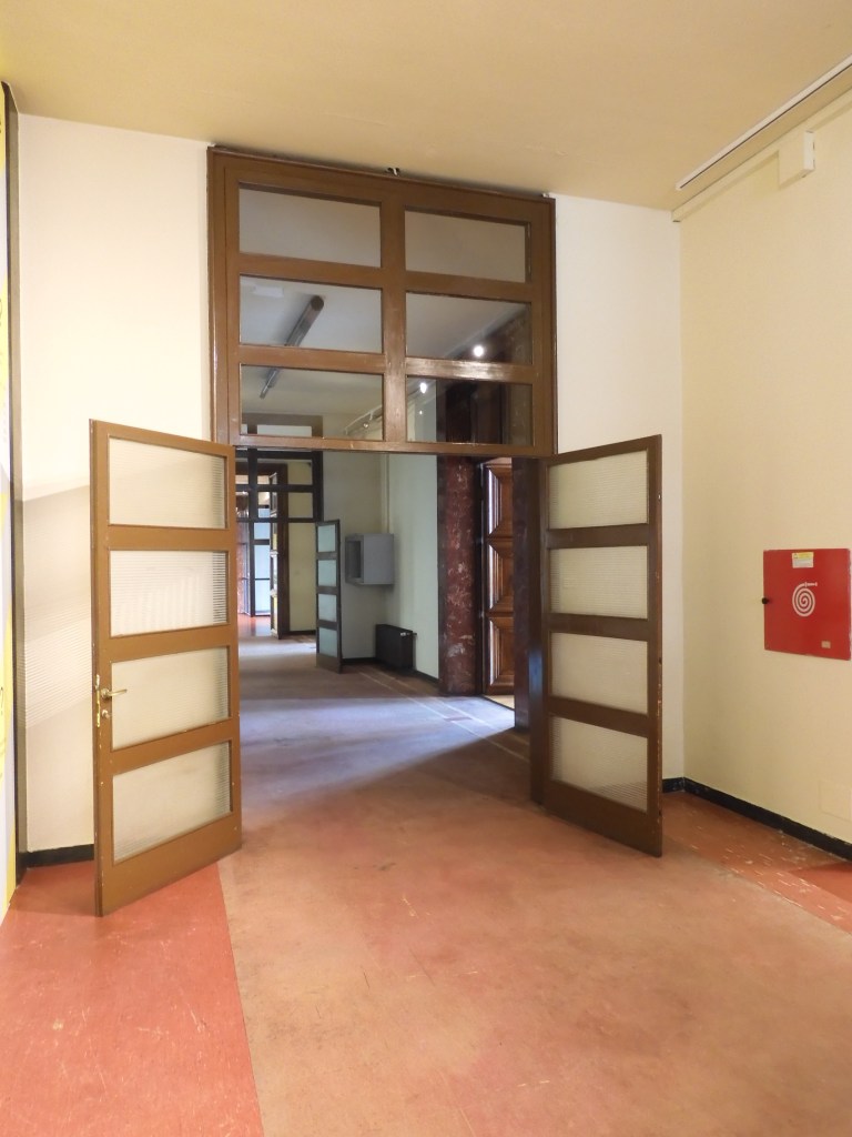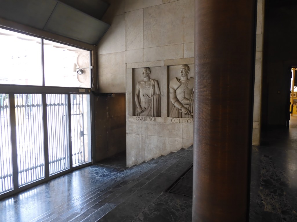 Sopra l’ampio ingresso profilato da una cornice con cassettoni circolari – motivo ripreso anche nella copertura del portico -, il prospetto è unito ai quattro pilastri centrali da una scala che collega il primo piano con la balconata per i discorsi pubblici, attrezzata con un podio mobile in rame. Superata la scala di accesso, decorata ai lati da sei bassorilievi di Edoardo Villa raffiguranti protagonisti della storia bergamasca, si entra nell’atrio monumentale, originariamente illuminato da vetrate e lucernario.