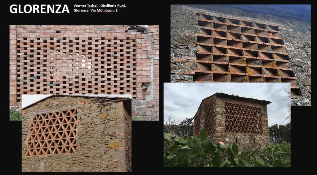 Come ad esempio, ha fatto Werner Tscholl, per il nuovo edificio della Distilleria PUNI (l’unica distilleria di whiskey in Italia), Glorenza, Via Mühlbach, 2. Progettata e costruita tra il 2010 ed il 2012. Un edificio cubico, rivestito come i vecchi fienili per l’essicazione del fieno. Dentro un cubo di cristallo, con gli uffici e gli spazi per la vendita. Sotto la parte produttiva e la cantina per l’invecchiamento del whisky. Un piccolo capolavoro, frutto di grande maestria del professionista altoatesino (http://www.werner-tscholl.com/new-constructions/puni-destillerie-glurns-2012/).