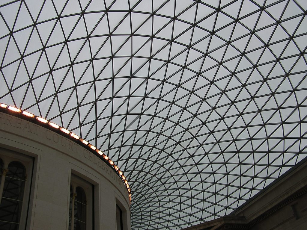 SOPRA – Dettagli Patio coperto del British Museum a Londra. Dal 2000 la luce inonda totalmente il nuovo spazio grazie all’immensa copertura di cristallo e acciaio (6000 metri quadrati di superficie e quasi 800 tonnellate). Il progetto di Norman Foster e Associati permette ai circa 5,5 milioni di visitatori annuali di muoversi più facilmente tra le gallerie del museo. Foster vinse il concorso, nel 1995, tra 132 professionisti. Liberando il patio e lasciando solo la sala lettura, il progetto crea grazie ad una copertura trasparente al di sopra dell’ambiente, una nuova “piazza” coperta. Senza lasciarsi intimidire dall’incarico Foster e gli ingegneri Buro Happold hanno dotato il museo di una volta di cristallo disposta come un rompicapo gigante. Per costruirlo sono stati necessari 3312 cristalli da 315 tonnellate e 478 tonnellate di acciaio.