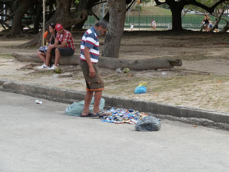 Quì sotto un raccoglitore di lattine di alluminio lungo una spiaggia a Rio
