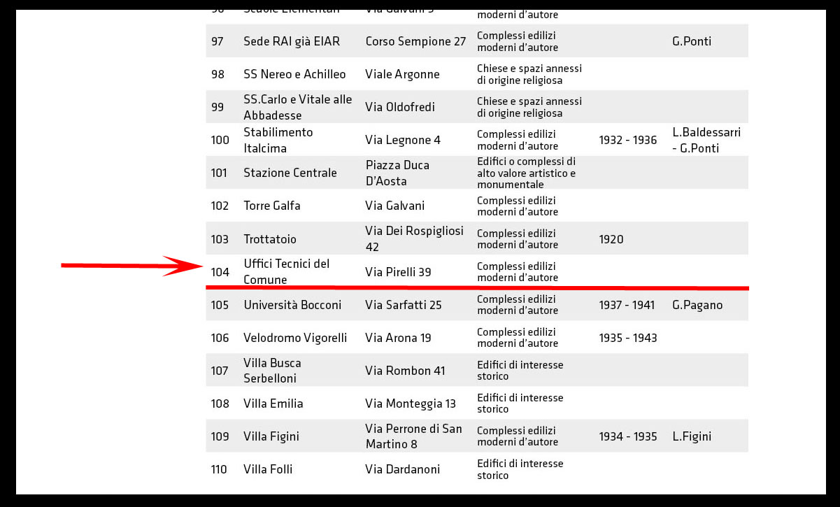 Poi una curiosità, nell’elenco degli edifici di “rilevanza civile, religiosa, storica e culturale”, (notevolmente ampliato) si nota che gli estensori del Piano, hanno “vincolato” anche l’edificio dell’Ufficio Tecnico comunale di via Pirelli 39. Probabilmente dovuto al fatto che l’edificio progettato da V. Gandolfi, R. Bazzoni, L. Fratino, costruito tra il 1955 ed il 1966, è di proprietà comunale ed è stato costruito più di 50 anni fa, cosa che ne impone un vincolo.