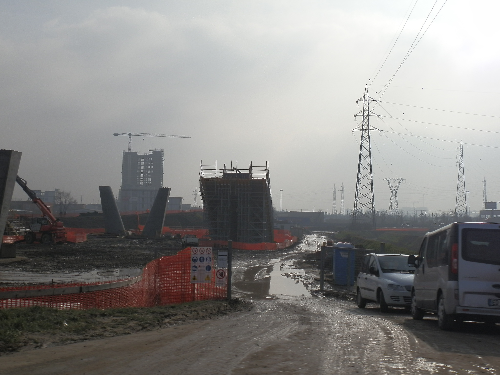 822 giorni all’alba (o forse, meglio, al tramonto) – Oggi 29 gennaio 2013, abbiamo eseguito l’ennesimo sopralluogo sul sito dove si stanno realizzando i “lentissimi” lavori per la realizzazione di Expo 2015. Il cantiere appare molto indietro, i lavori procedono come al rallentatore, mediante l’impiego di sparute maestranze, ed anche i mezzi meccanici utilizzati sembrano pochi. Le reti aeree sono ancora tutte da rimuovere, ed anche la viabilità interna all’area è ancora operativa, come lo sono le intense attività di prostituzione femminile, da sempre cifra stilistica dell’area.