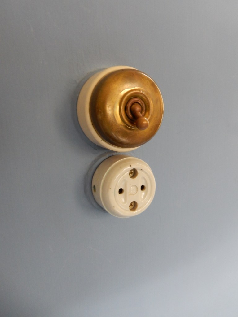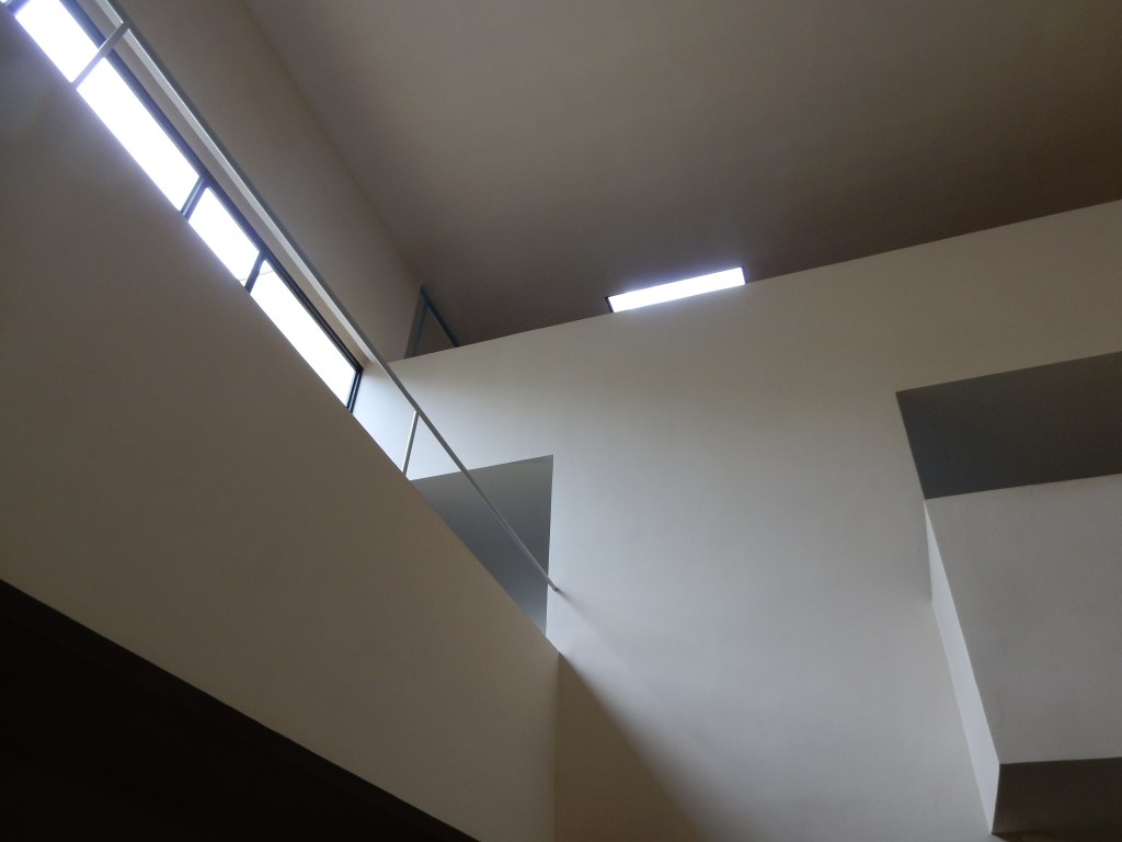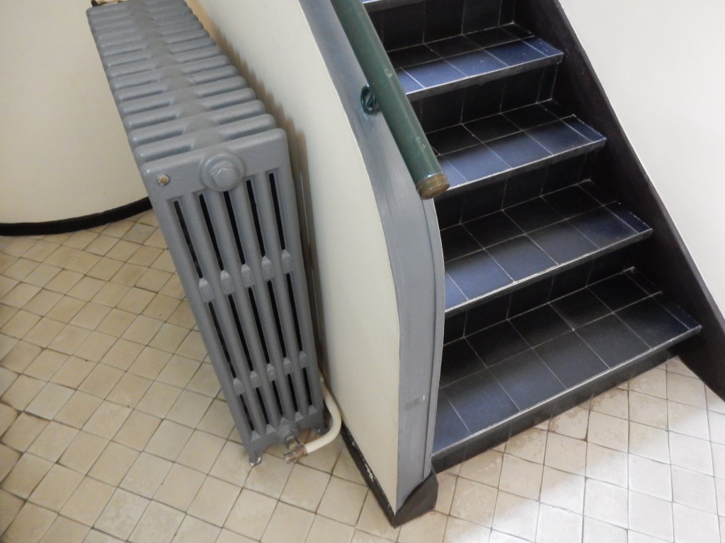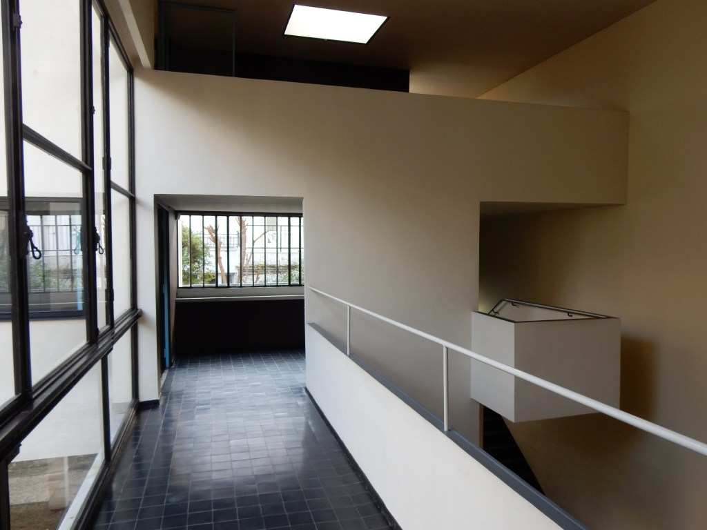 In cima alla scala esterna, al piano primo (ed unico), si trova l’ingresso della casa “Existenzminimum”, che ha una porticina d’ingresso lignea, verniciata di grigio, con maniglia di ottone, e soprastante piccola pensilina in beton.