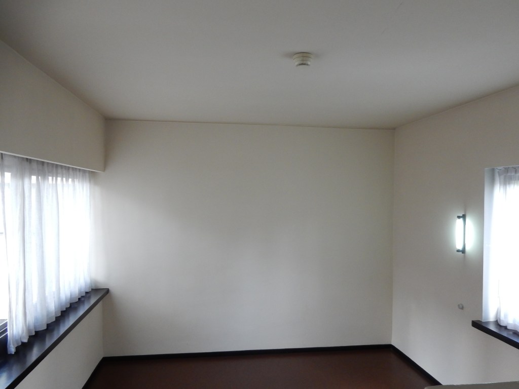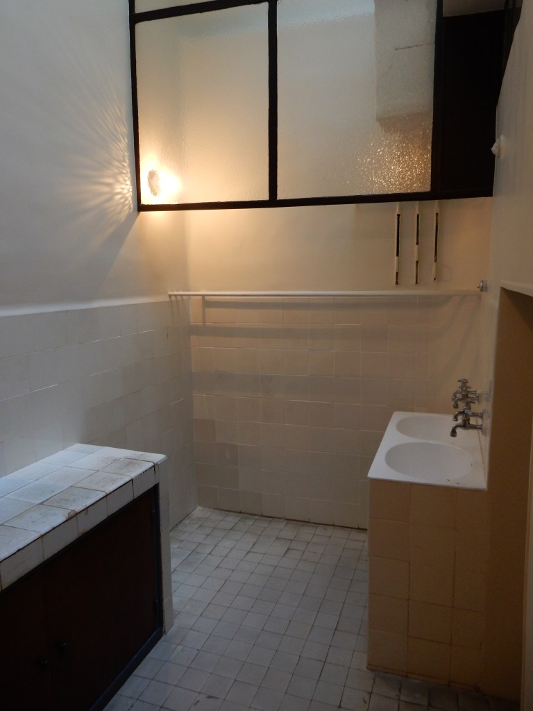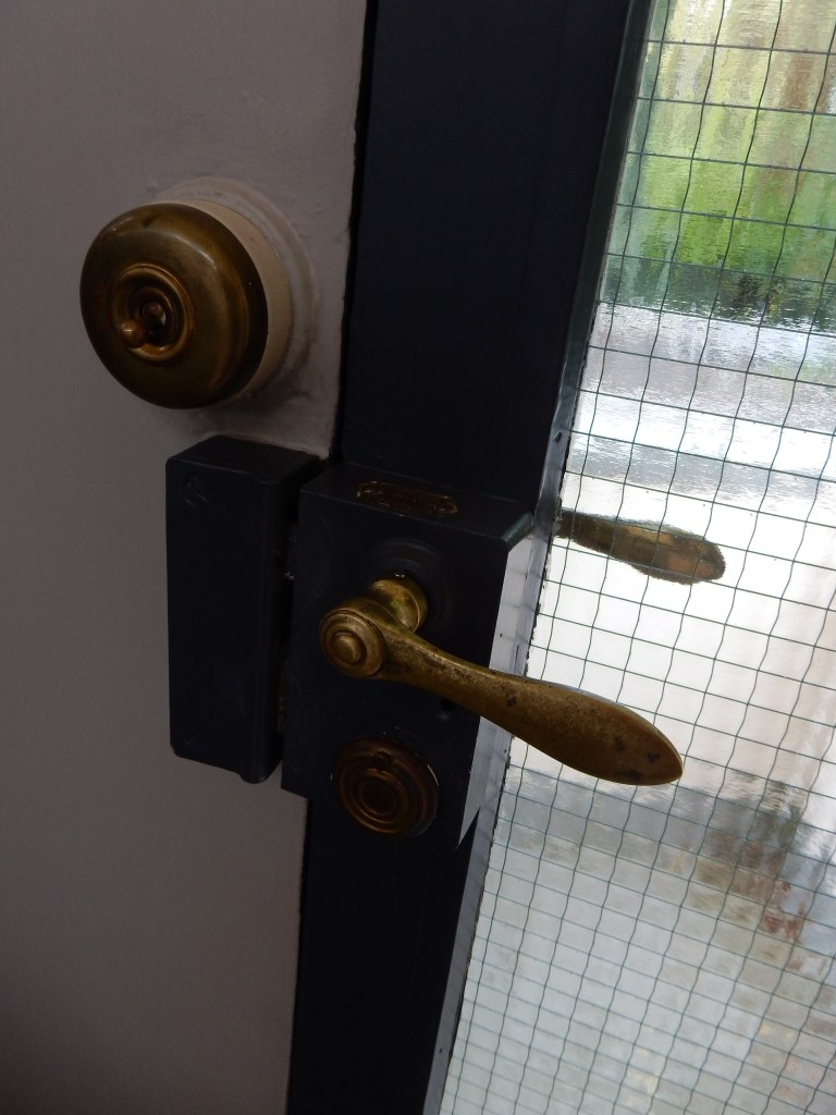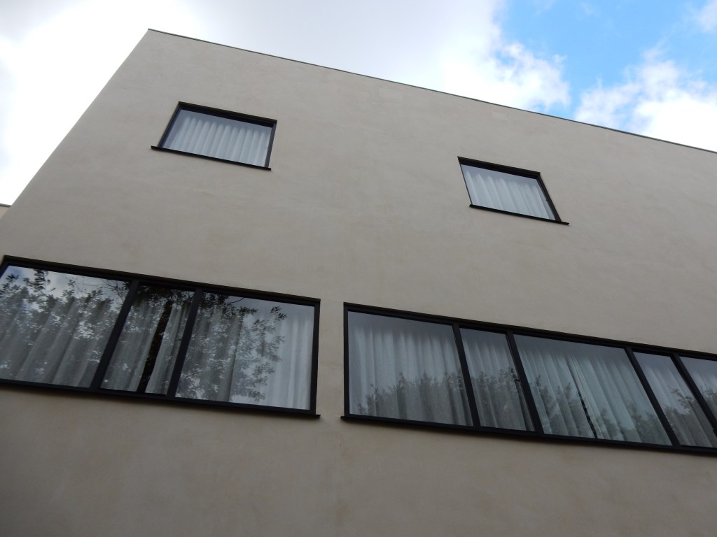 In cima alla scala esterna, al piano primo (ed unico), si trova l’ingresso della casa “Existenzminimum”, che ha una porticina d’ingresso lignea, verniciata di grigio, con maniglia di ottone, e soprastante piccola pensilina in beton.
