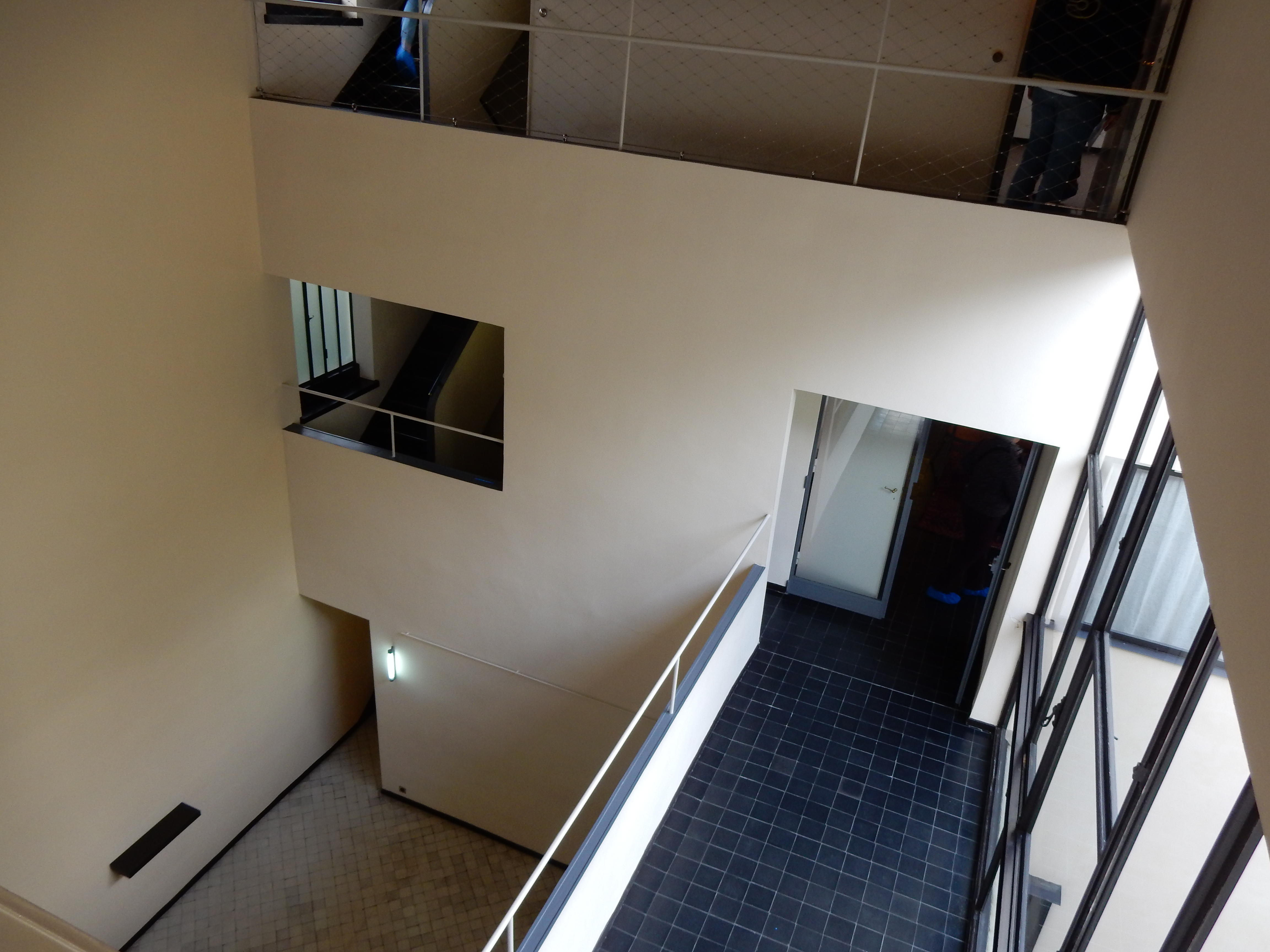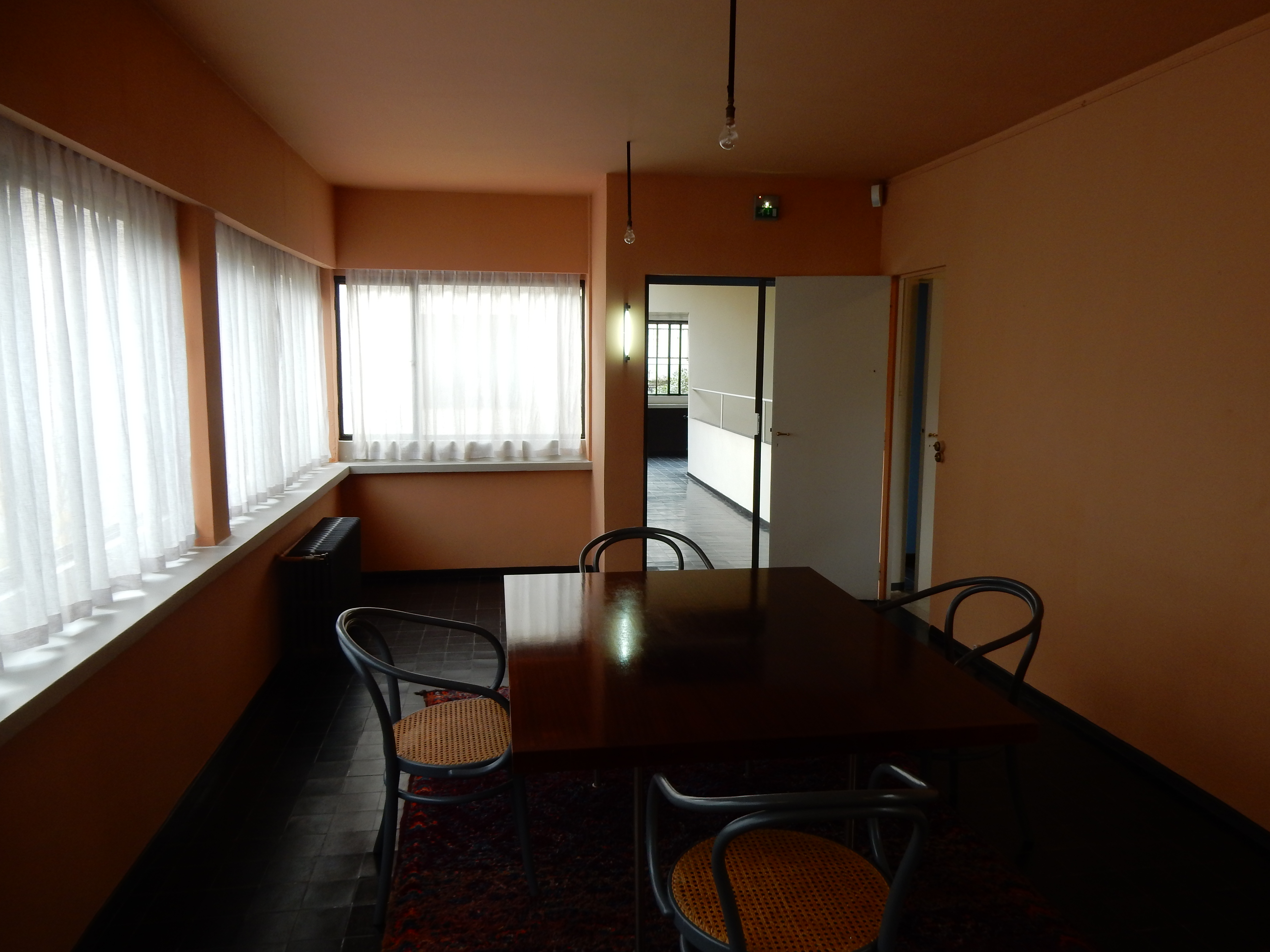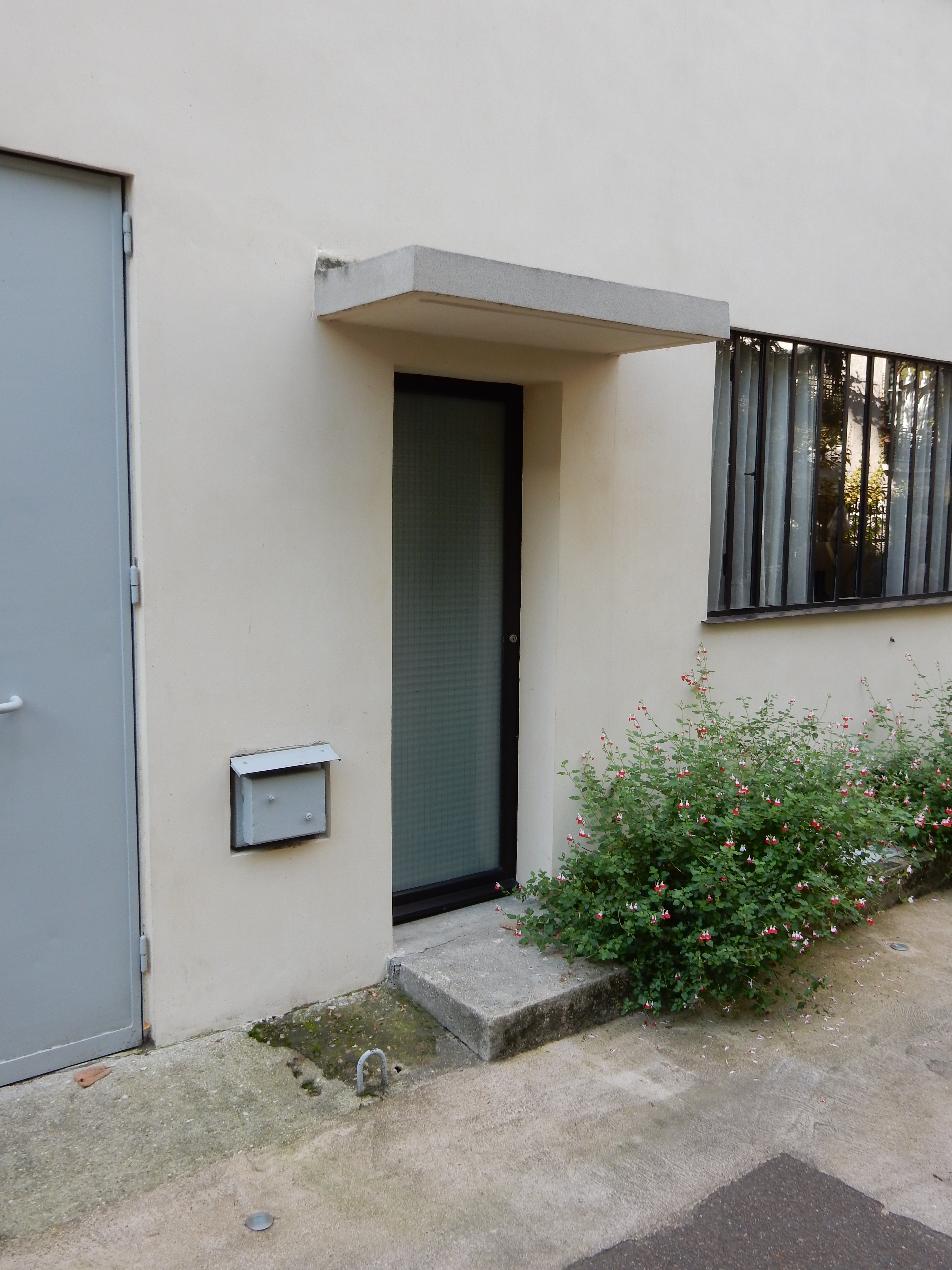 In cima alla scala esterna, al piano primo (ed unico), si trova l’ingresso della casa “Existenzminimum”, che ha una porticina d’ingresso lignea, verniciata di grigio, con maniglia di ottone, e soprastante piccola pensilina in beton.