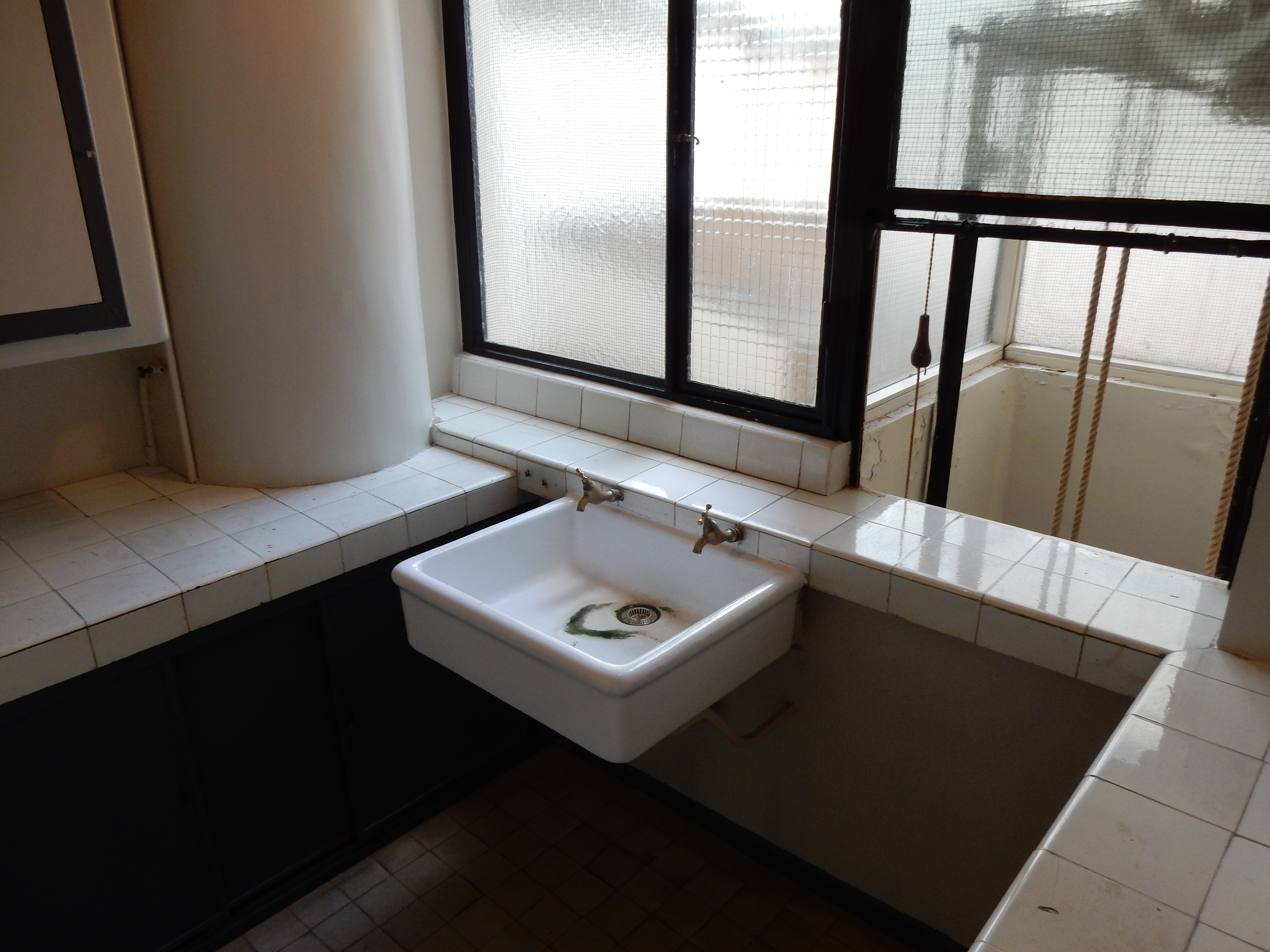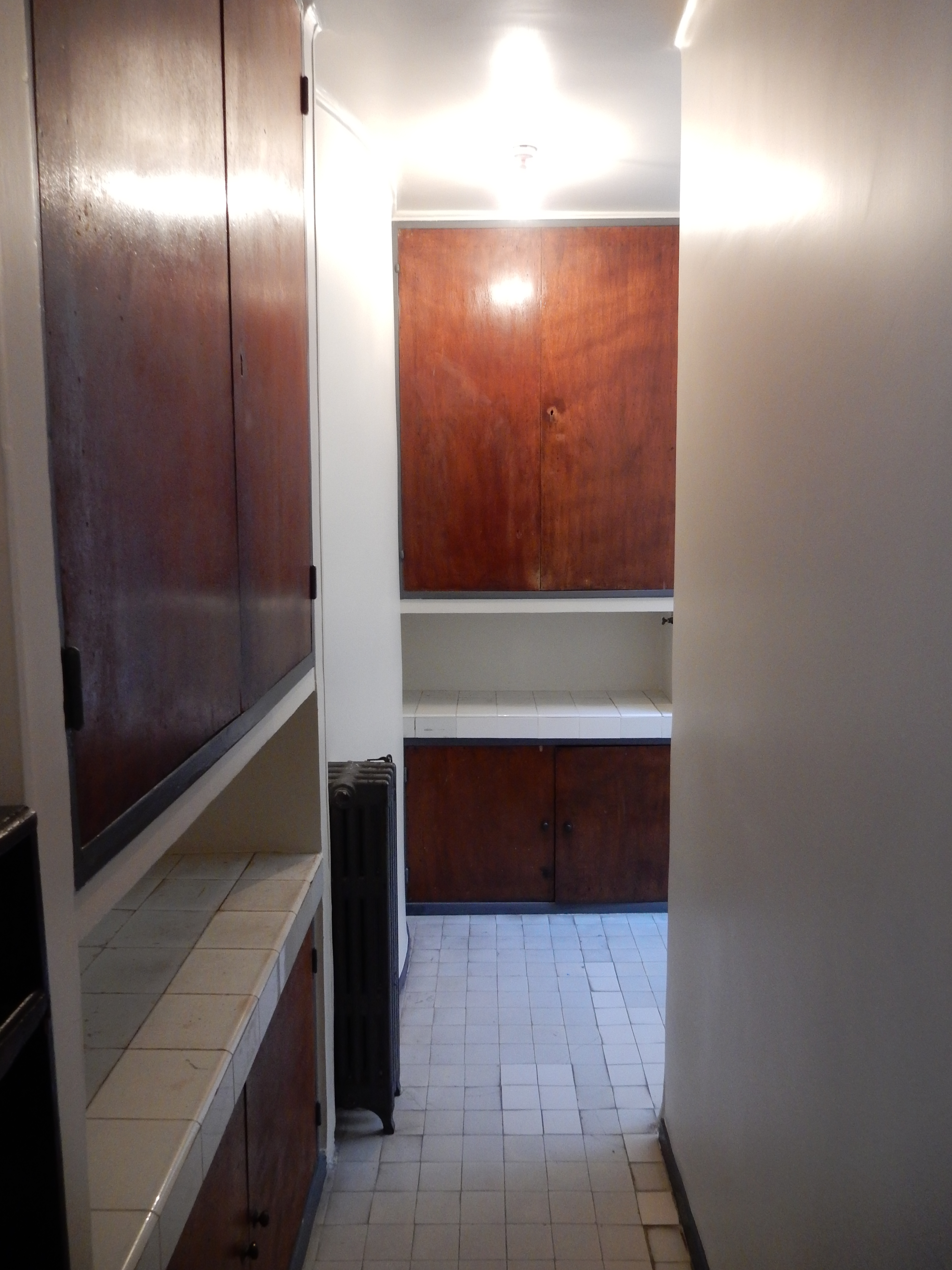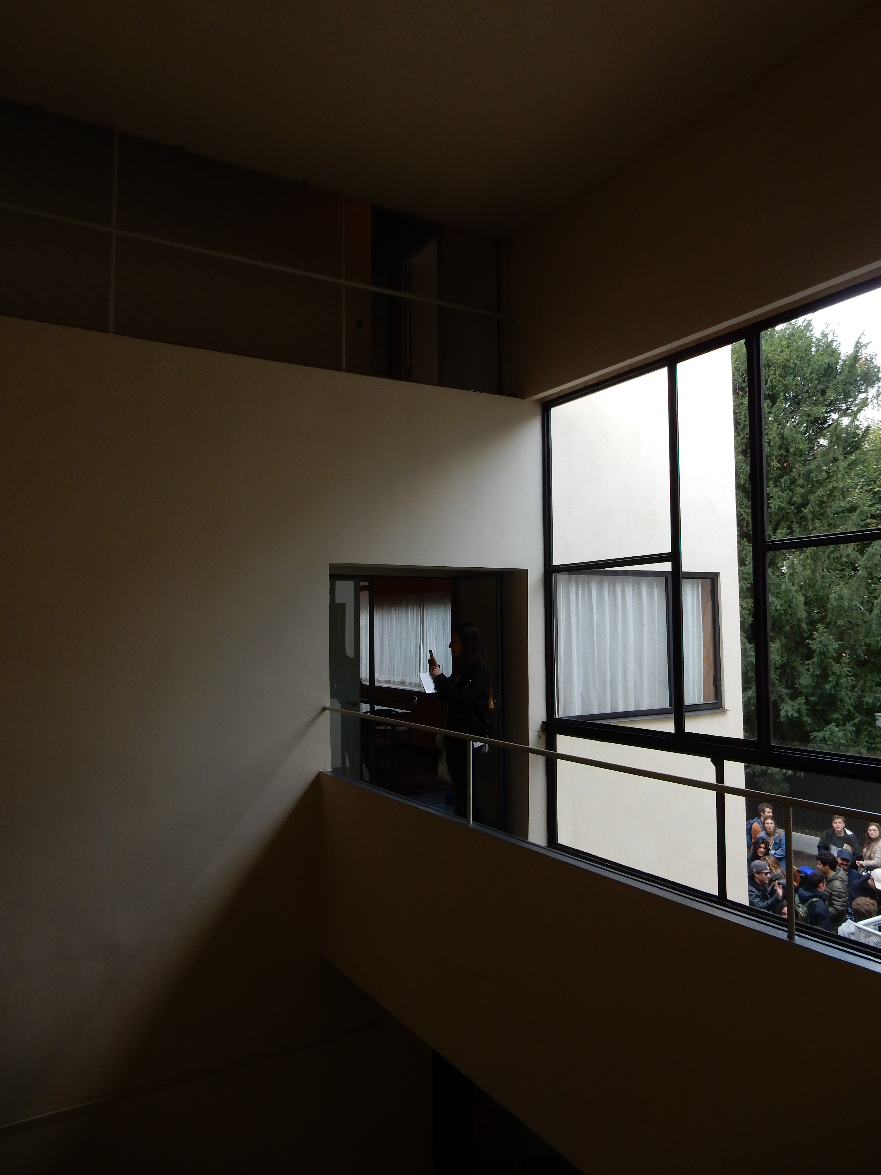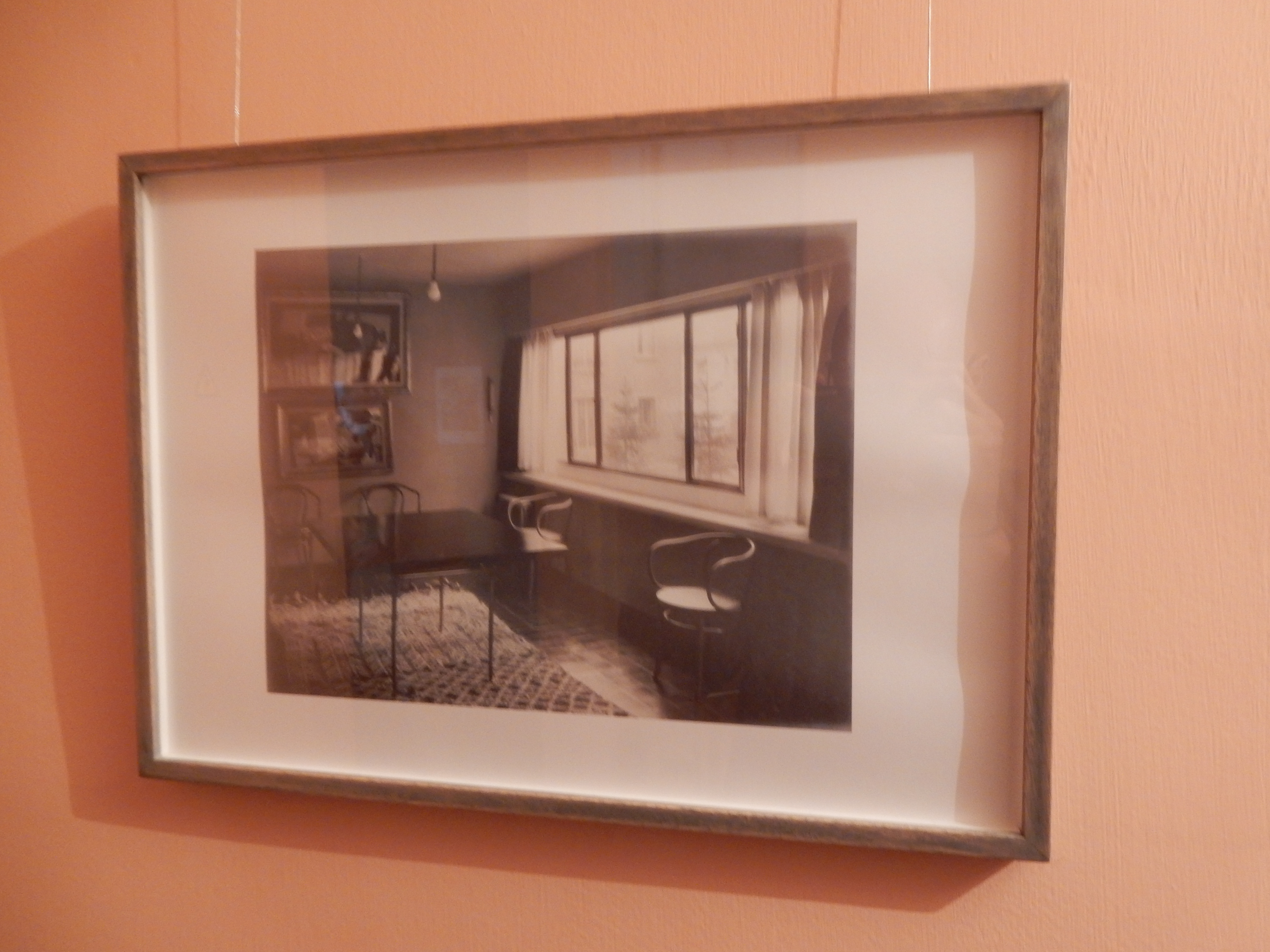 In cima alla scala esterna, al piano primo (ed unico), si trova l’ingresso della casa “Existenzminimum”, che ha una porticina d’ingresso lignea, verniciata di grigio, con maniglia di ottone, e soprastante piccola pensilina in beton.