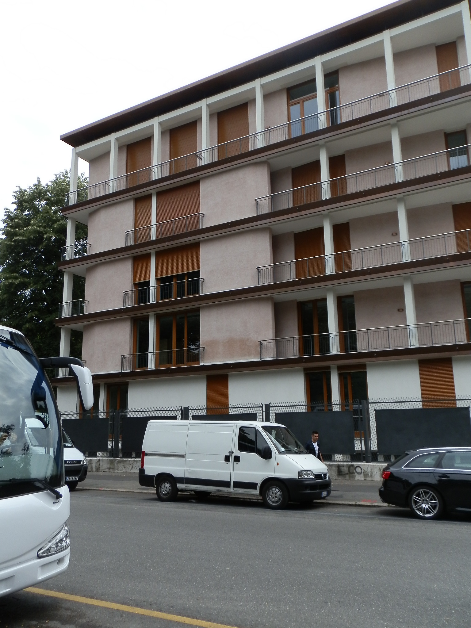 Fosse solo questo, ma all’occhio dell’osservatore attento le incongruenze sono parecchie: le tapparelle sono state realizzate con elementi dimensionalmente molto più grandi di quelle originali; lo stesso vale per le sezioni dei profili dei serramenti; le lattonerie sono smaccatamente con angoli di apertura diversi; Il vetro cemento del blocco scale sembra non adeguato; le lampade dei balconi in rame avulse dall’architettura storica; le prolunghe in inox per mettere a norma i parapetti; la recinzione, un muro di nascondimento rispetto alla trasparenza voluta dal Gardella; gli intonaci rosati hanno l’effetto “nuvolato” pizzeria che non avevano nel progetto originale; ecc..